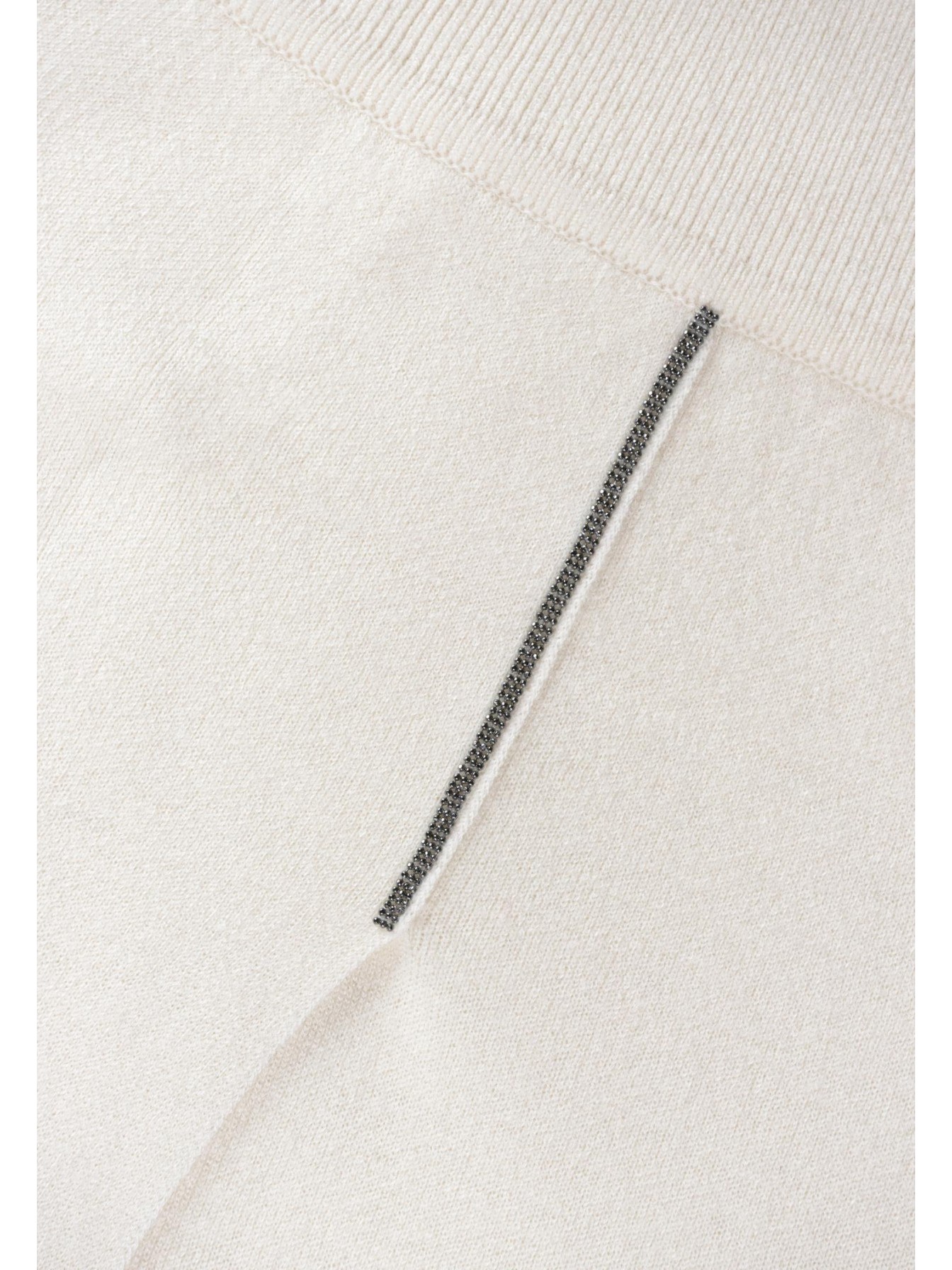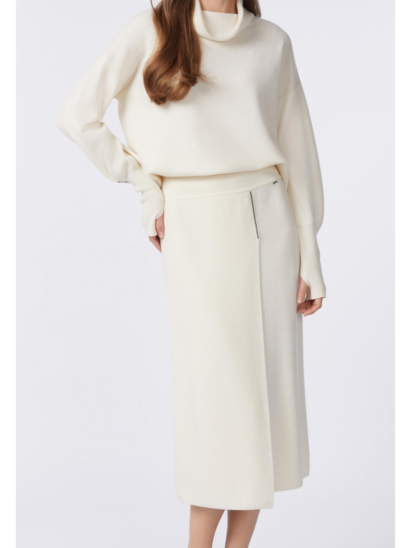 Юбка прямого кроя из трикотажа интерлок. Широкий пояс из мягкой вязаной резинки. Длина чуть ниже уровня колен. Спереди дополнительное запахивающееся полотнище. Край запаха сверху закреплен металлизированной тесьмой (ручная работа). Низ изделия выполнен по технике бесшовного края, без отстрочки.