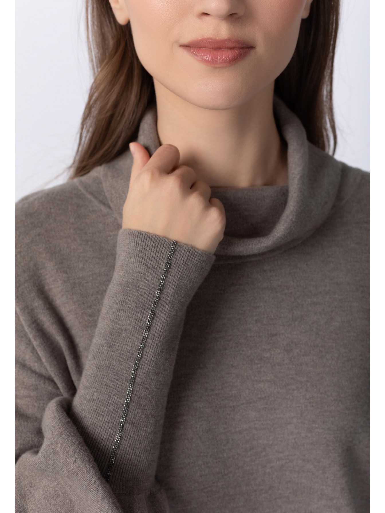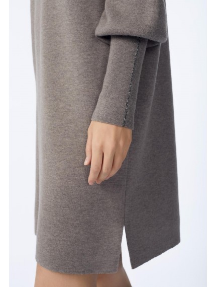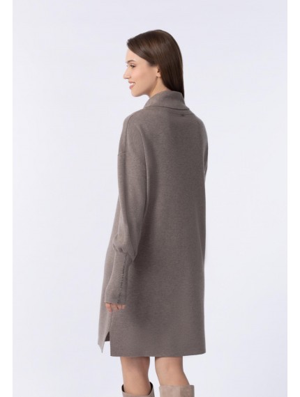Платье-туника прямого кроя из трикотажа интерлок. Длина чуть выше уровня колен. Воротник-хомут с отворотом. Рукава-фонарик. Высокие манжеты с отверстием под большой палец. Манжета с металлизированной тесьмой (ручная работа). Низ изделия выполнен по технике бесшовного края, без отстрочки.