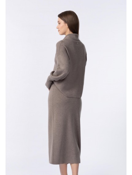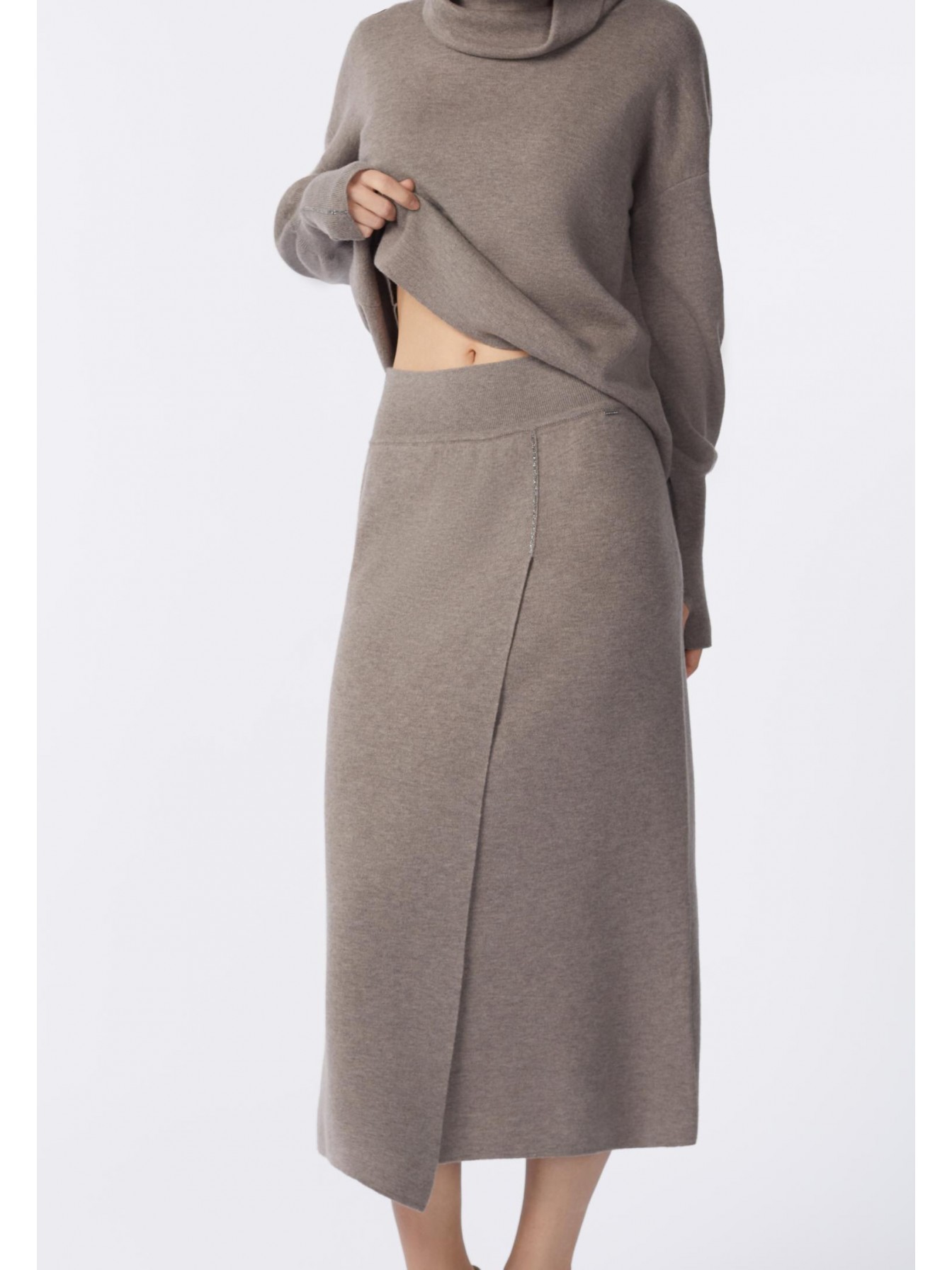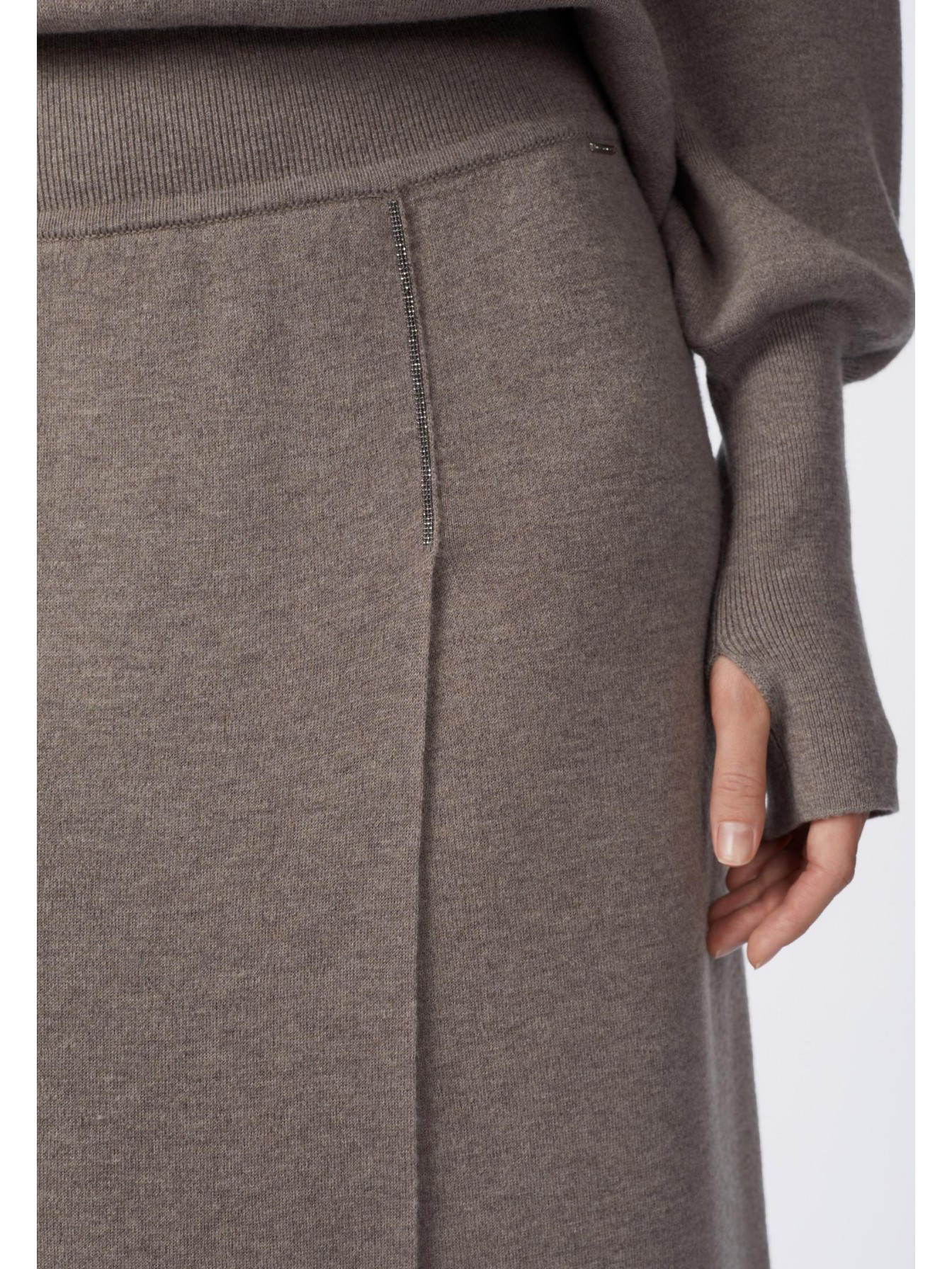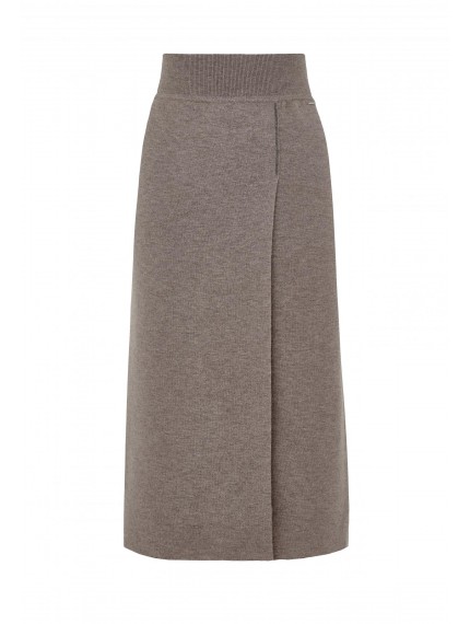 Юбка прямого кроя из трикотажа интерлок. Широкий пояс из мягкой вязаной резинки. Длина чуть ниже уровня колен. Спереди дополнительное запахивающееся полотнище. Край запаха сверху закреплен металлизированной тесьмой (ручная работа). Низ изделия выполнен по технике бесшовного края, без отстрочки.