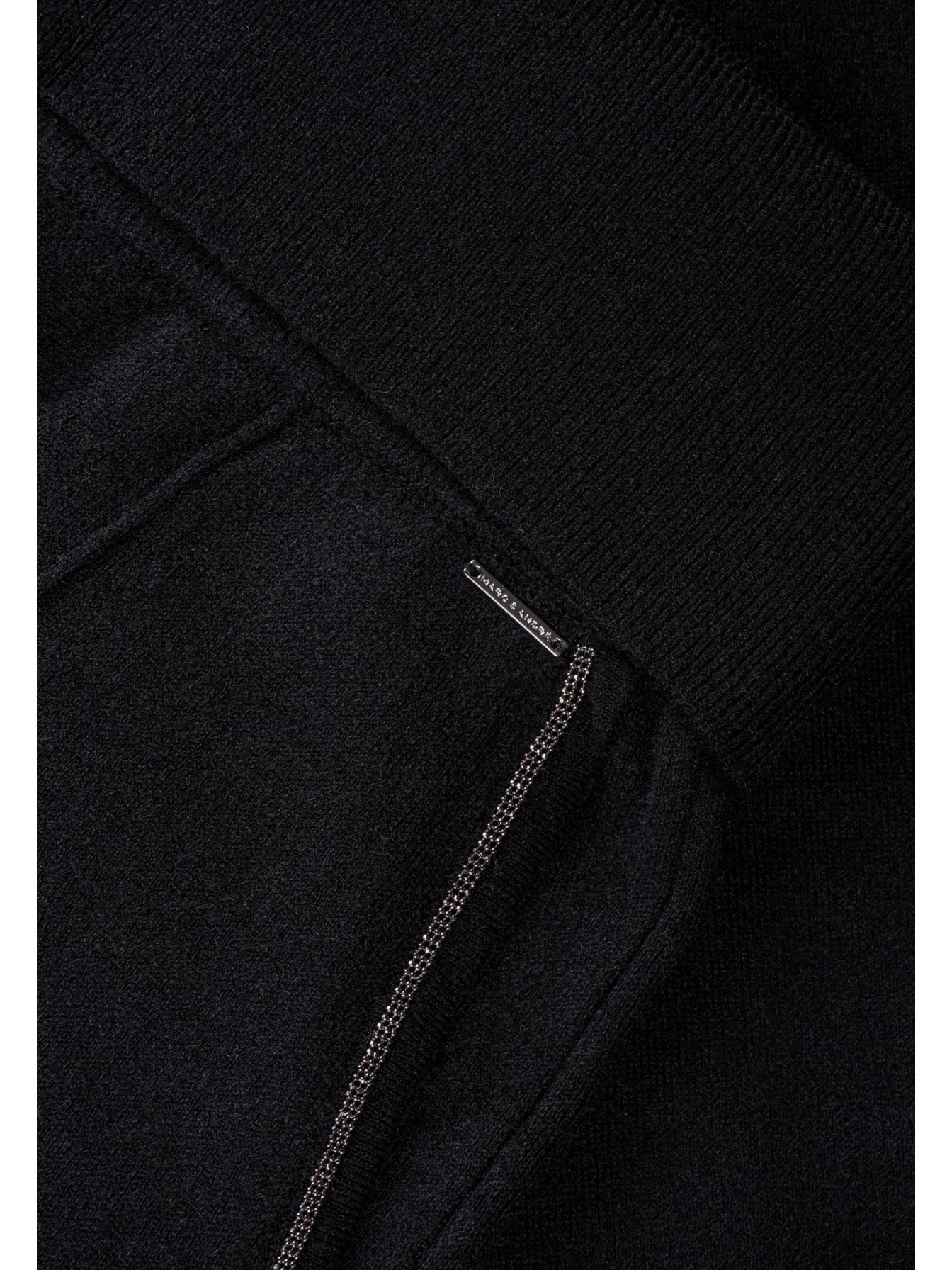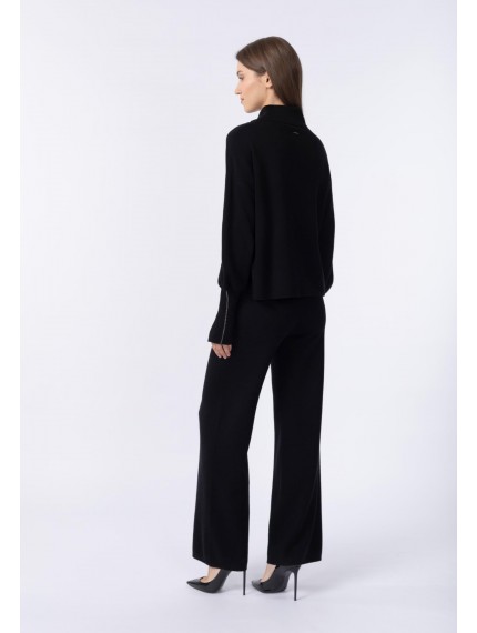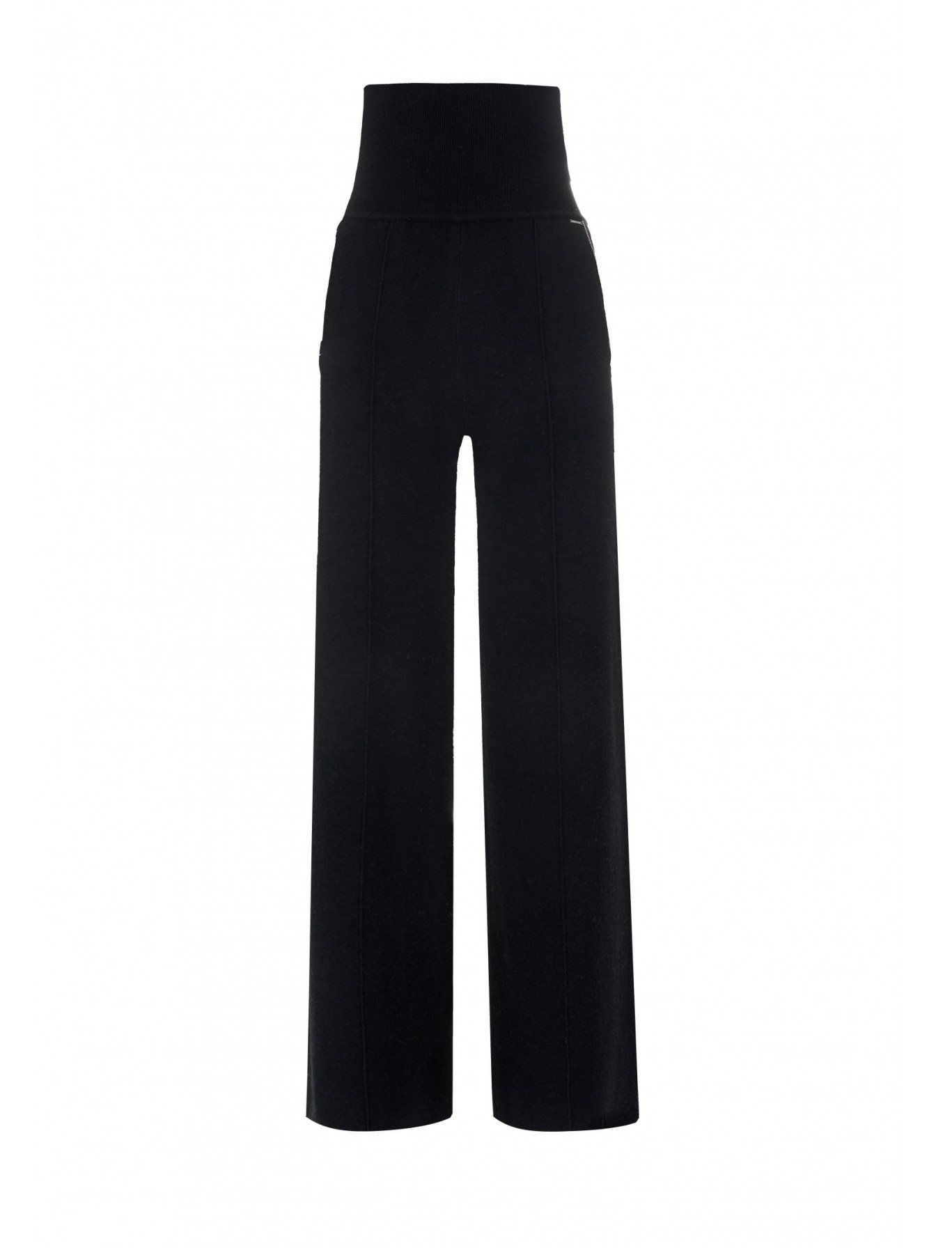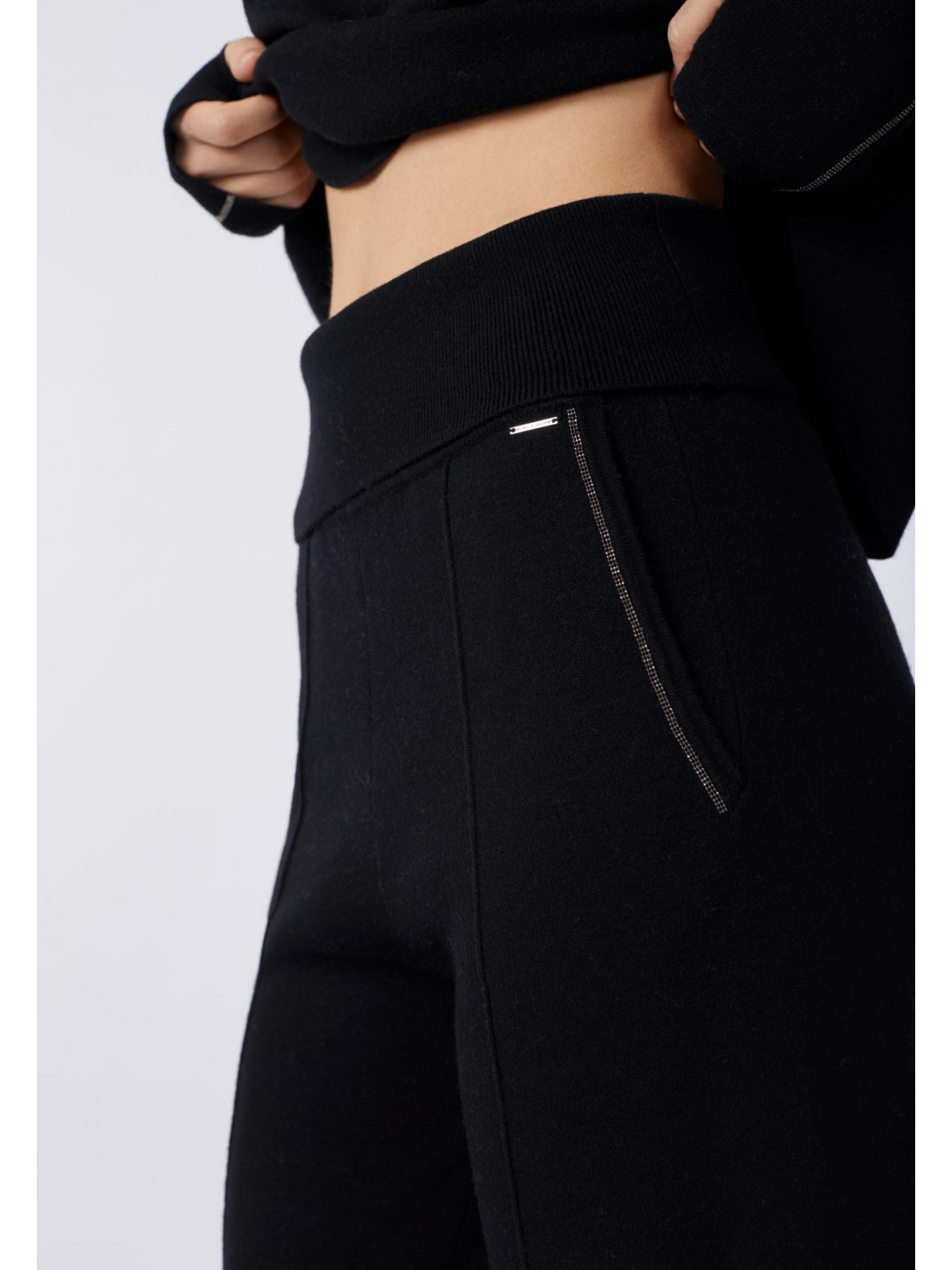 Брюки свободного кроя с из трикотажа интерлок. Высота посадки регулируется за счет широкого пояса-отворота из вязаной резинки. Стрелки на передних деталях отстрочены. Боковые карманы украшены металлизированной тесьмой (ручная работа). Низ брюк выполнен по технике бесшовного края, без отстрочки.