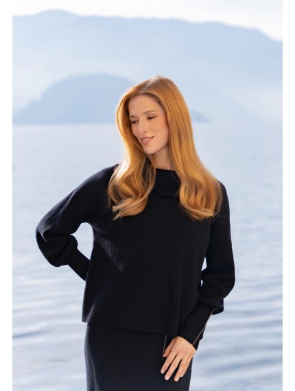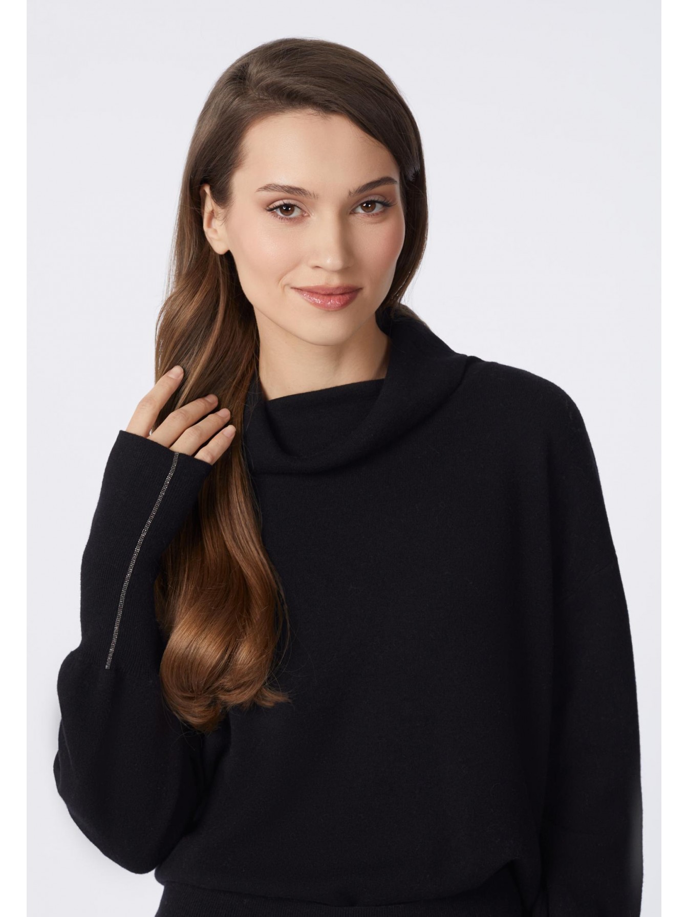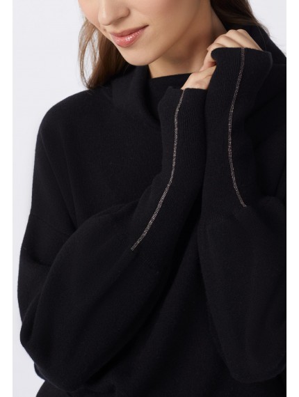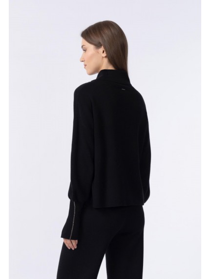 короченный джемпер свободного кроя из двуслойного трикотажа интерлок. Воротник-хомут с отворотом. Рукава с напуском. Высокие манжеты с отверстием под большой палец. Манжета украшена металлизированной тесьмой (ручная работа). Низ изделия выполнен по технике бесшовного края, без отстрочки.