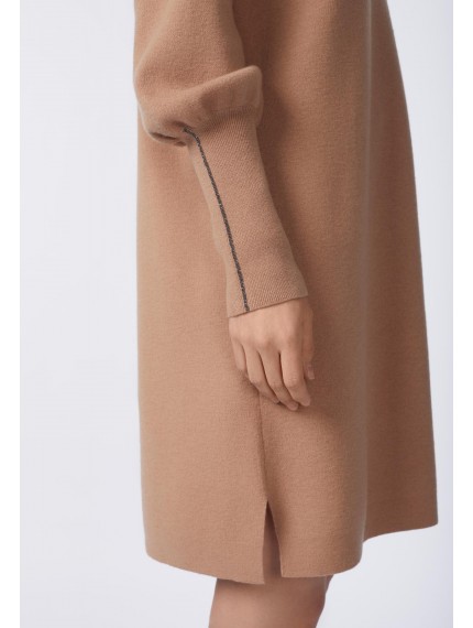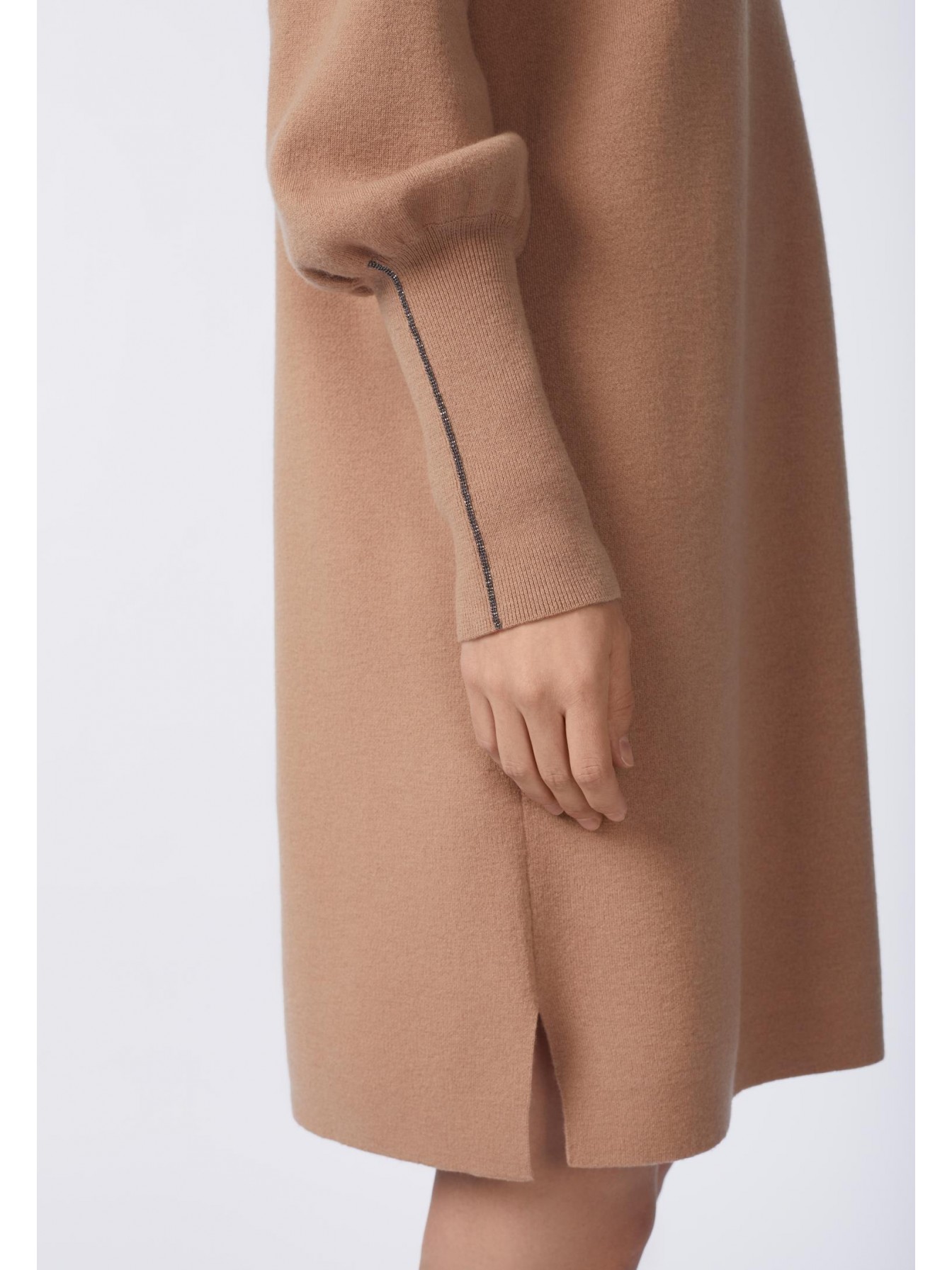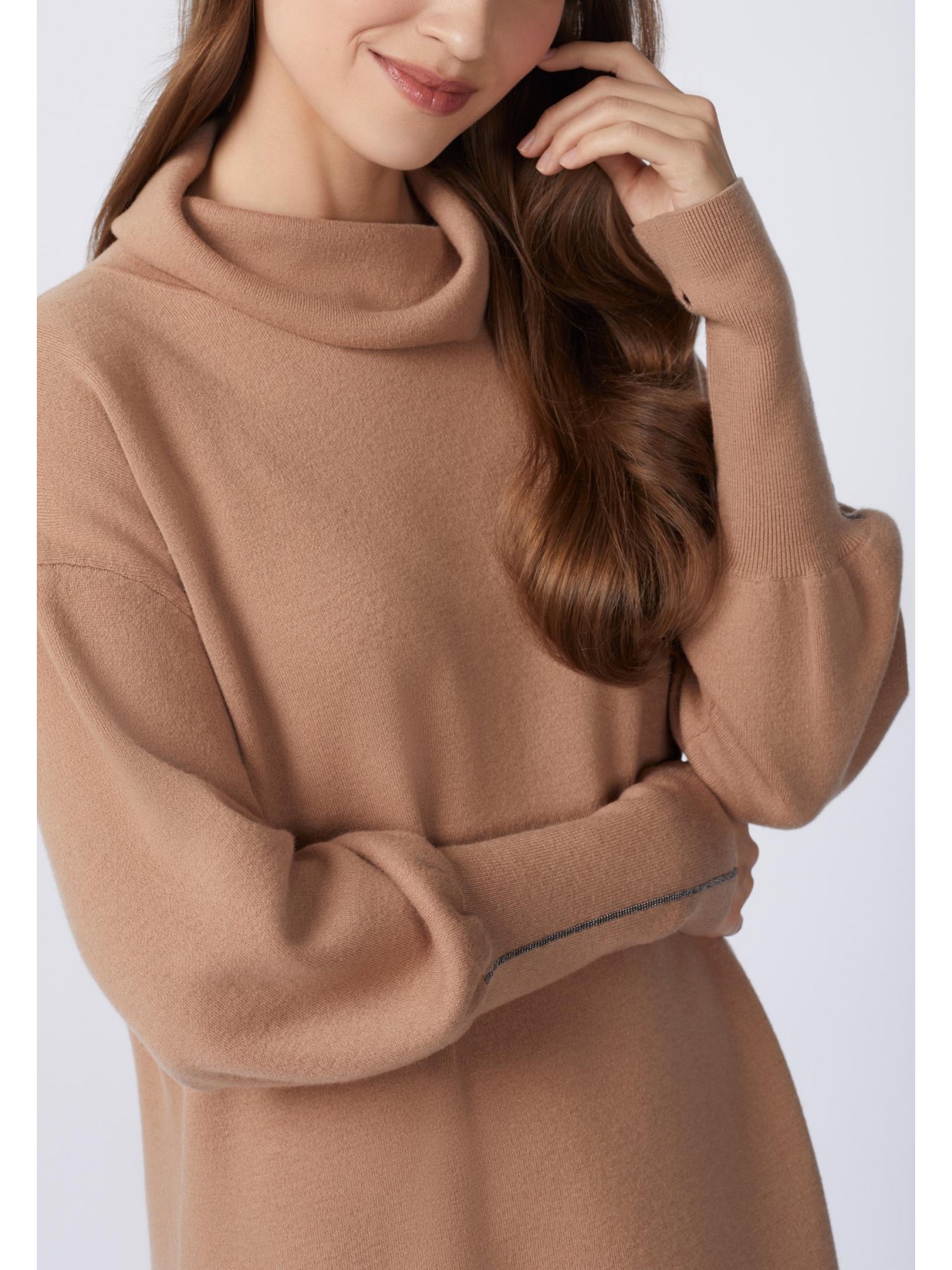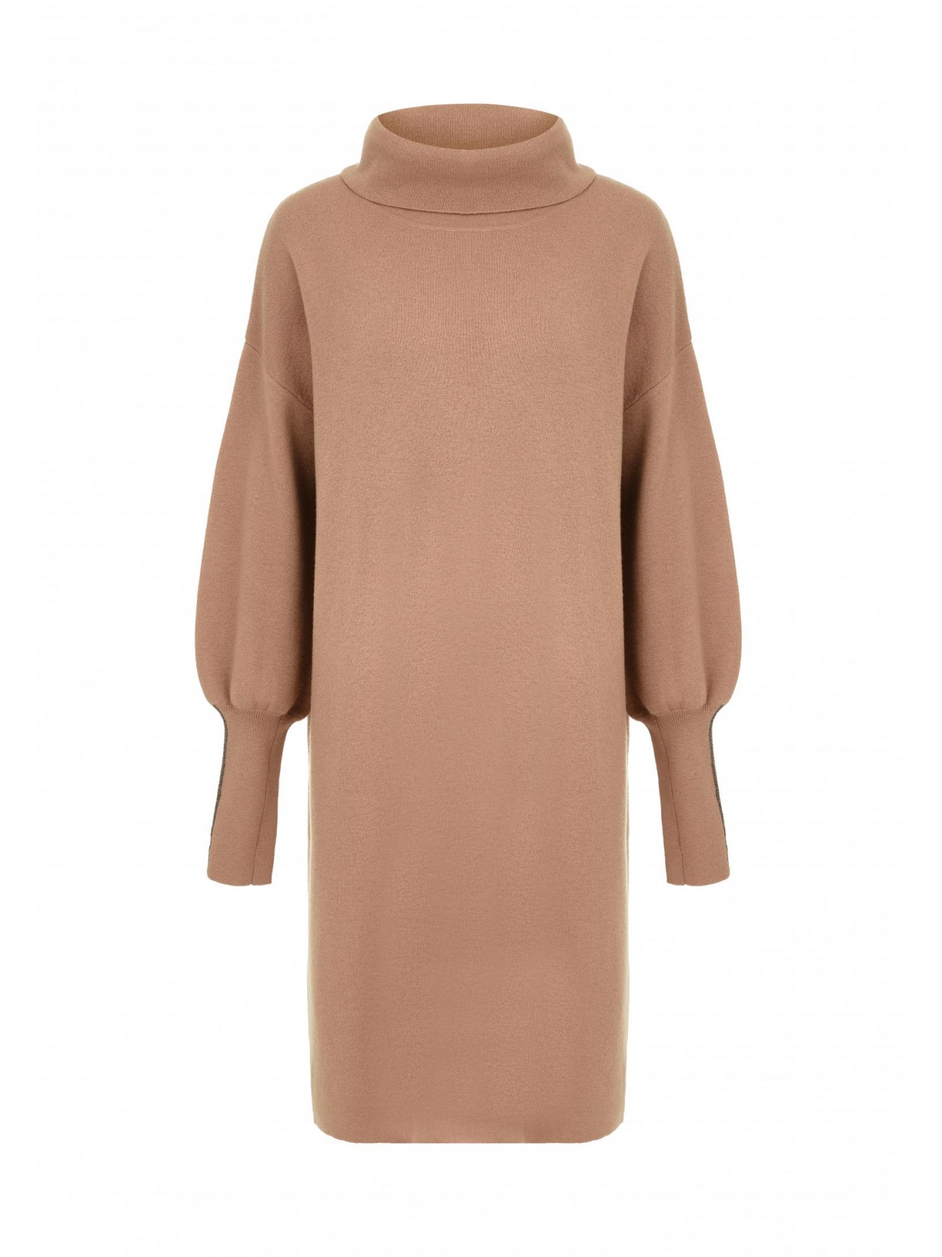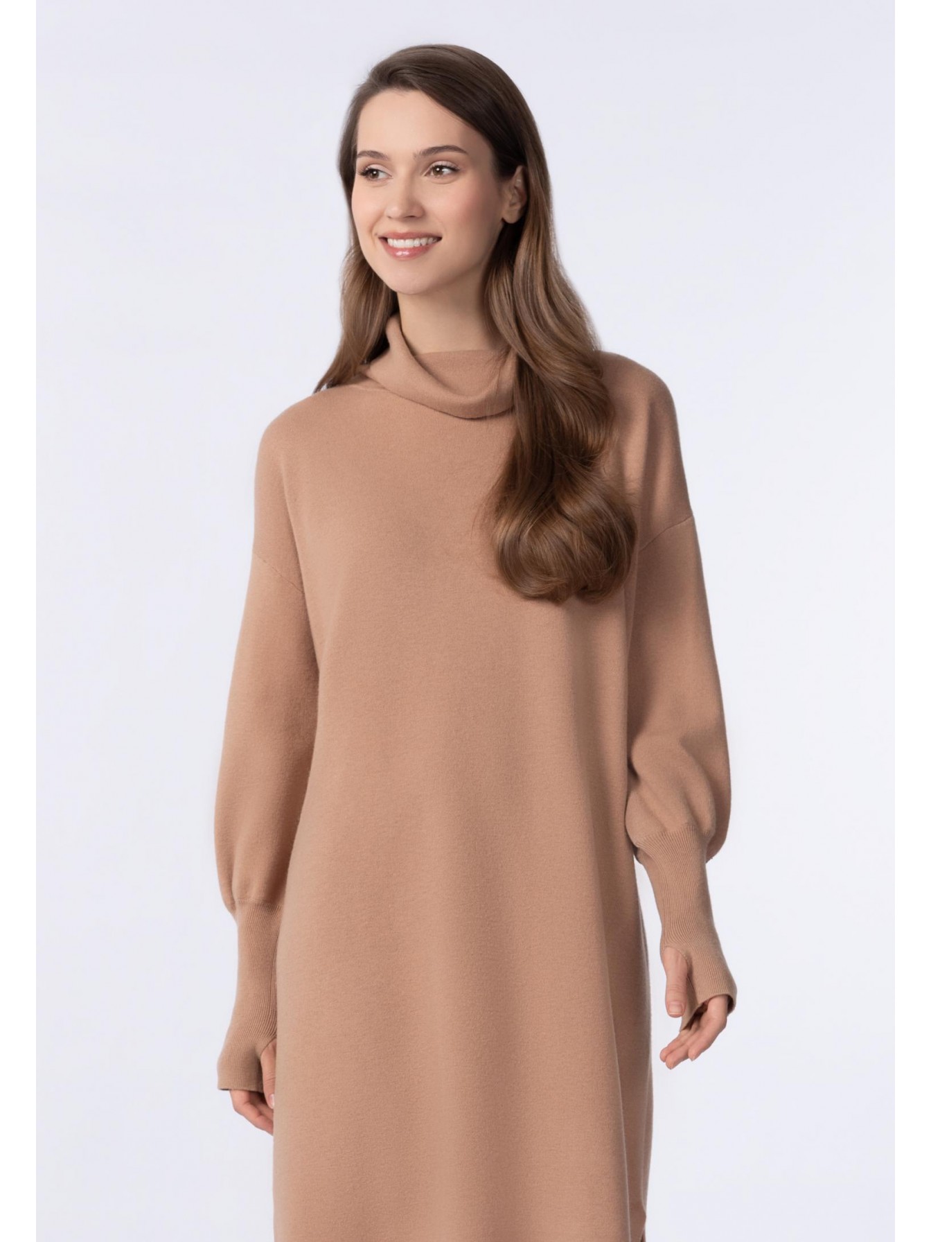 Платье-туника прямого кроя из трикотажа интерлок. Длина чуть выше уровня колен. Воротник-хомут с отворотом. Рукава-фонарик. Высокие манжеты с отверстием под большой палец. Манжета с металлизированной тесьмой (ручная работа). Низ изделия выполнен по технике бесшовного края, без отстрочки.