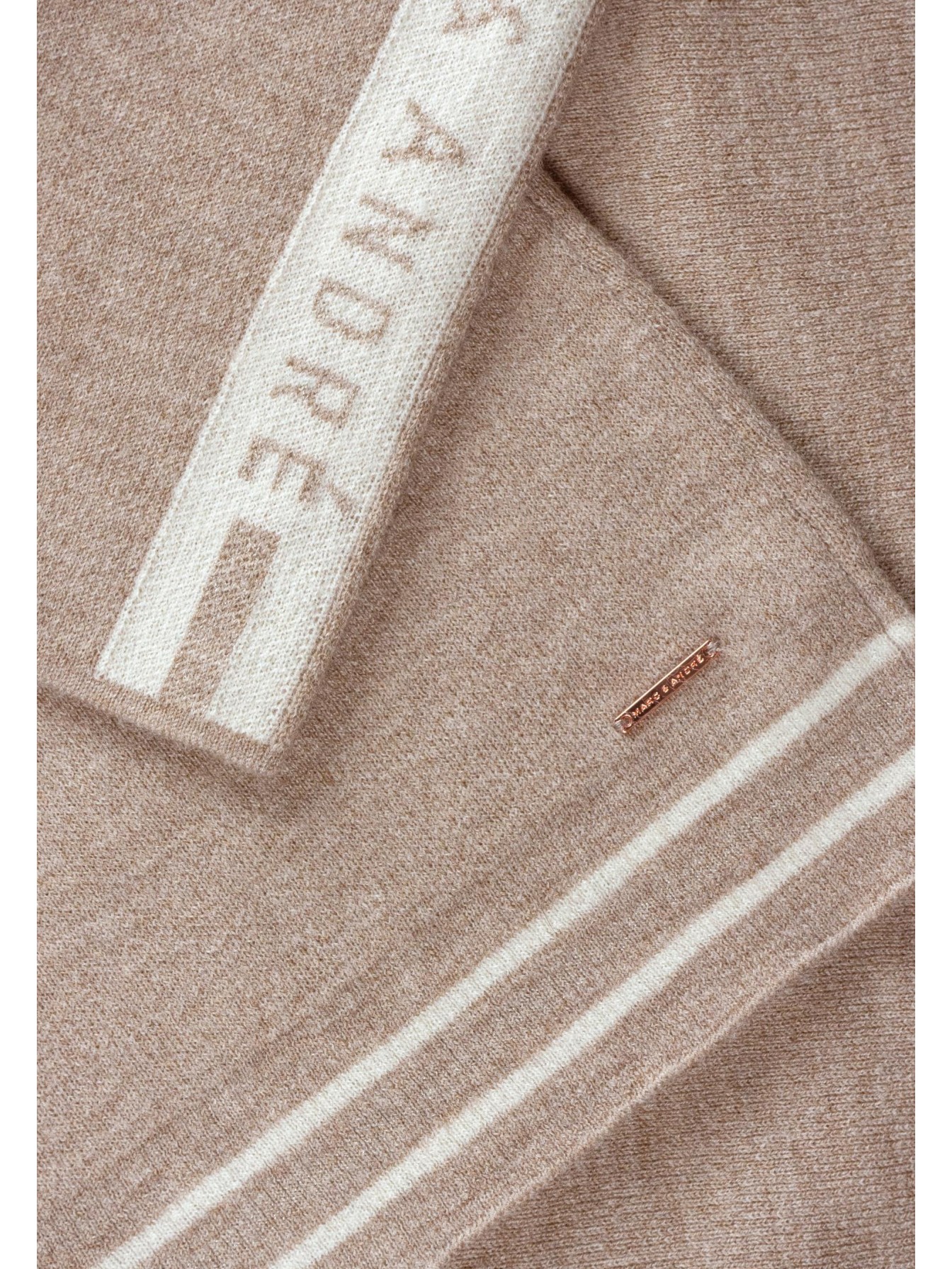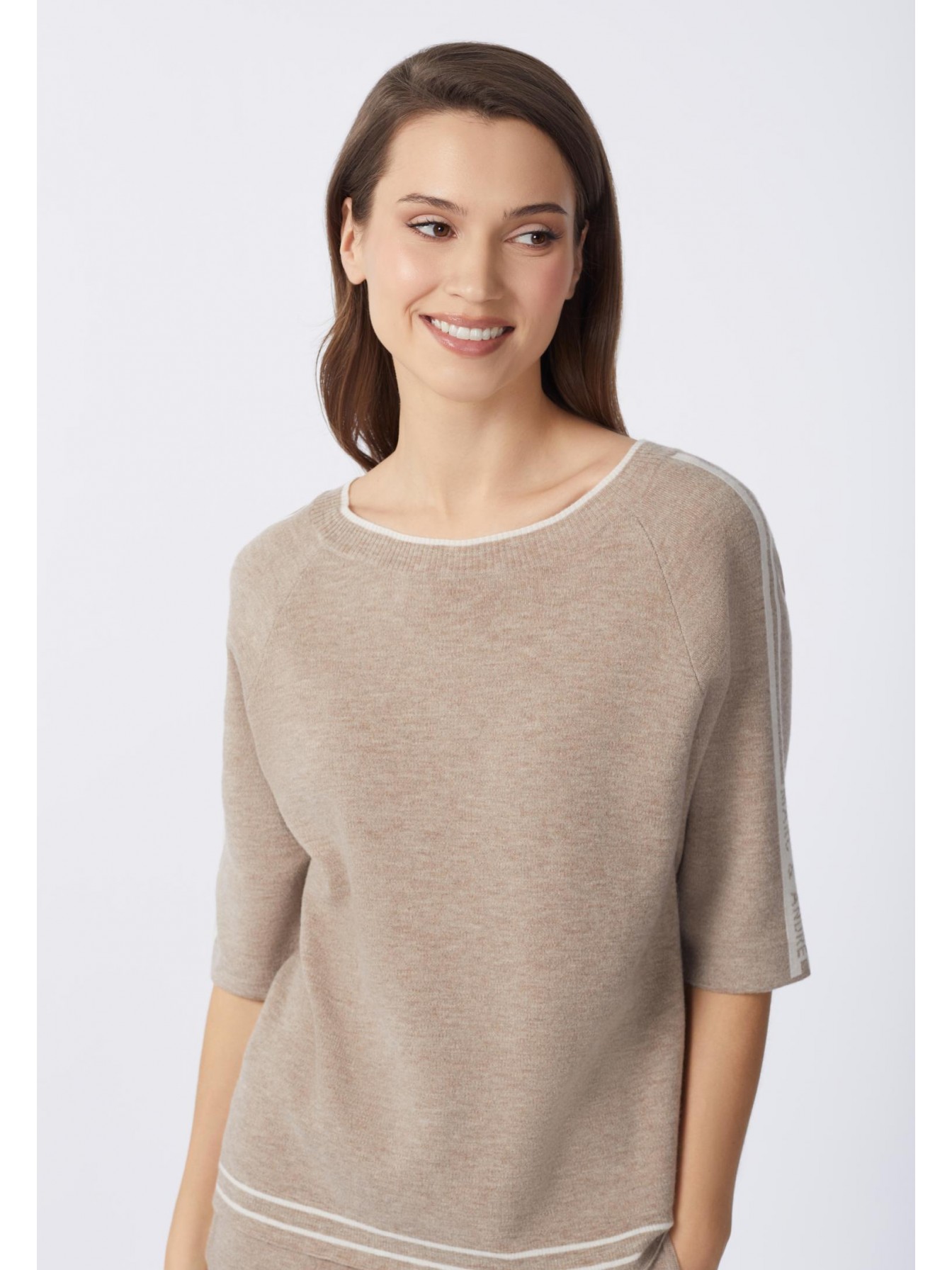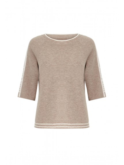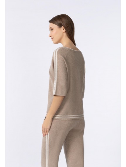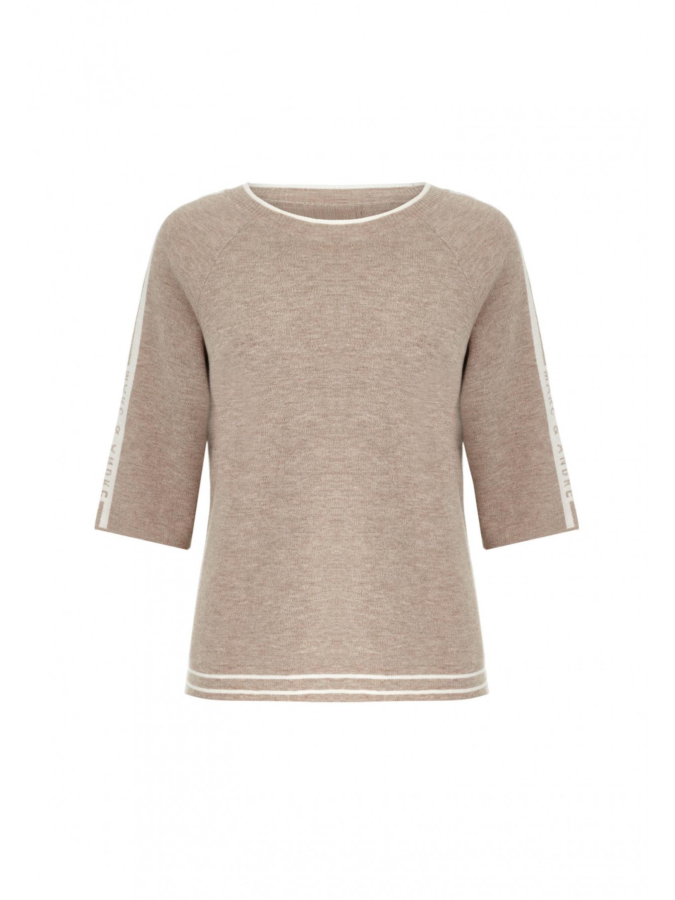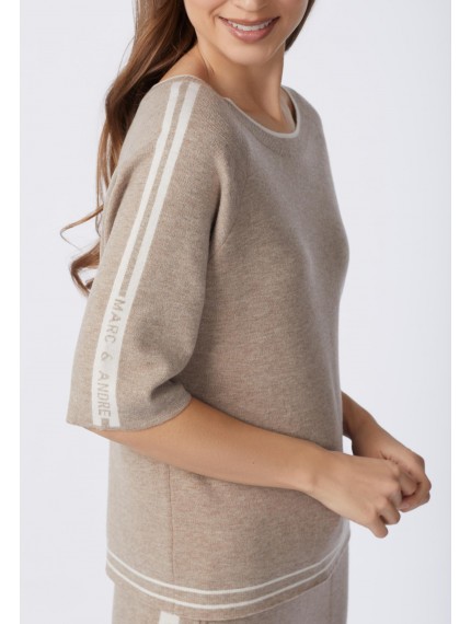 Джемпер с круглым вырезом горловины. Длина до середины бедра. Длина рукава 3/4. Контрастная окантовка по нижнему краю изделия и по горловине. Отделка контрастной полосой с логотипом Marc & André с использованием блестящей нити по средней линии рукава.