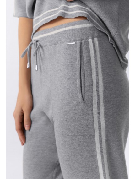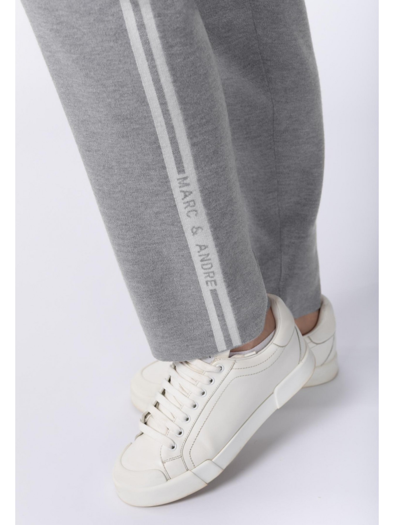 Брюки свободного прямого кроя. Пояс на резинке со шнуром. Боковые карманы. Контрастная отделка на поясе. По бокам отделка контрастной полосой с логотипом Marc & André с использованием блестящей нити.
