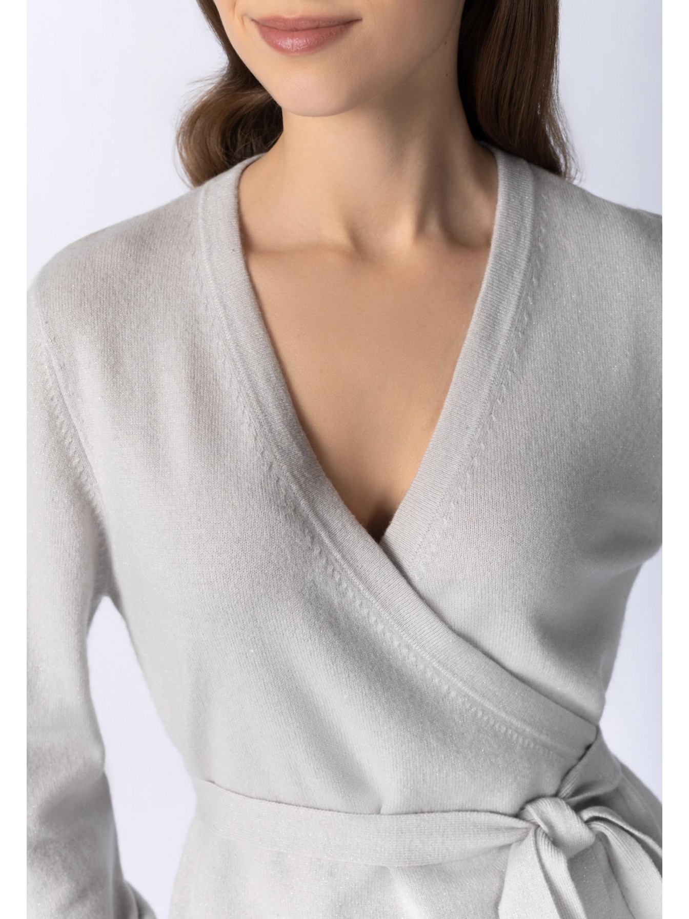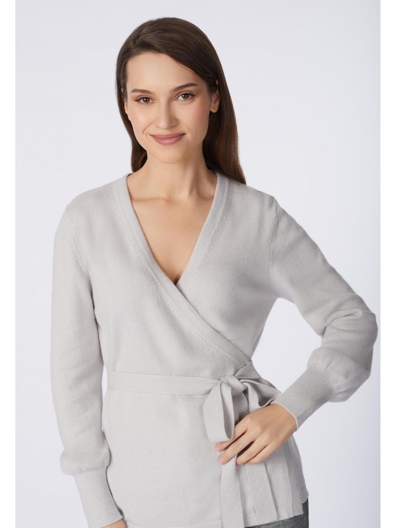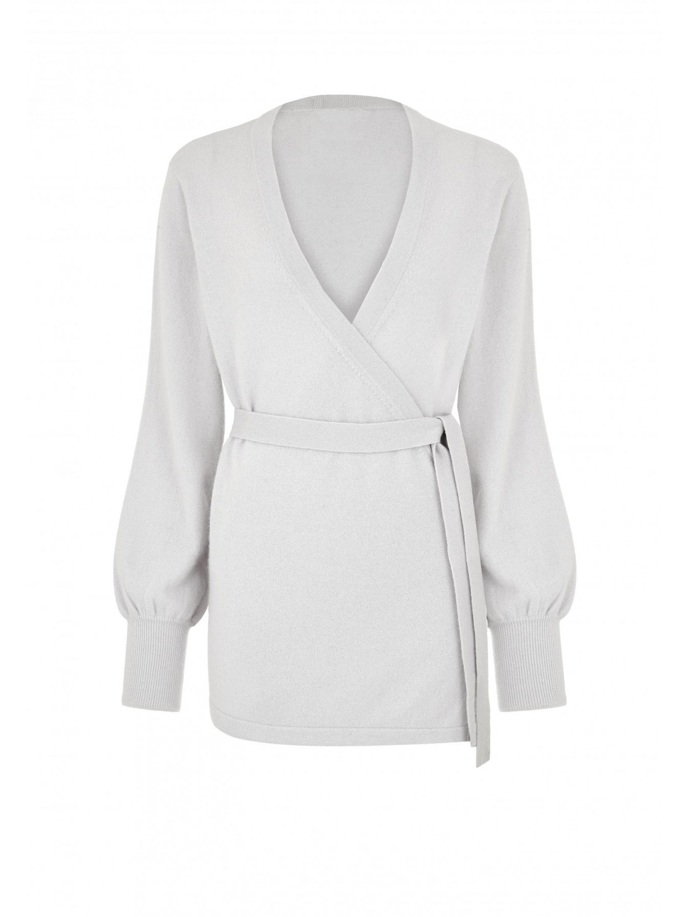 Джемпер на запах с завязками на боку из кашемировой пряжи с добавлением серебристой нити и миниатюрных пайеток. Длина до середины бедра. V-образная линия декольте. Широкий рукав-фонарик. Высокие манжеты выполнены резинкой.