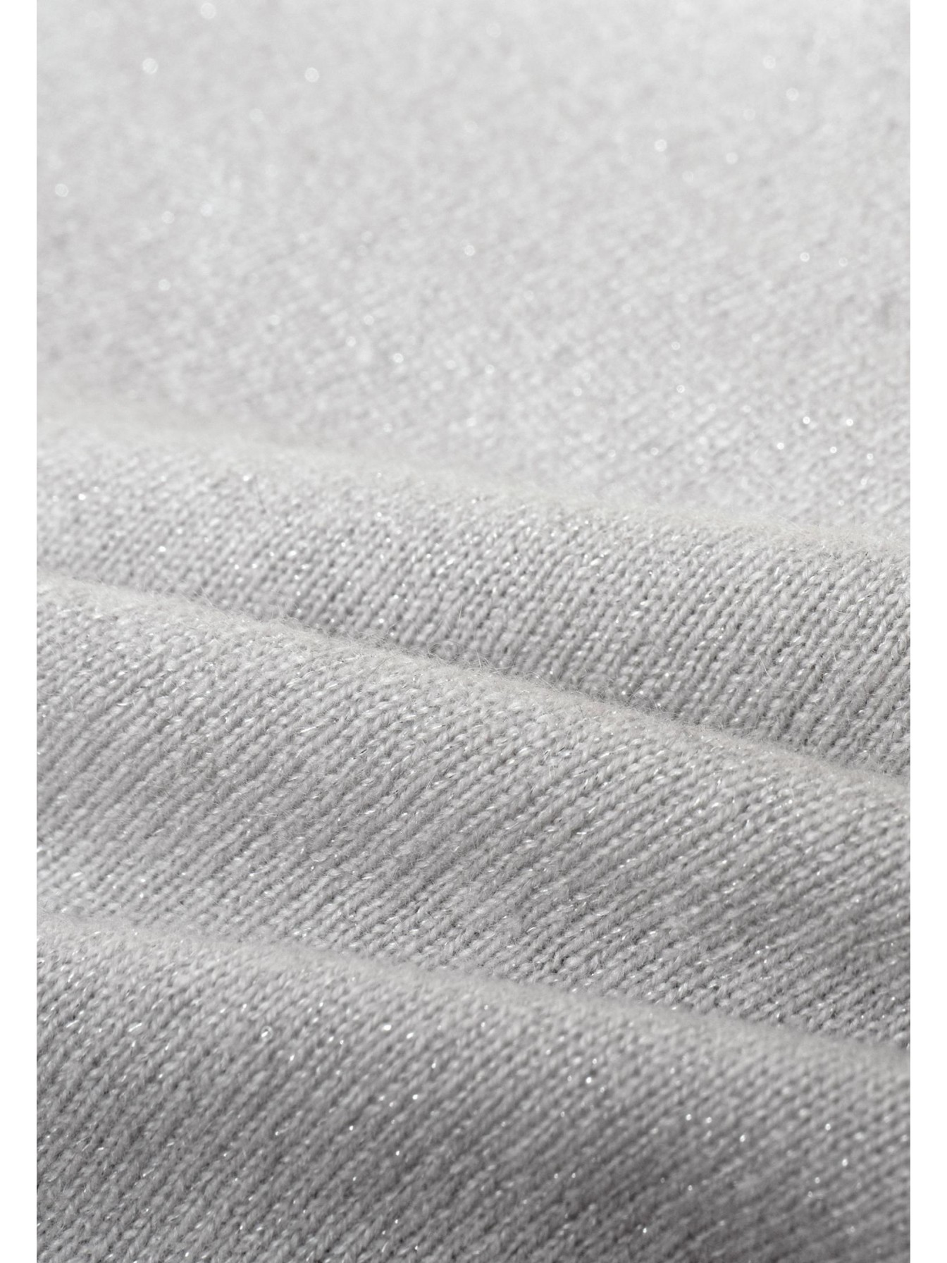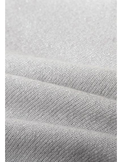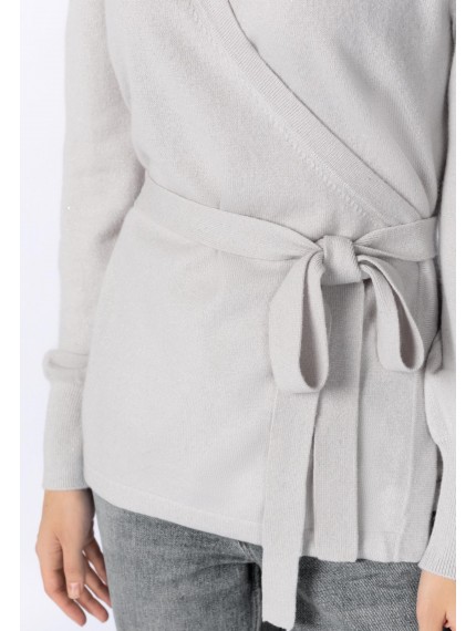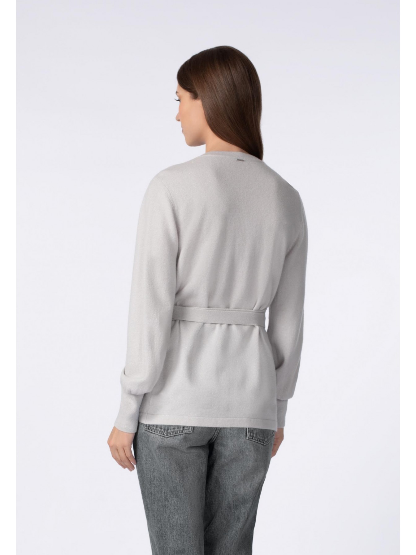 Джемпер на запах с завязками на боку из кашемировой пряжи с добавлением серебристой нити и миниатюрных пайеток. Длина до середины бедра. V-образная линия декольте. Широкий рукав-фонарик. Высокие манжеты выполнены резинкой.