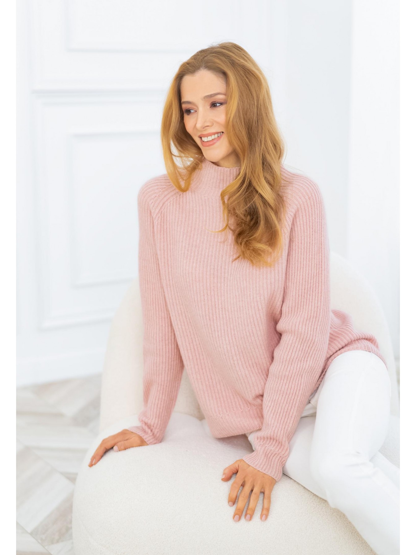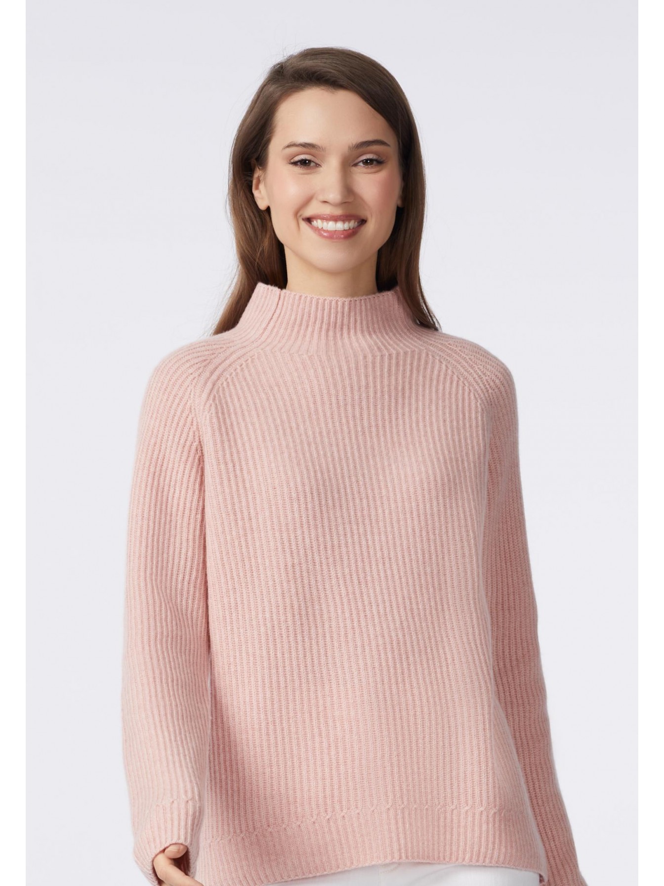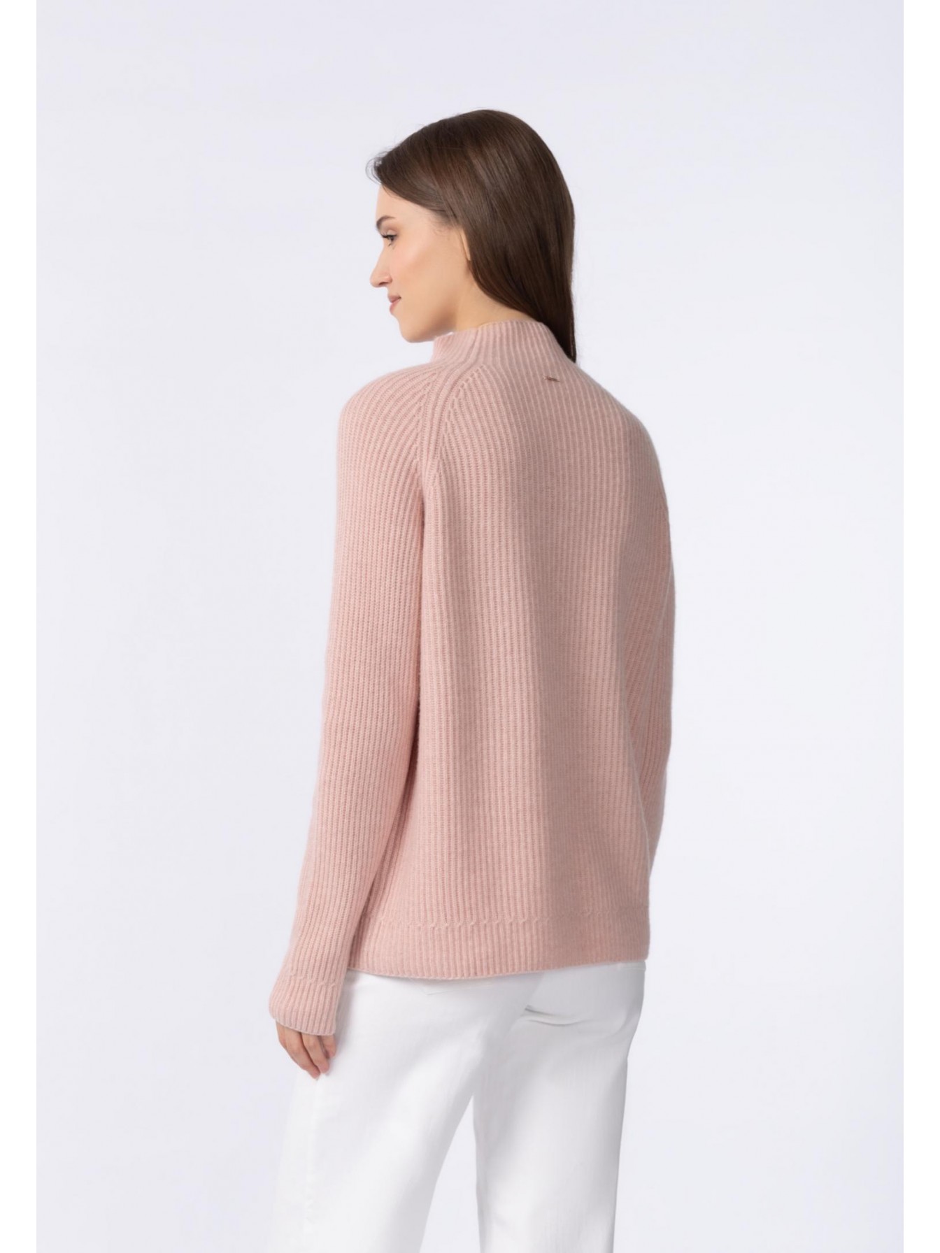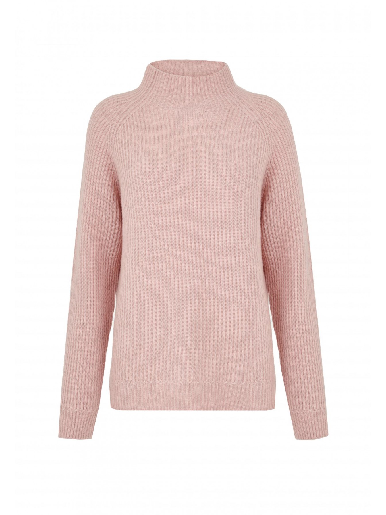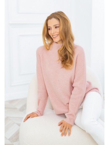Свитер полуприлегающего силуэта из трикотажа в рубчик. Длина до середины бедра. Воротник-стойка. Рукав реглан. По низу рукава имитация манжеты за счет оригинального рисунка вязки.