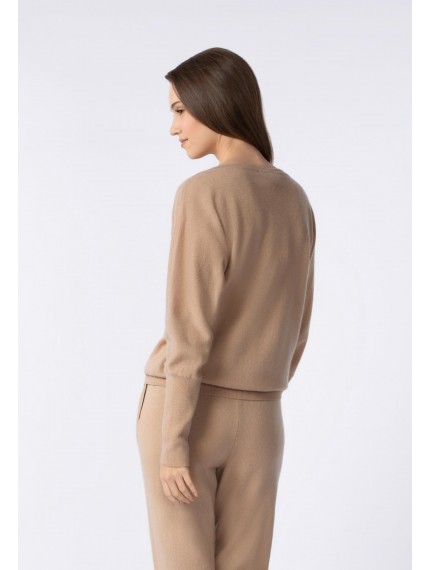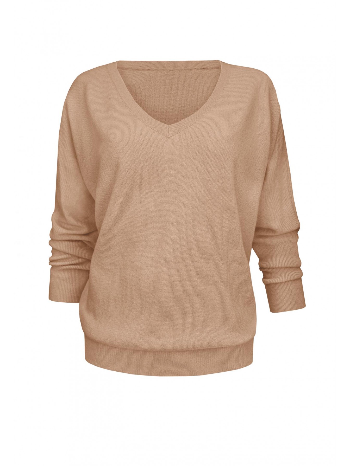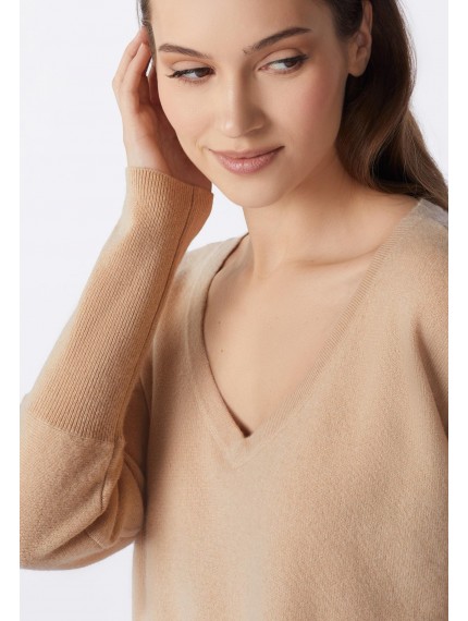 Джемпер с V-образным вырезом. Длина до бедер. Рукава и низ изделия выполнены вязаной резинкой.