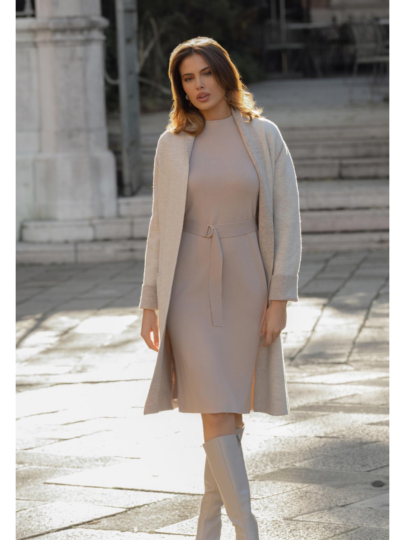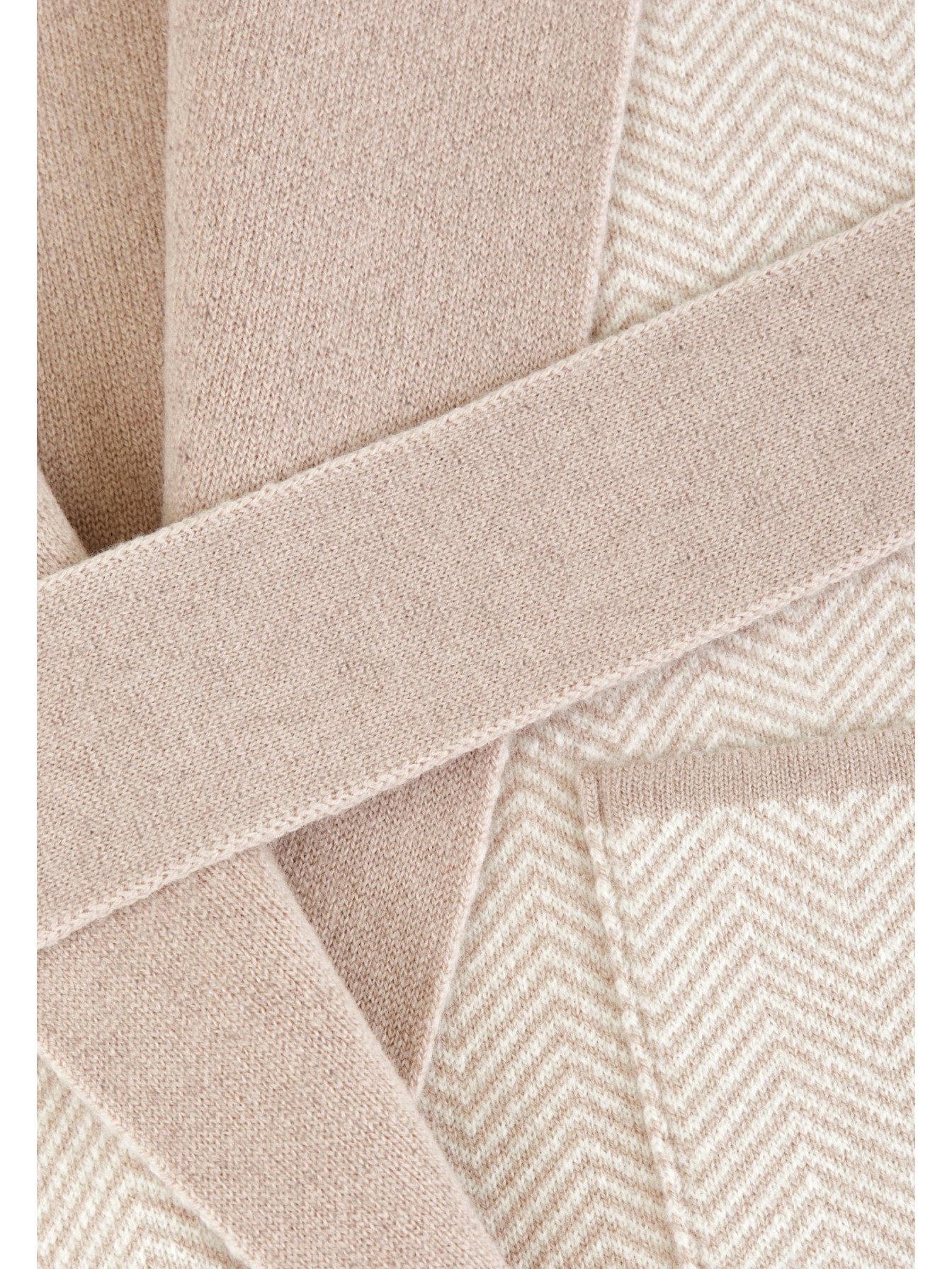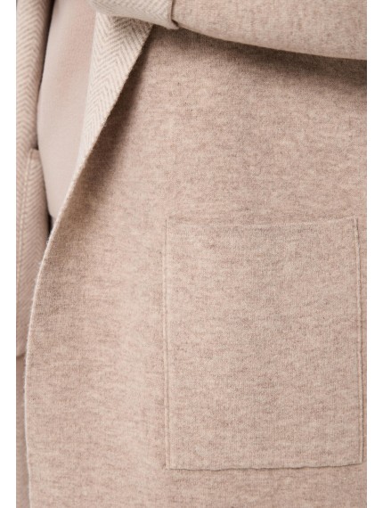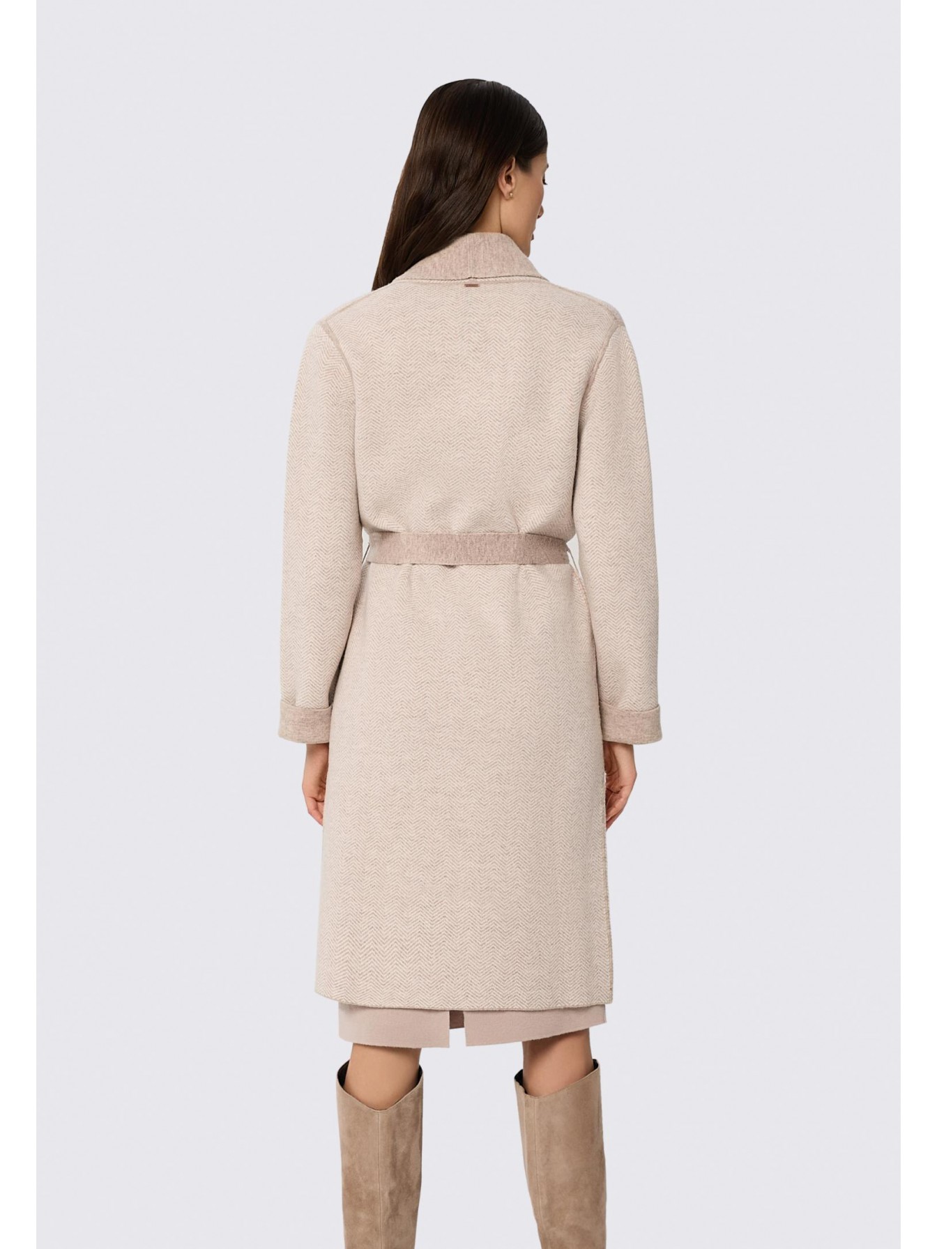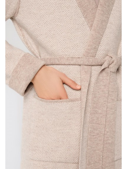 Уплотненный двусторонний кардиган свободного кроя с орнаментом «ёлочка». Отложной воротник. Пояс в комплекте. Длина до уровня колен. Накладные карманы. Пальто выполнено из плотного материала Double Face (двуслойный трикотаж) без подкладки.
