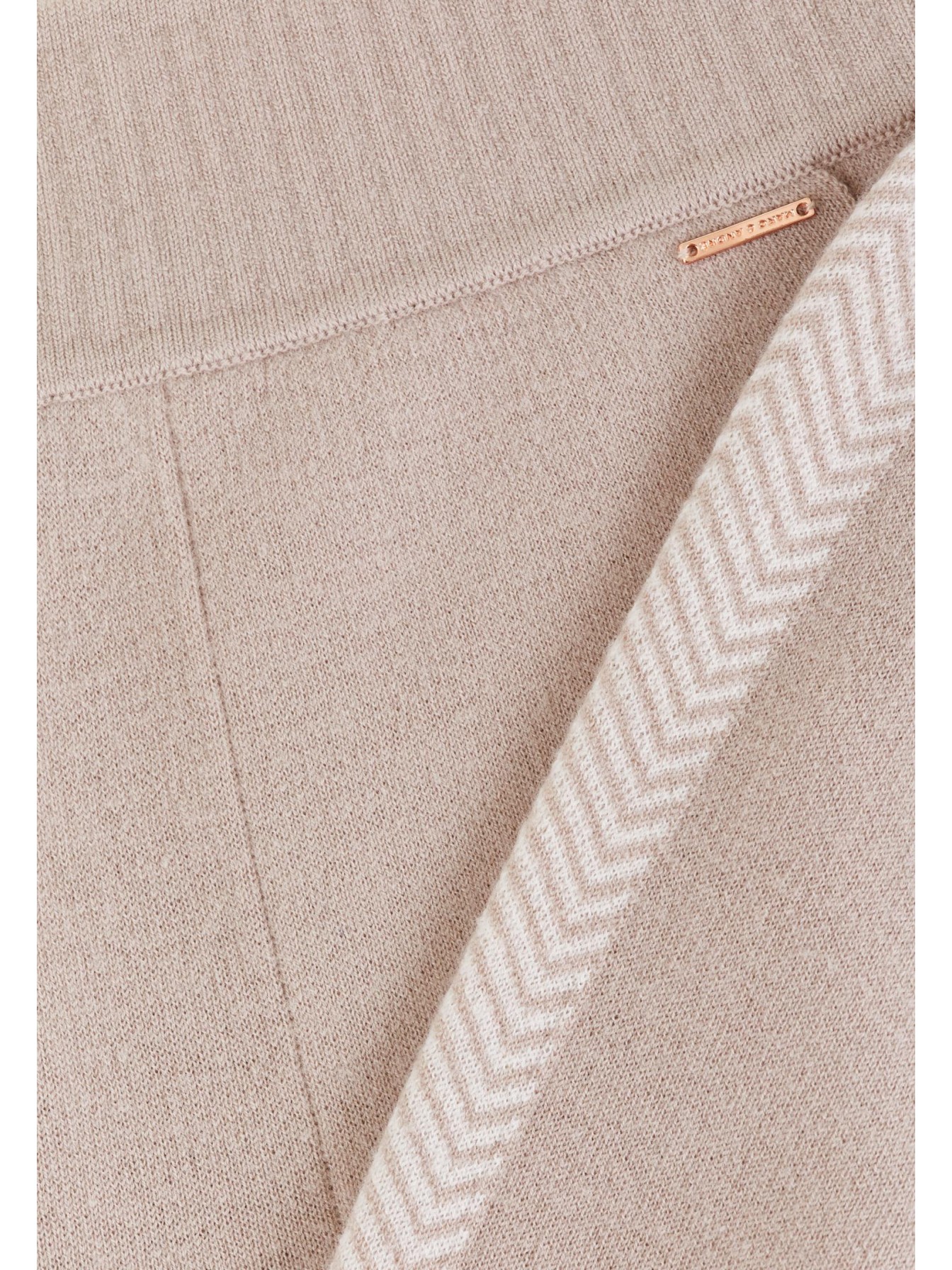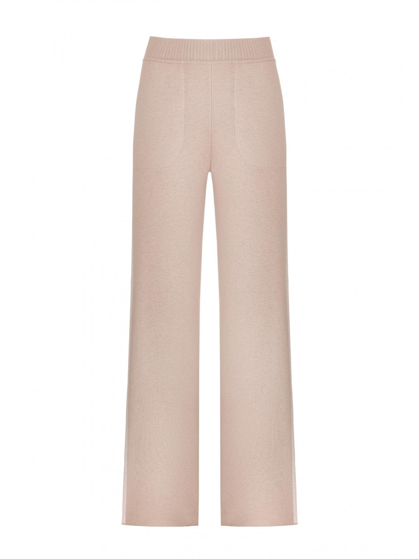 Брюки свободного кроя. Пояс выполнен вязаной резинкой без эластичной тесьмы. Боковые карманы. Лампасы с орнаментом «ёлочка» делают силуэт визуально стройнее. Выполнены из двухслойного трикотажа интерлок по технологии чистого края, без отстрочки.