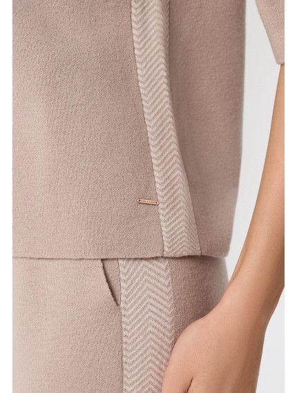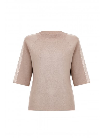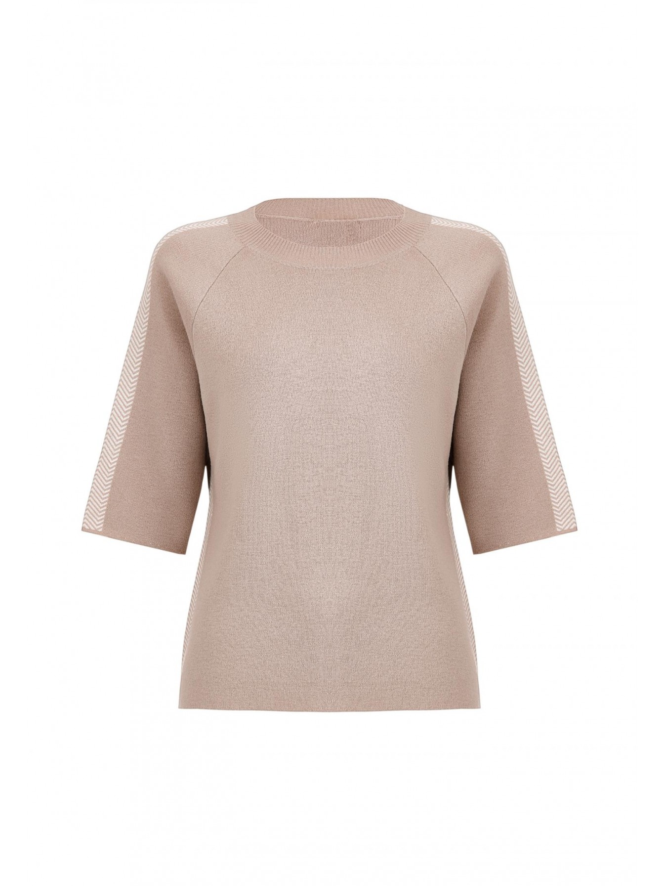 Укороченный джемпер с круглым вырезом горловины. Рукав реглан длины 3/4. Отделка контрастной полосой с орнаментом «ёлочка» по средней линии рукава. Выполнен из двухслойного трикотажа интерлок по технологии чистого края, без отстрочки.