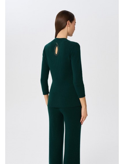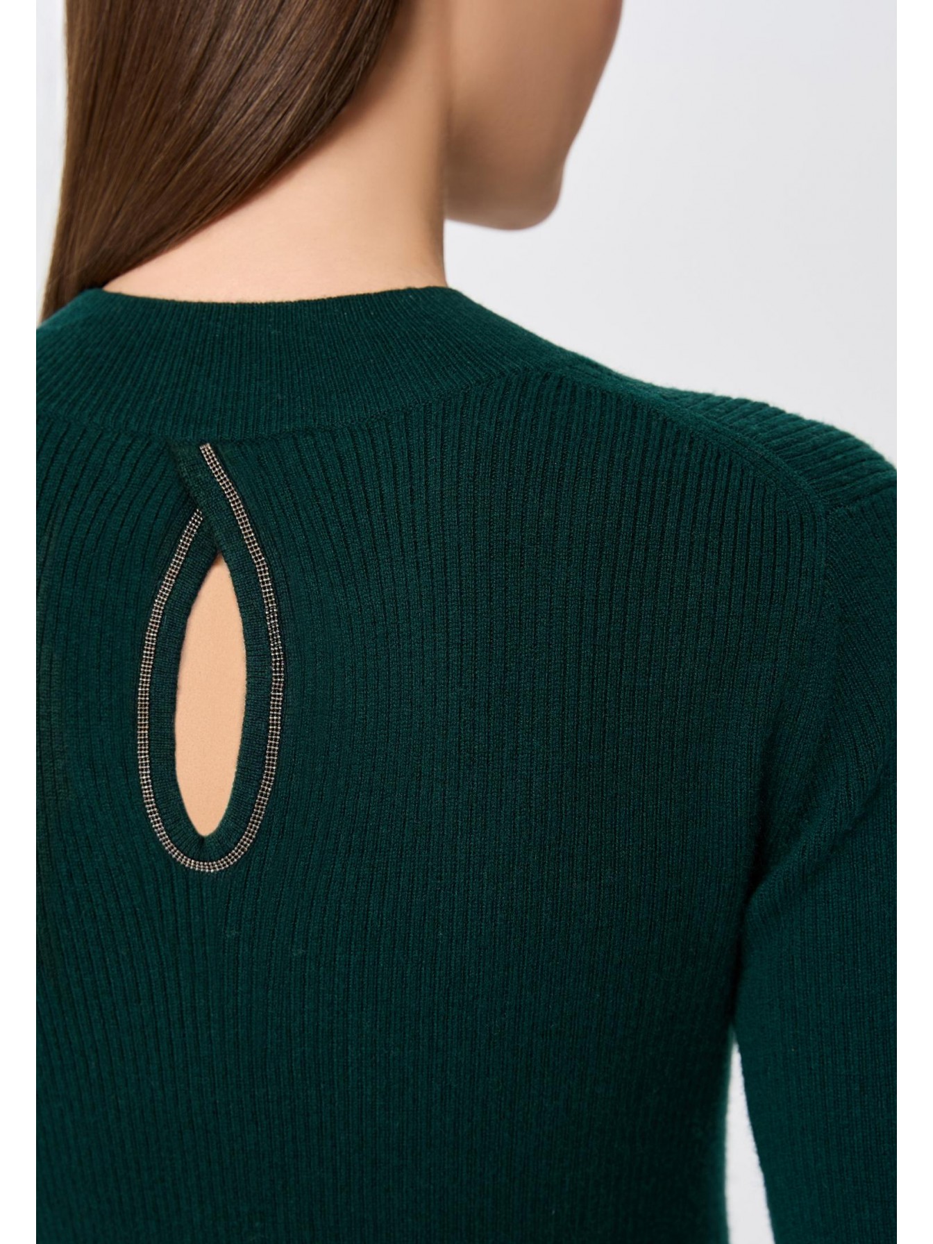 Водолазка с воротником-стойкой из трикотажа в рубчик. Длина до бедер, прилегающий силуэт. Длина рукава 3/4. Сзади фигурный вырез декорирован тонкой металлизированной тесьмой (ручная работа).