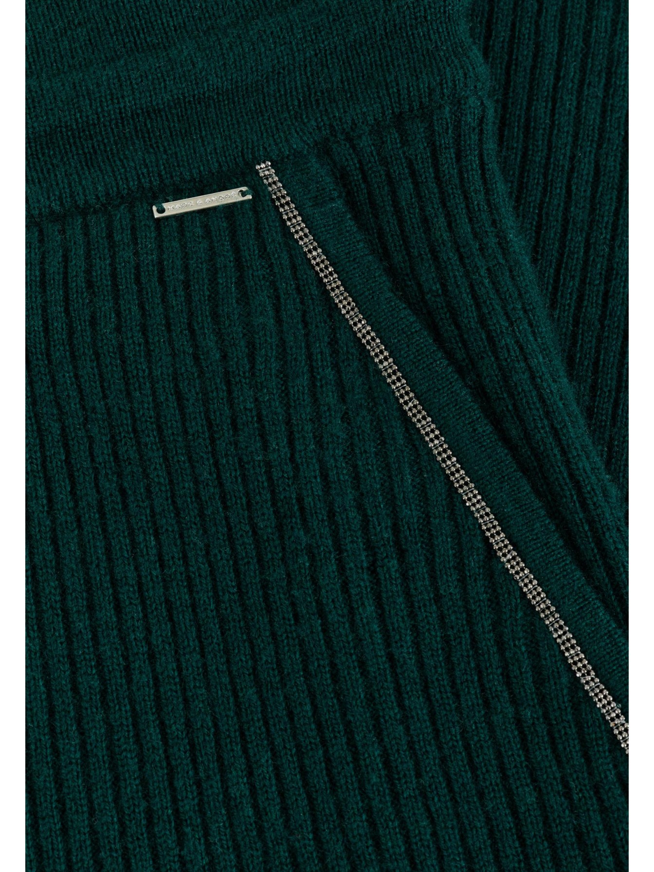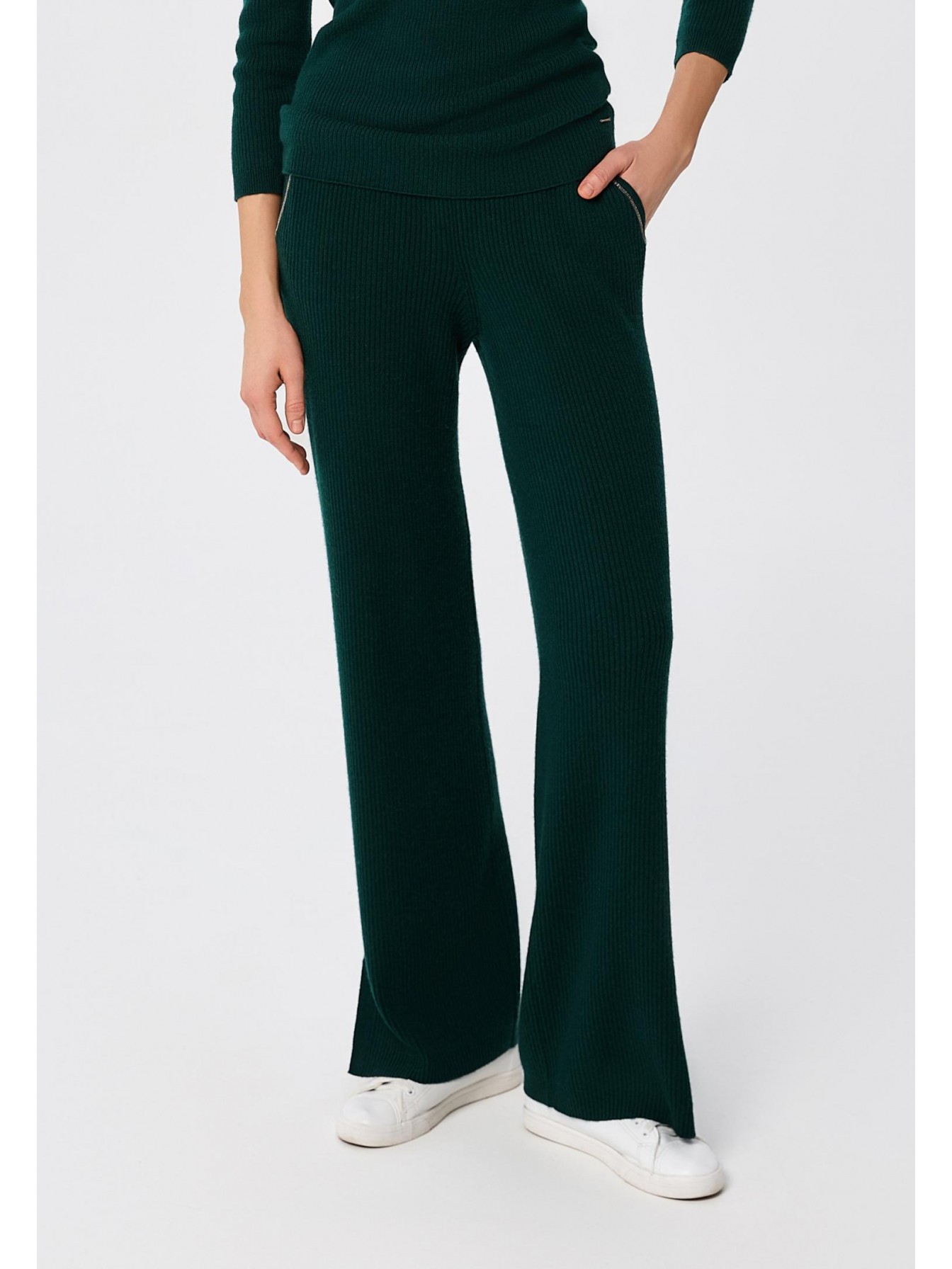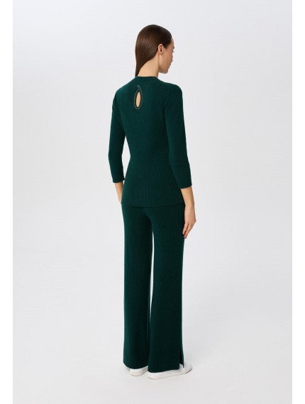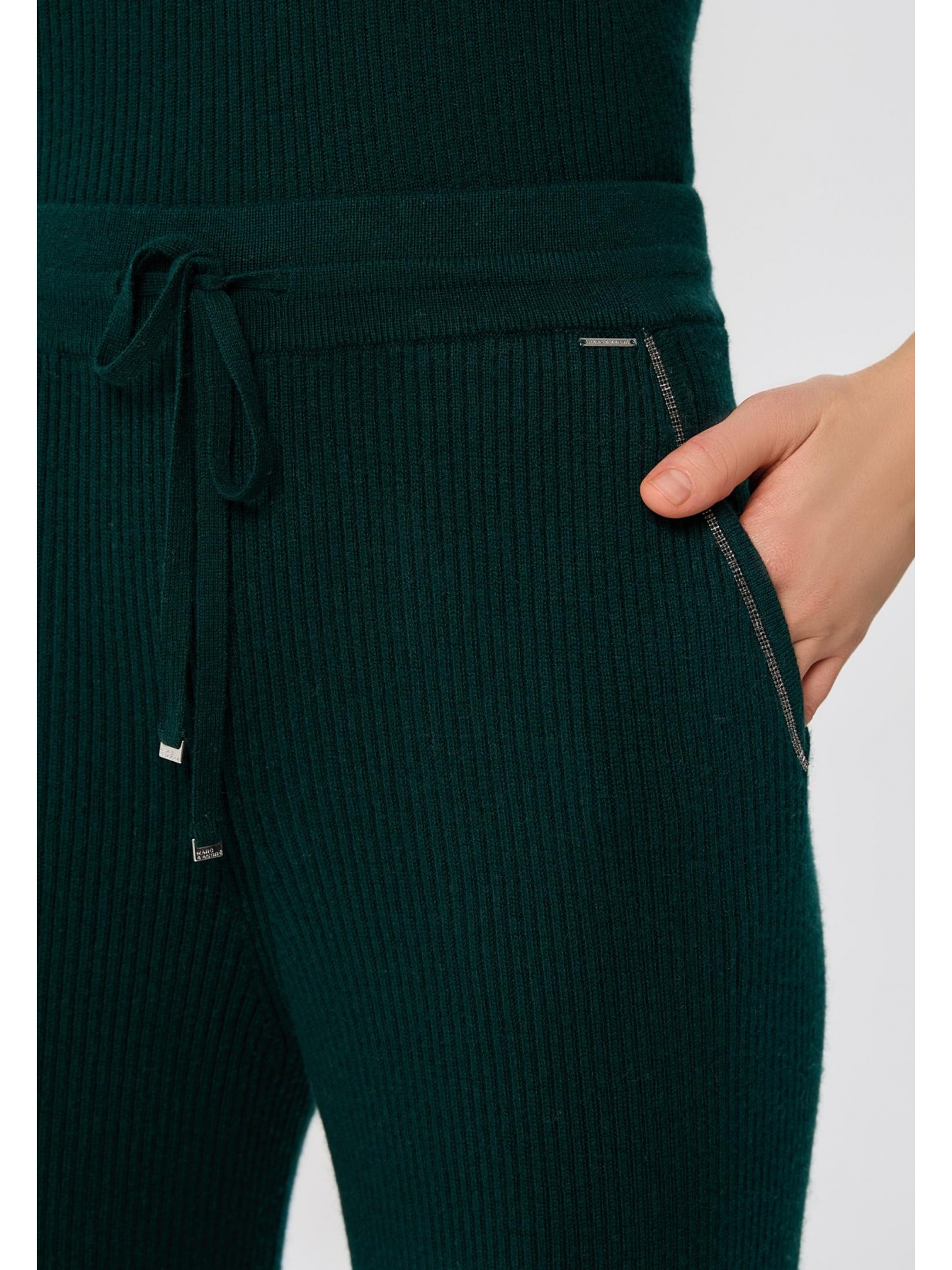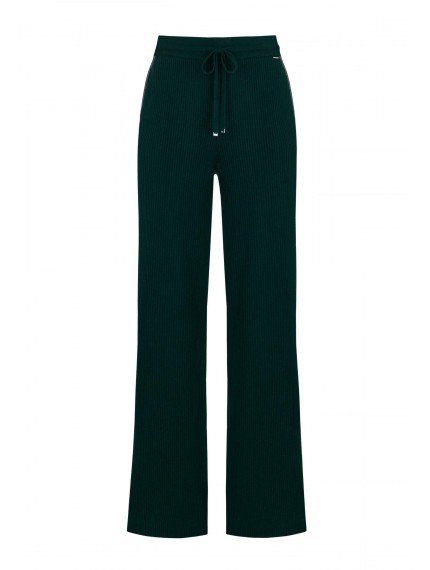 Брюки свободного кроя из трикотажа в рубчик. Легкий клеш за счет небольших боковых разрезов делает визуально силуэт стройнее. Эластичный пояс со шнуром. Боковые карманы декорированы тонкой металлизированной тесьмой (ручная работа).