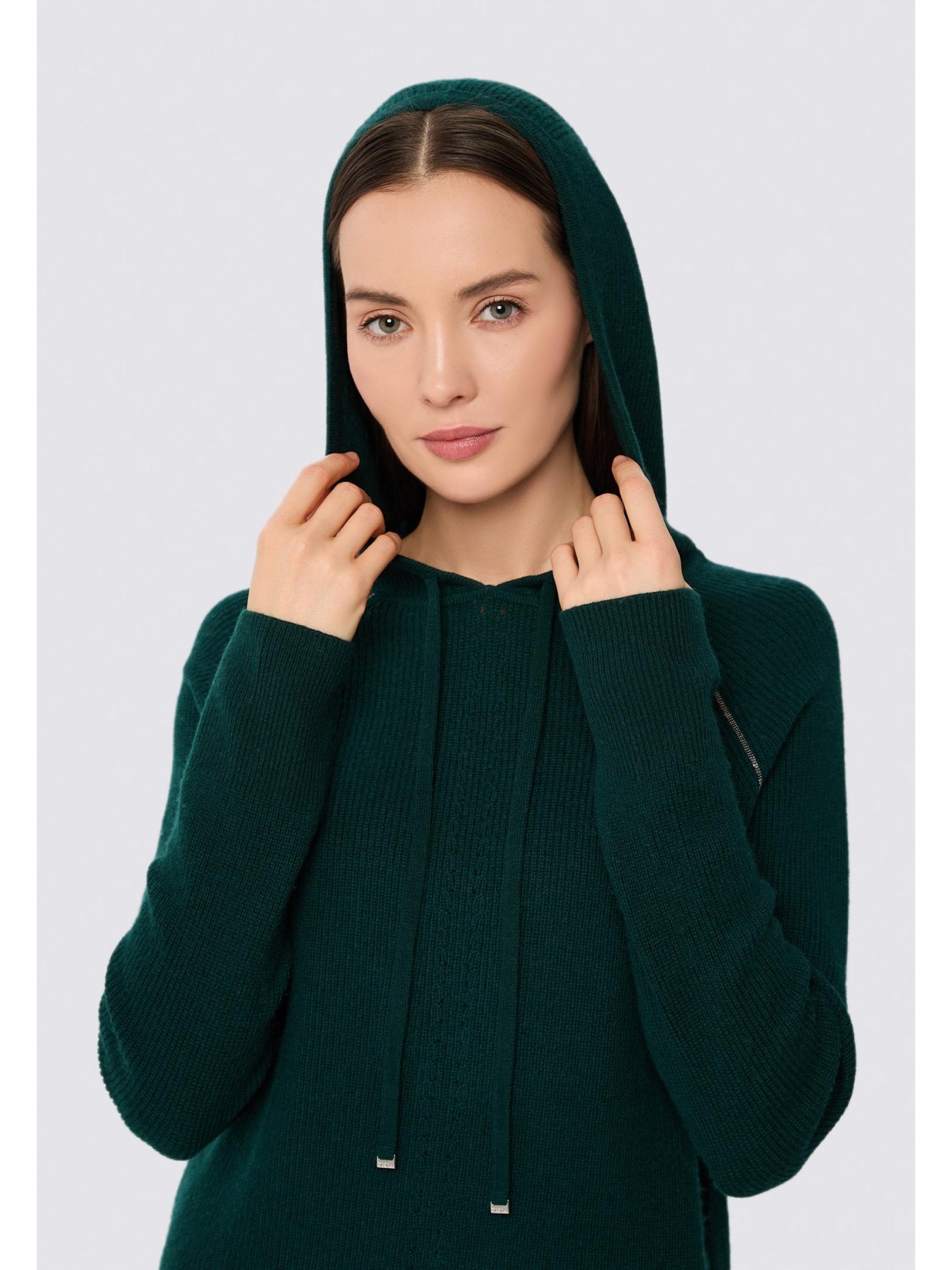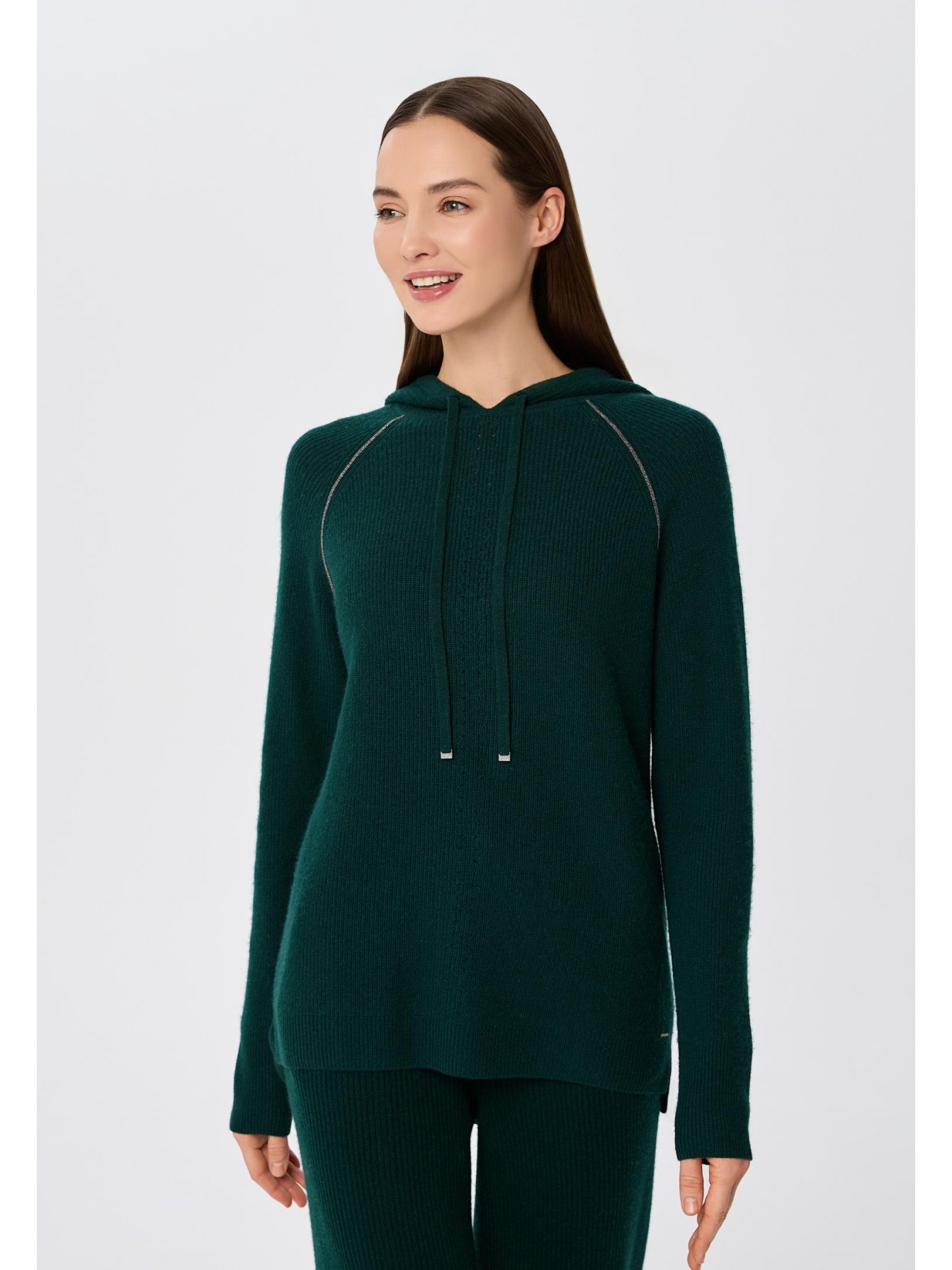 Джемпер с капюшоном из трикотажа в рубчик. Свободный крой, длина до бедер. Рукав реглан. Пройма спереди декорирована тонкой металлизированной тесьмой (ручная работа). По центру передней и задней детали ажурная полоса в технике пуантель.