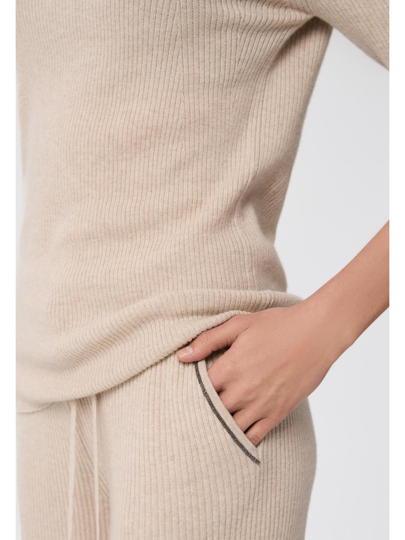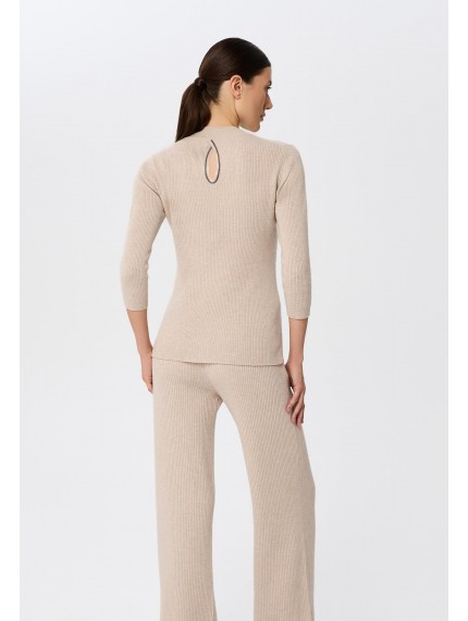 Водолазка с воротником-стойкой из трикотажа в рубчик. Длина до бедер, прилегающий силуэт. Длина рукава 3/4. Сзади фигурный вырез декорирован тонкой металлизированной тесьмой (ручная работа).