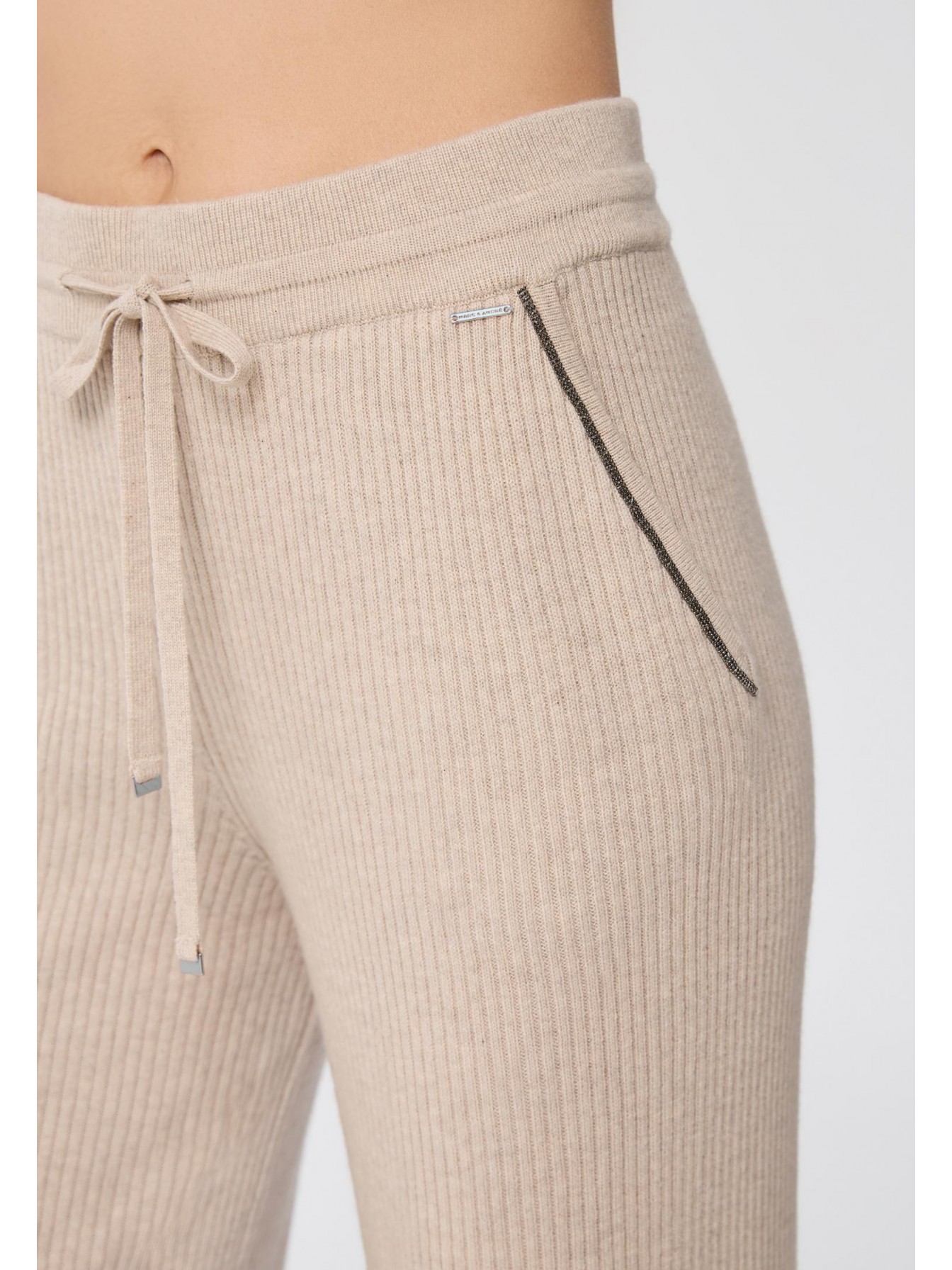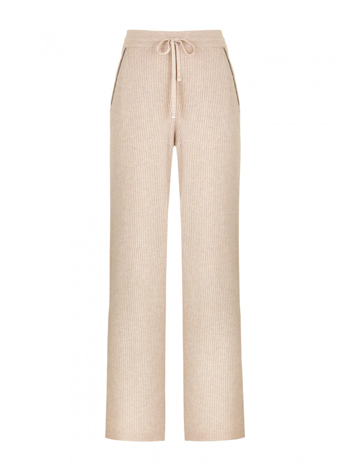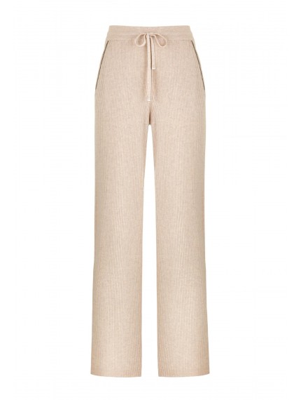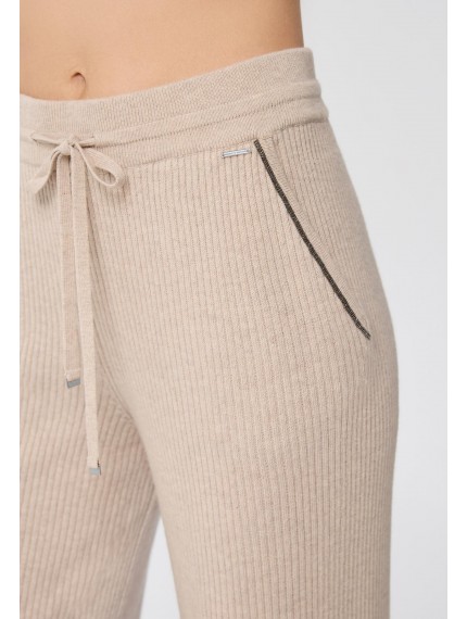 Брюки свободного кроя из трикотажа в рубчик. Легкий клеш за счет небольших боковых разрезов делает визуально силуэт стройнее. Эластичный пояс со шнуром. Боковые карманы декорированы тонкой металлизированной тесьмой (ручная работа).