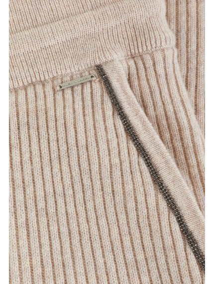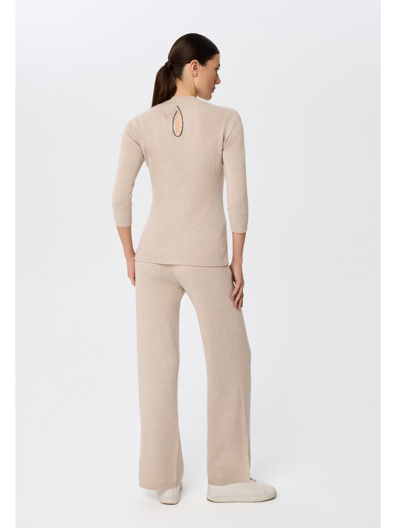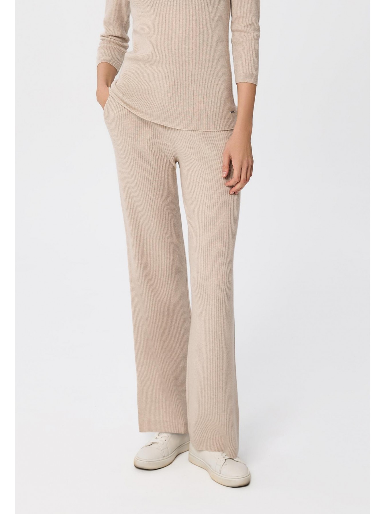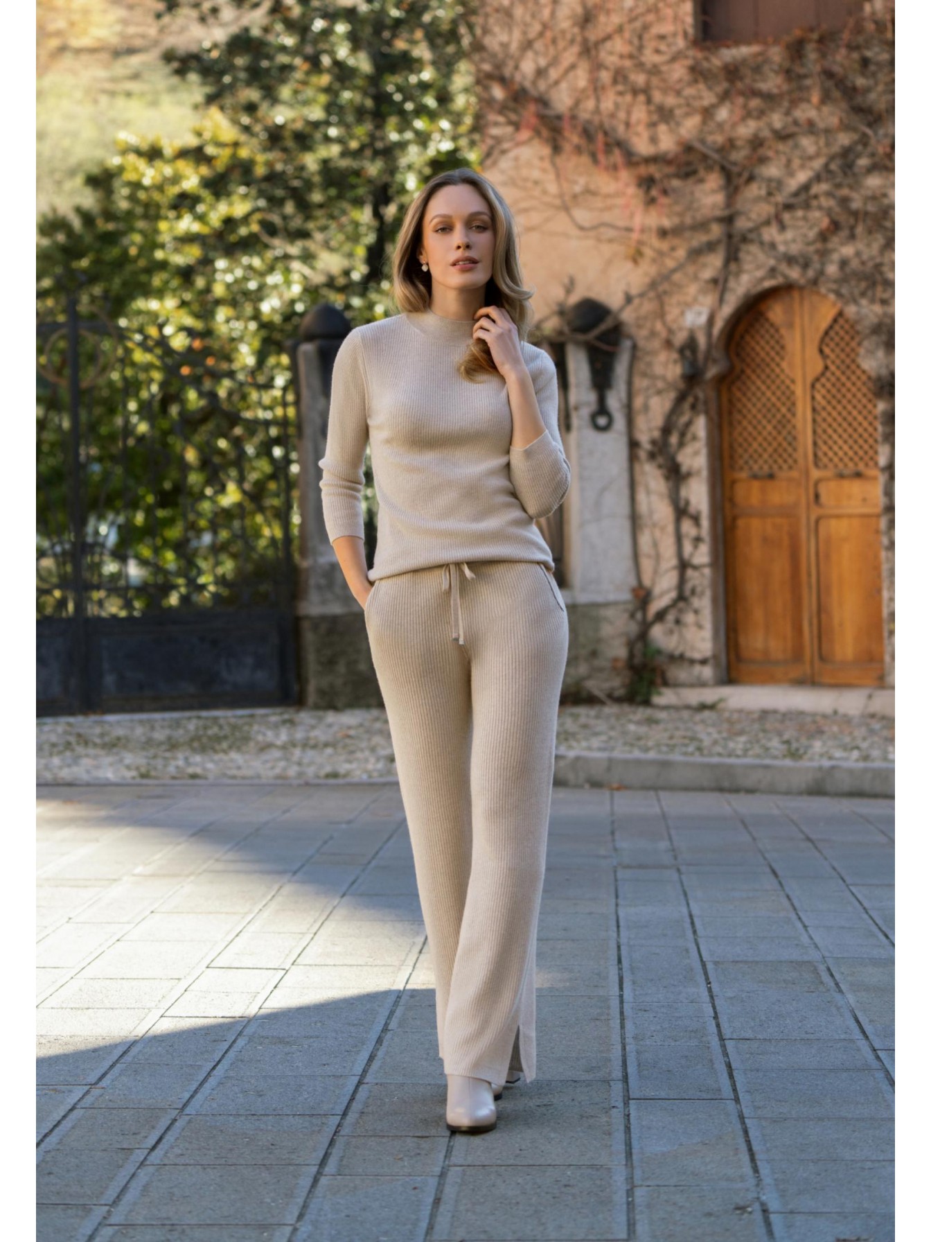 Брюки свободного кроя из трикотажа в рубчик. Легкий клеш за счет небольших боковых разрезов делает визуально силуэт стройнее. Эластичный пояс со шнуром. Боковые карманы декорированы тонкой металлизированной тесьмой (ручная работа).