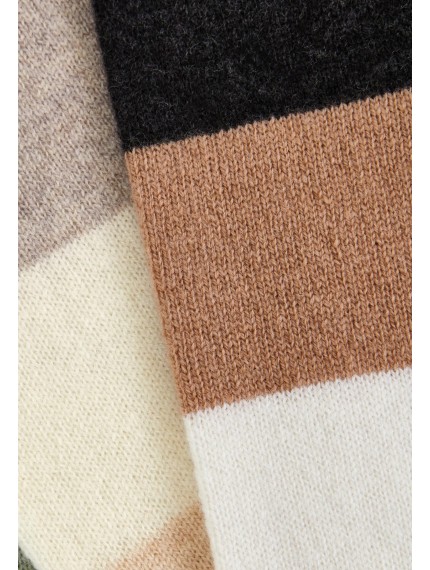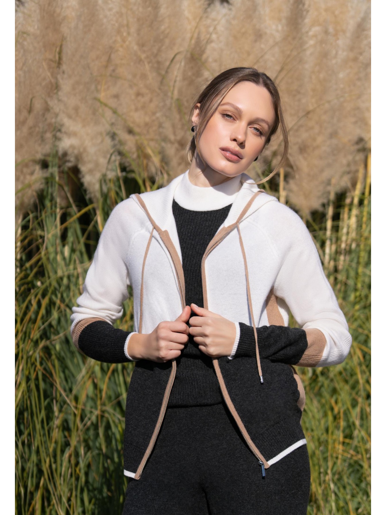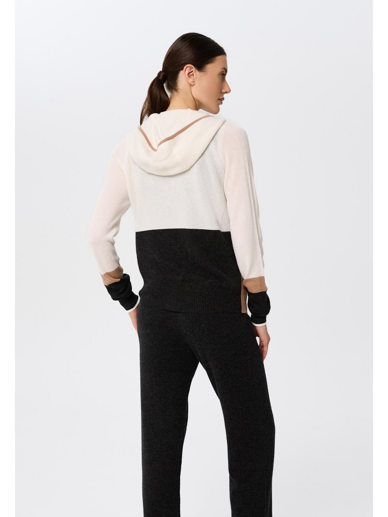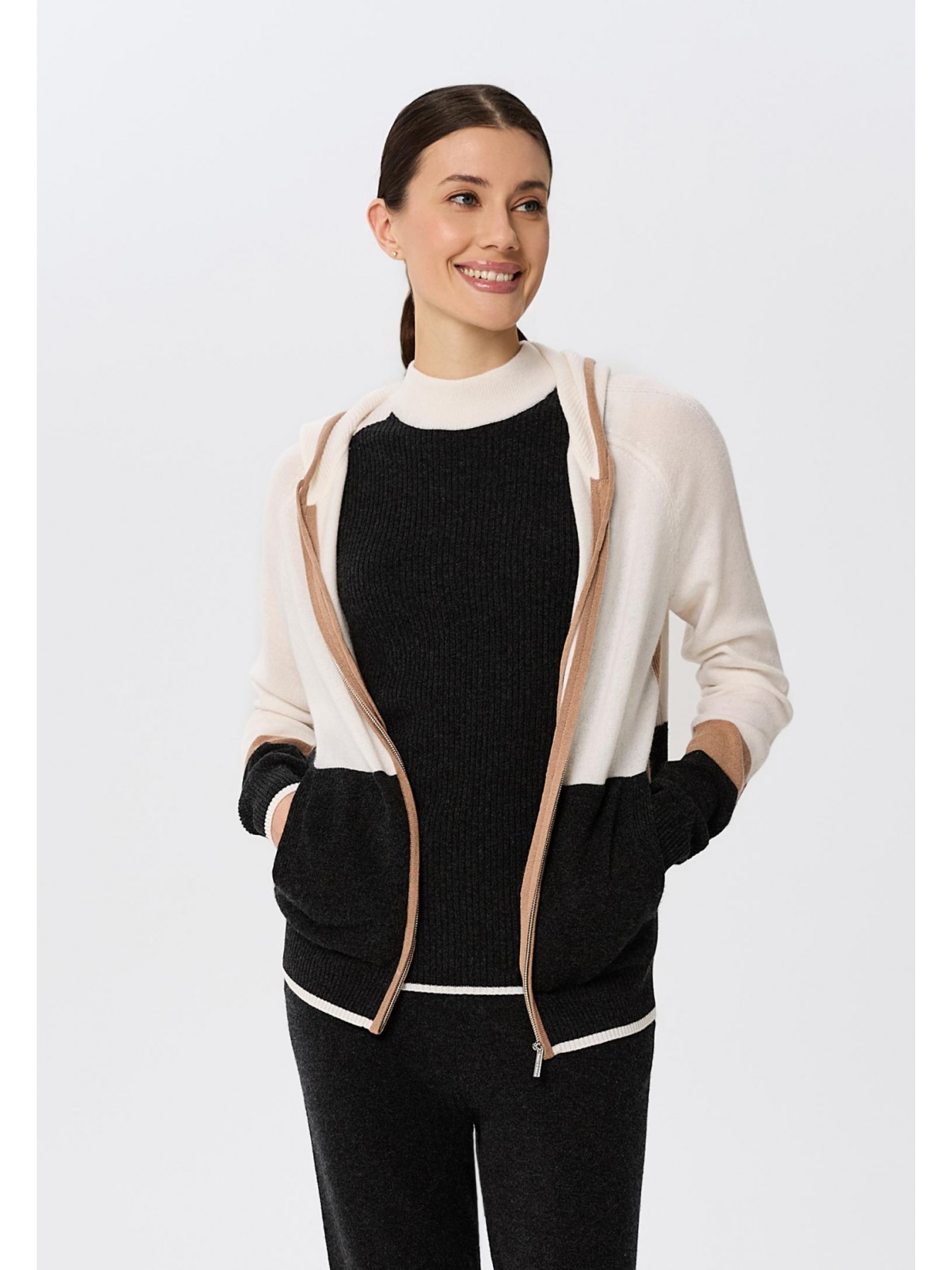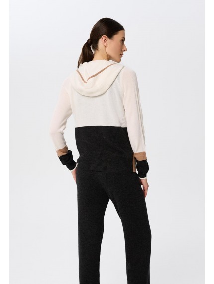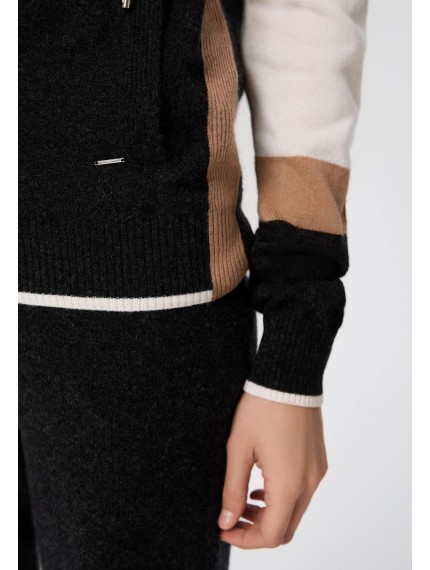 Джемпер с капюшоном на молнии из трикотажа в рубчик. Полуприлегающий силуэт. По линии притачивания молнии и краю капюшона отделка узкими контрастными полосами. Манжеты и низ оформлены вязаной резинкой. Контрастный трехцветный дизайн в стиле колор-блок.