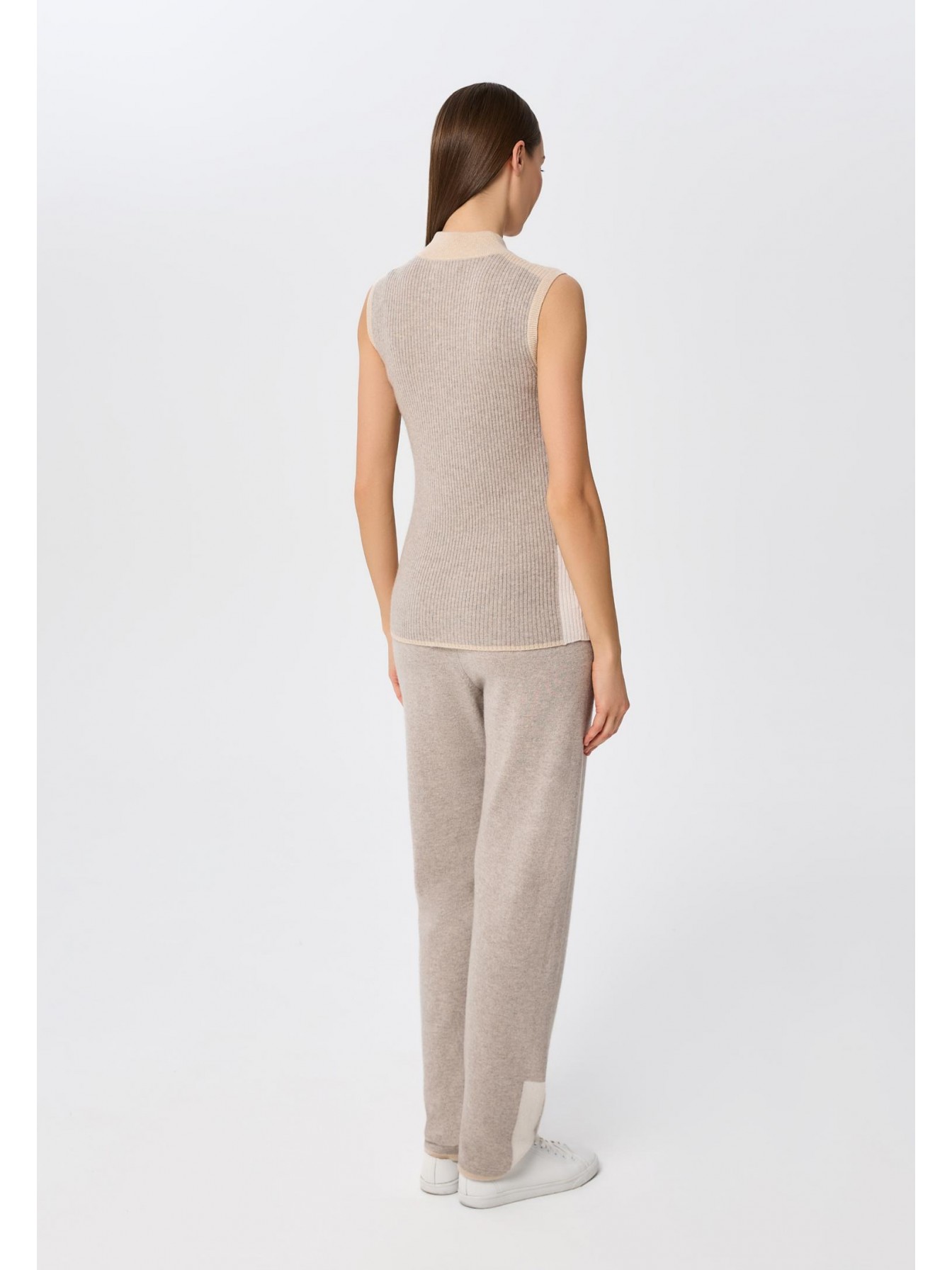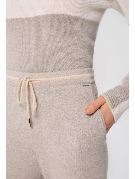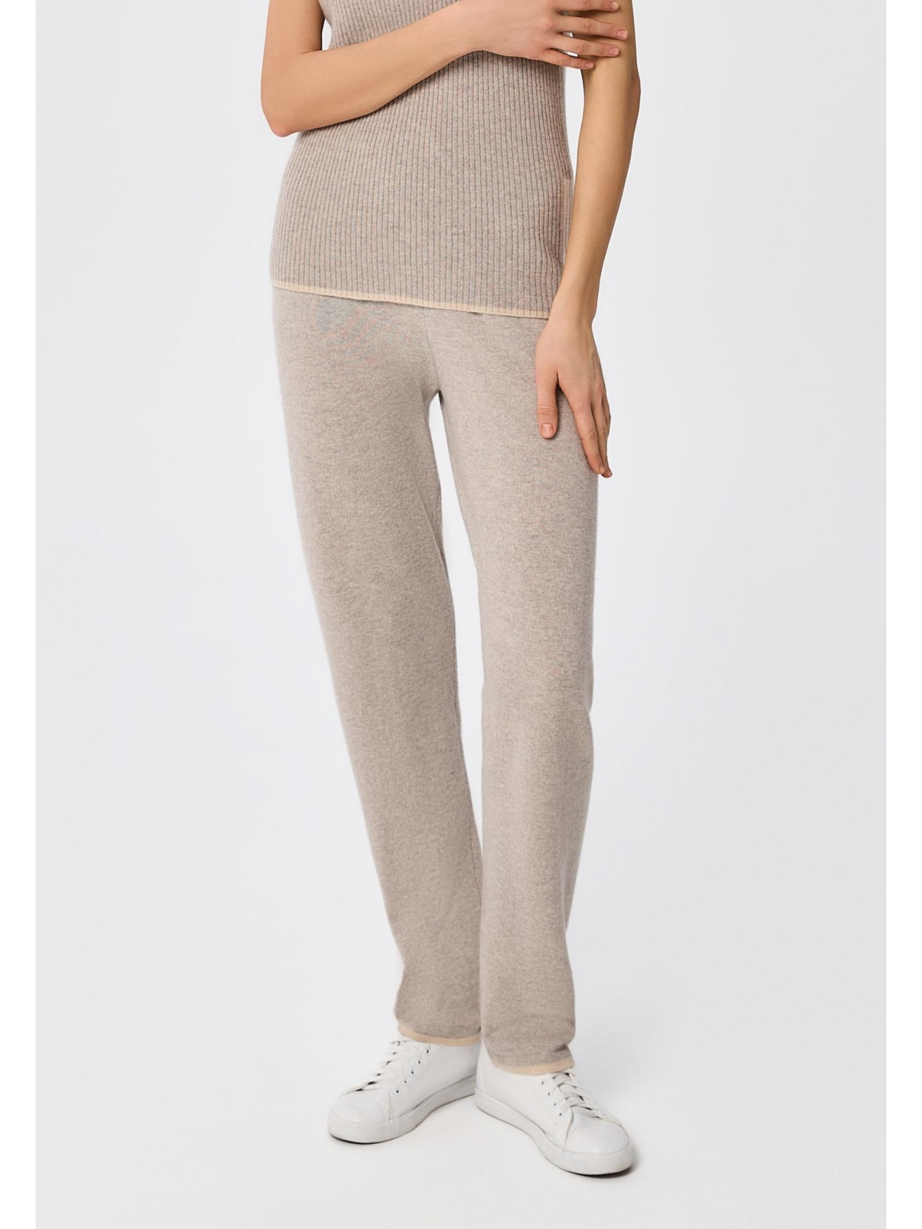 Брюки, слегка зауженные книзу. Эластичный пояс с кулиской для комфортной посадки. По бокам карманы. Контрастные детали в стиле колор-блок на щиколотке и поясе.