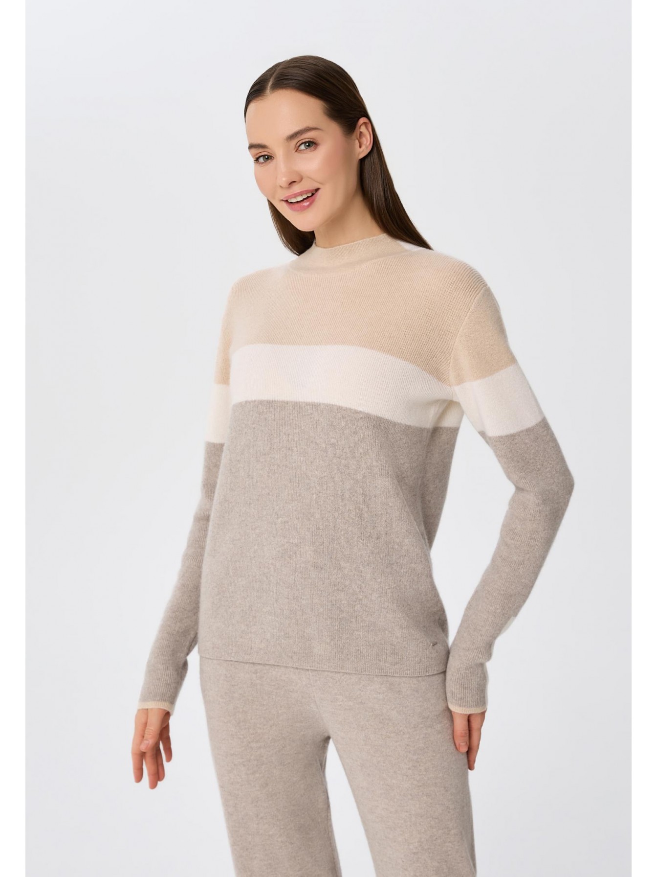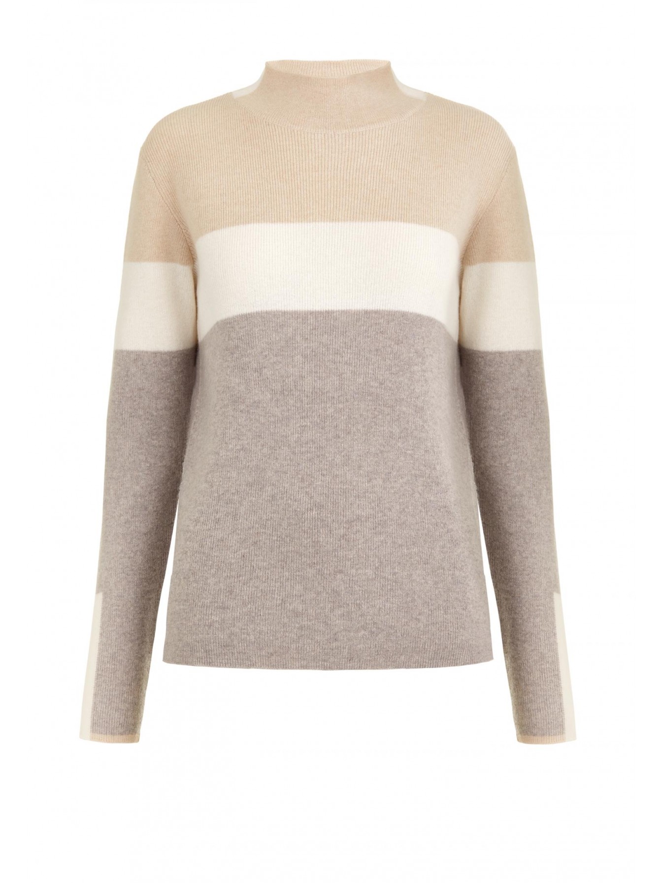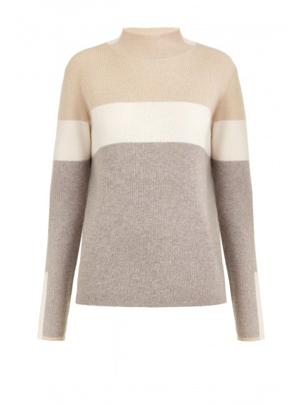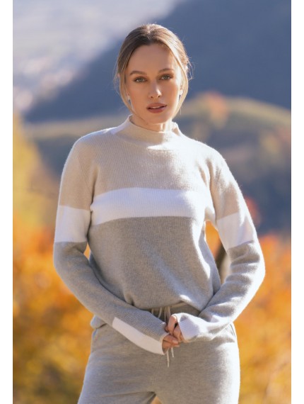 Свитер из трикотажа в рубчик с воротником-стойкой. Приталенный силуэт, длина до бедер. Воротник и низ рукава выполнены вязаной резинкой. Декоративные контрастные полосы по центру, рукавам и по бокам изделия.