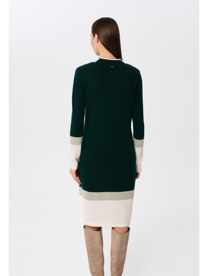 Платье полуприлегающего силуэта. Длина чуть ниже уровня колена. Воротник-стойка с контрастной окантовкой. Низ изделия, горловина и манжеты оформлены вязаной резинкой. Декоративные контрастные полосы по низу изделия и рукава.