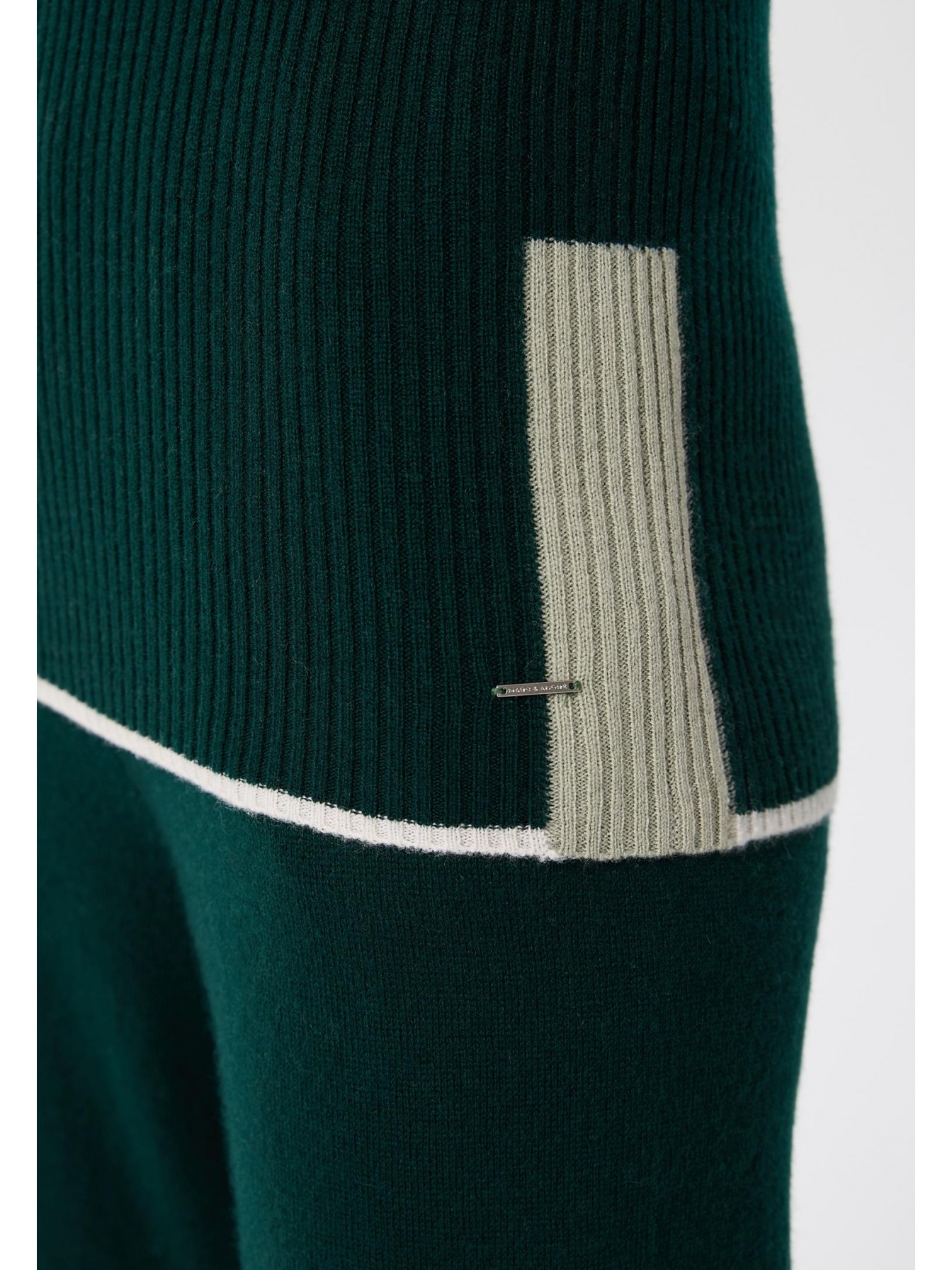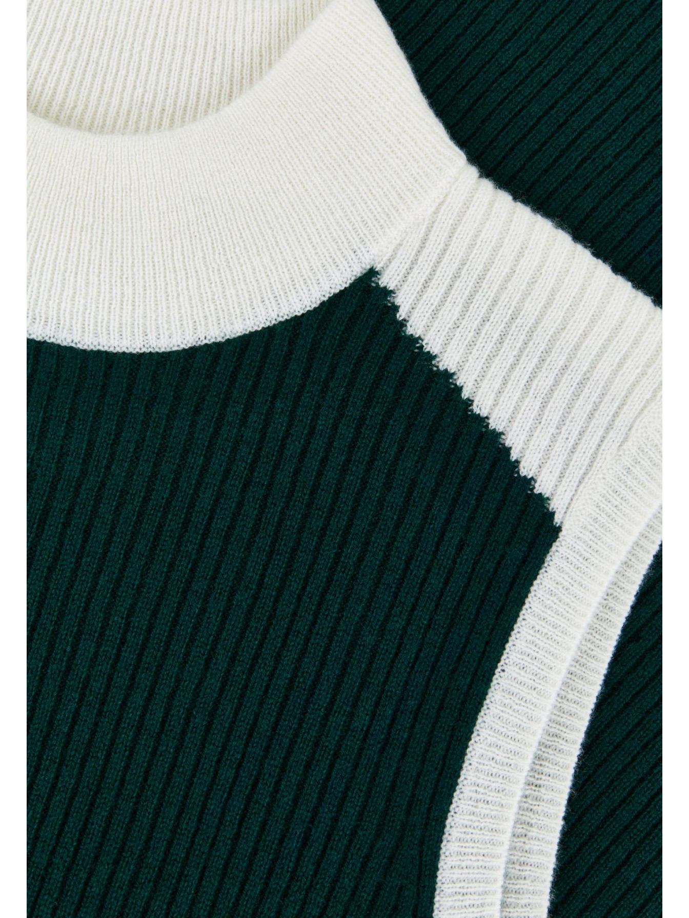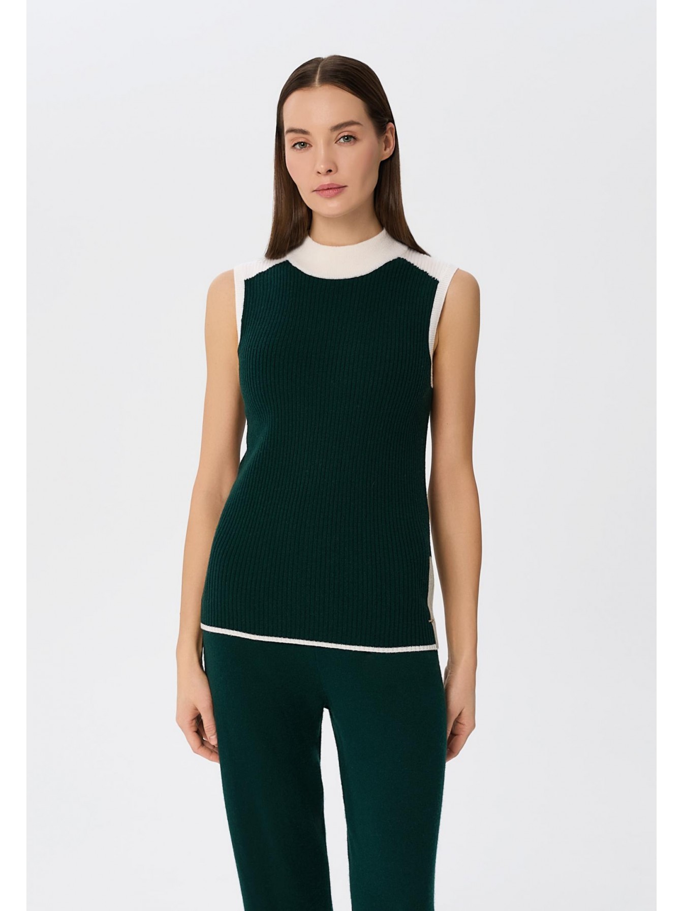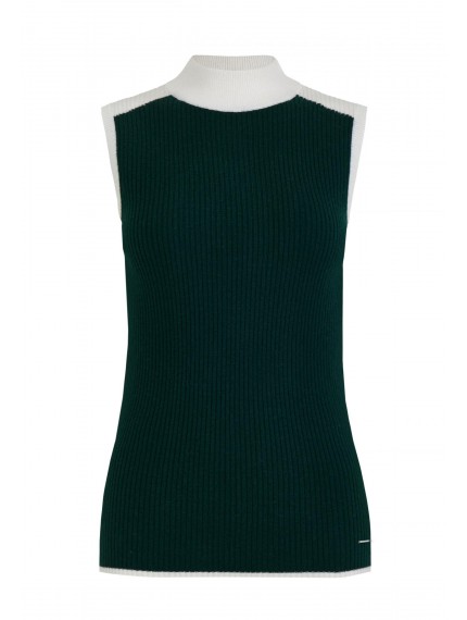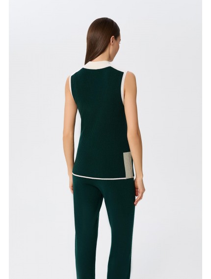 Водолазка без рукавов полуприлегающего силуэта из трикотажа в рубчик. Длина до бедер. Контрастная отделка в стиле колор-блок по краю изделия, пройме и воротнику делают силуэт визуально стройнее.