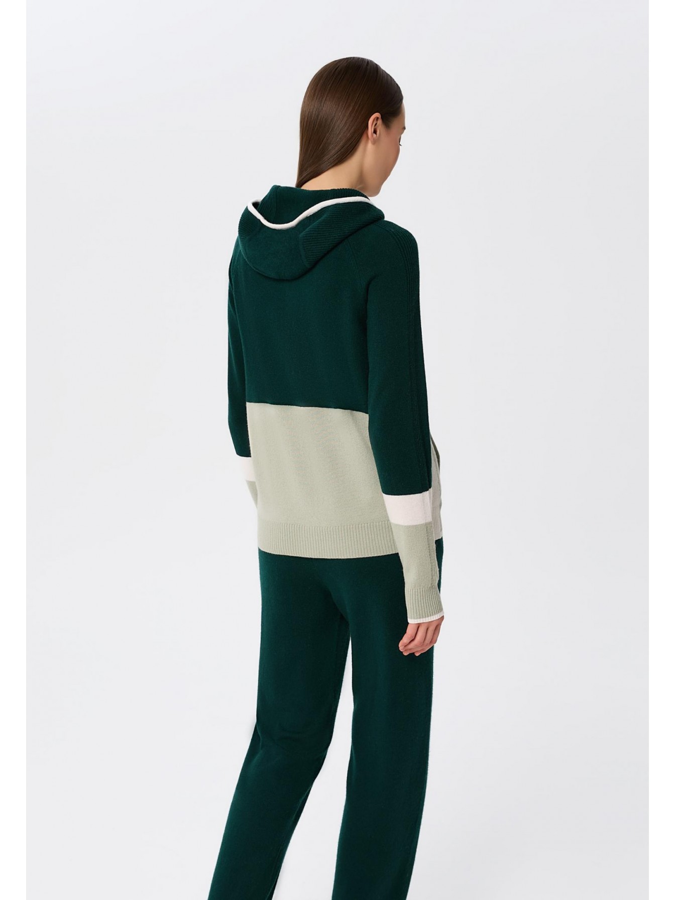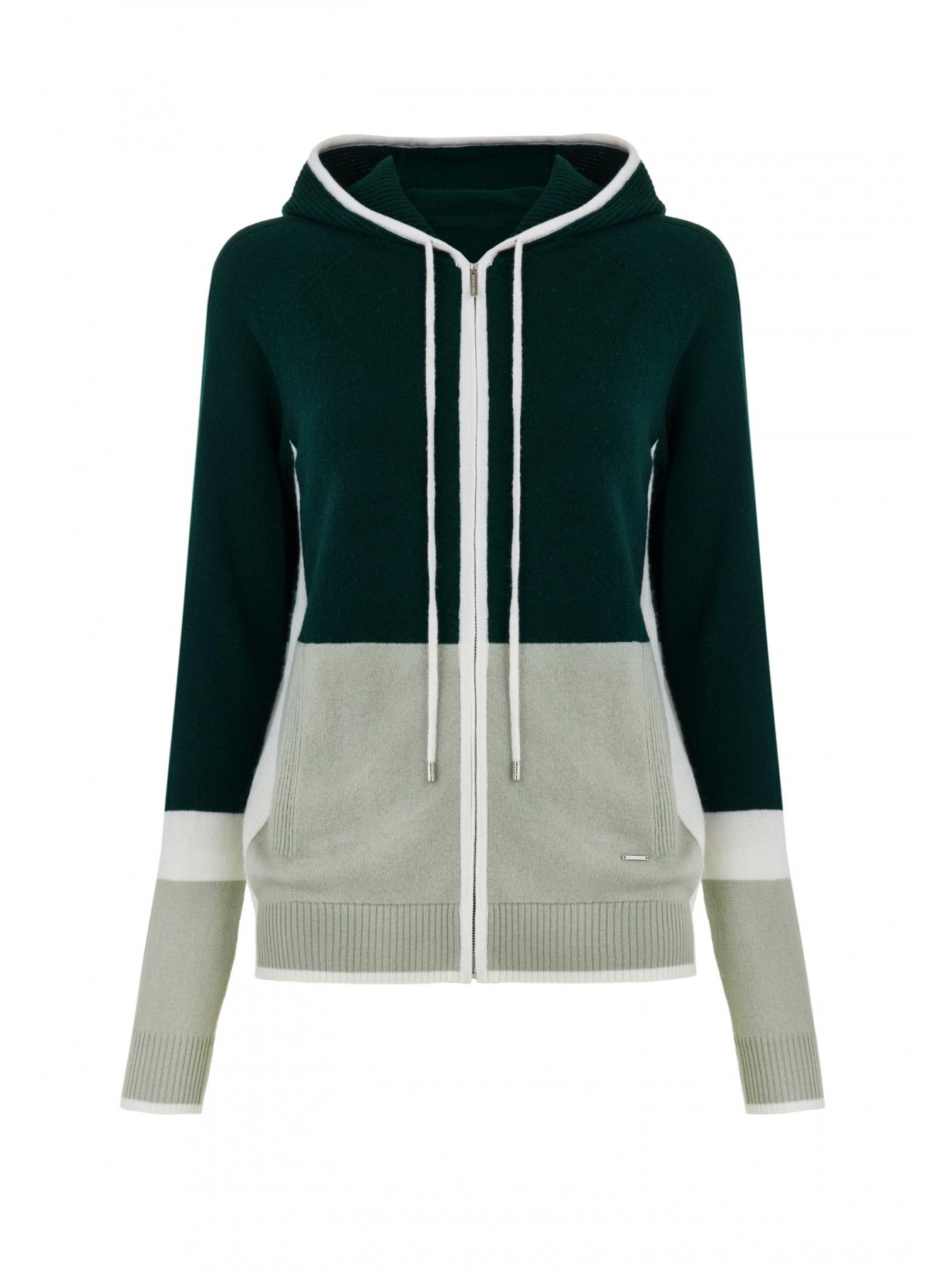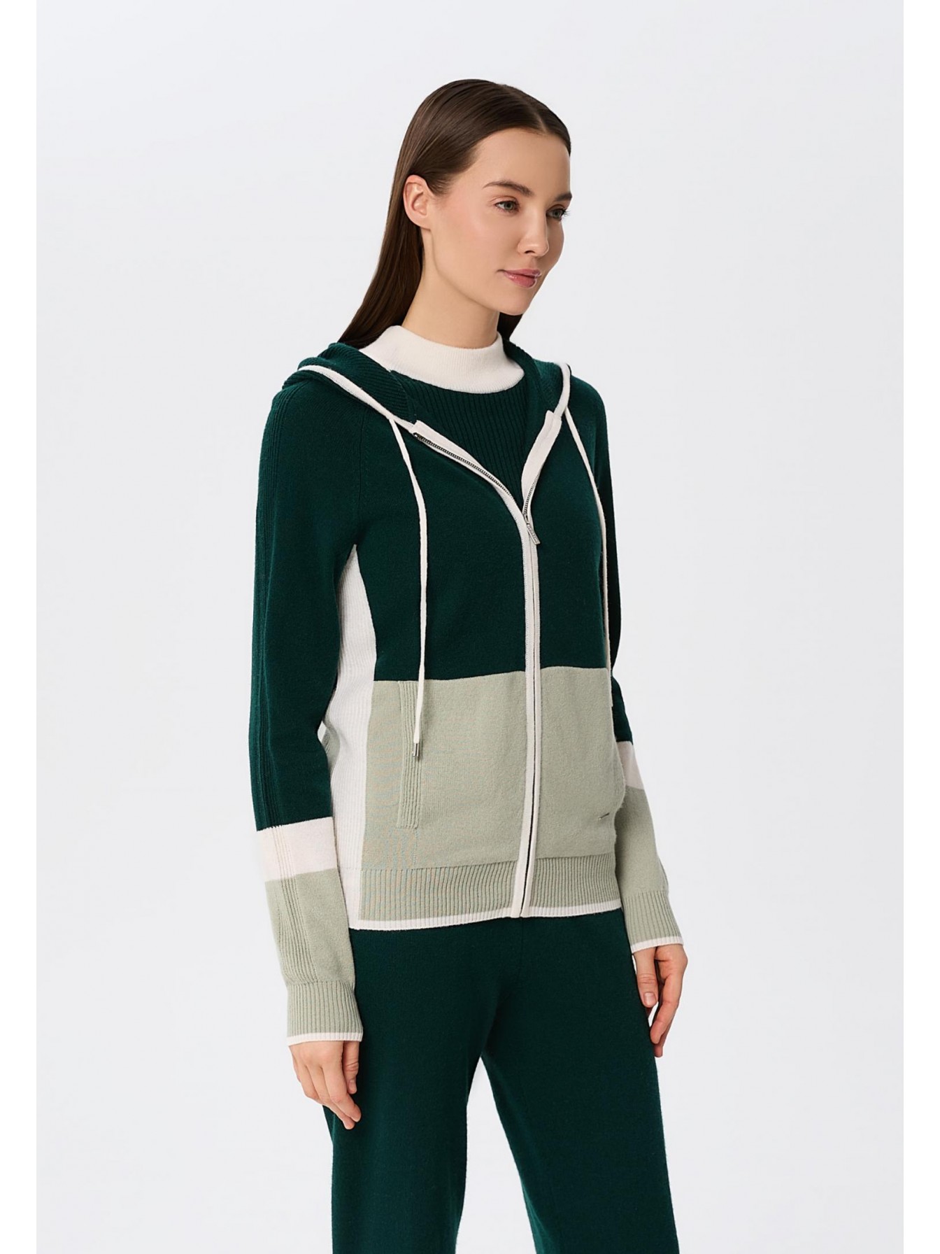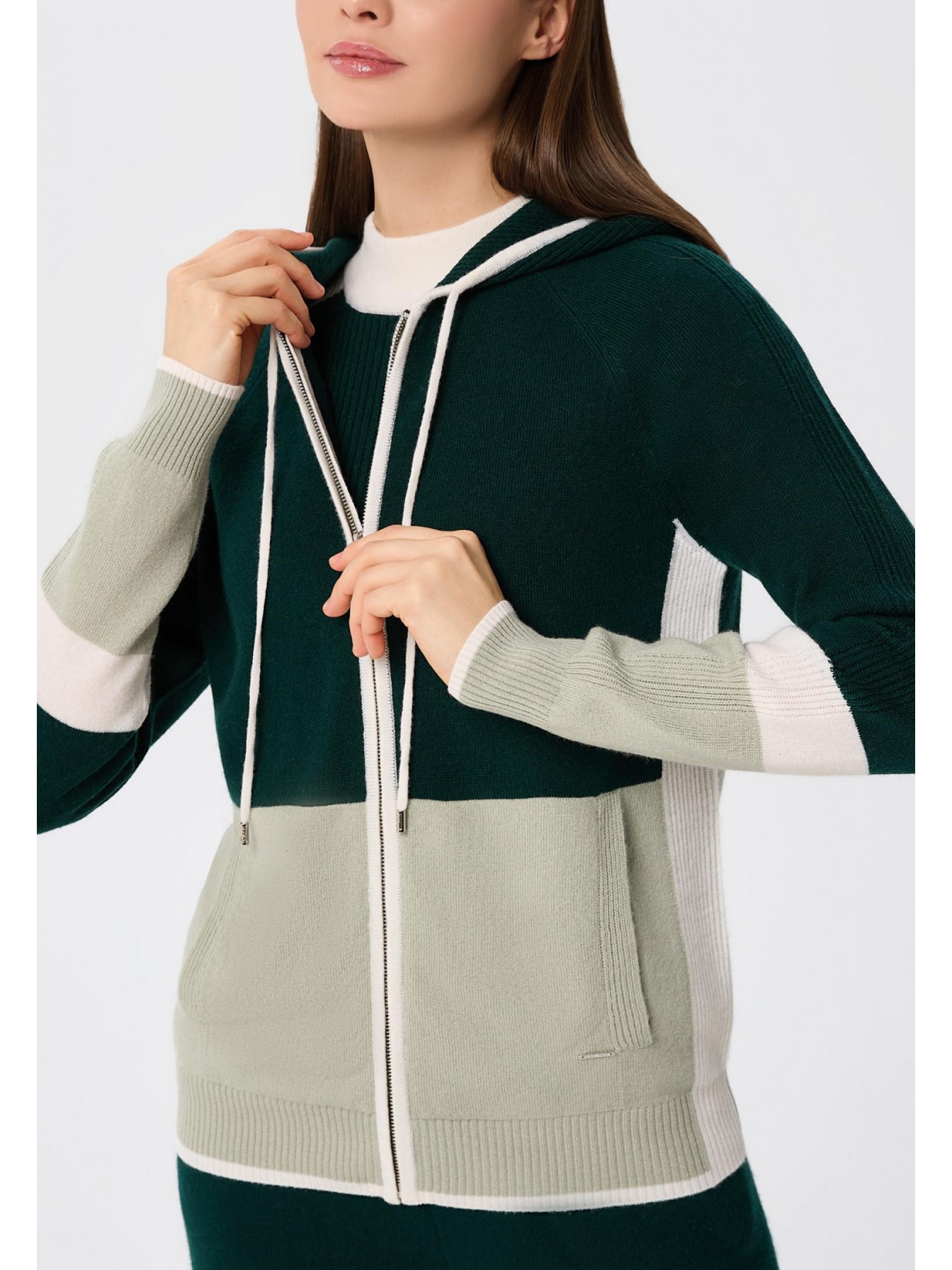 Джемпер с капюшоном на молнии из трикотажа в рубчик. Полуприлегающий силуэт. По линии притачивания молнии и краю капюшона отделка узкими контрастными полосами. Манжеты и низ оформлены вязаной резинкой. Контрастный трехцветный дизайн в стиле колор-блок.