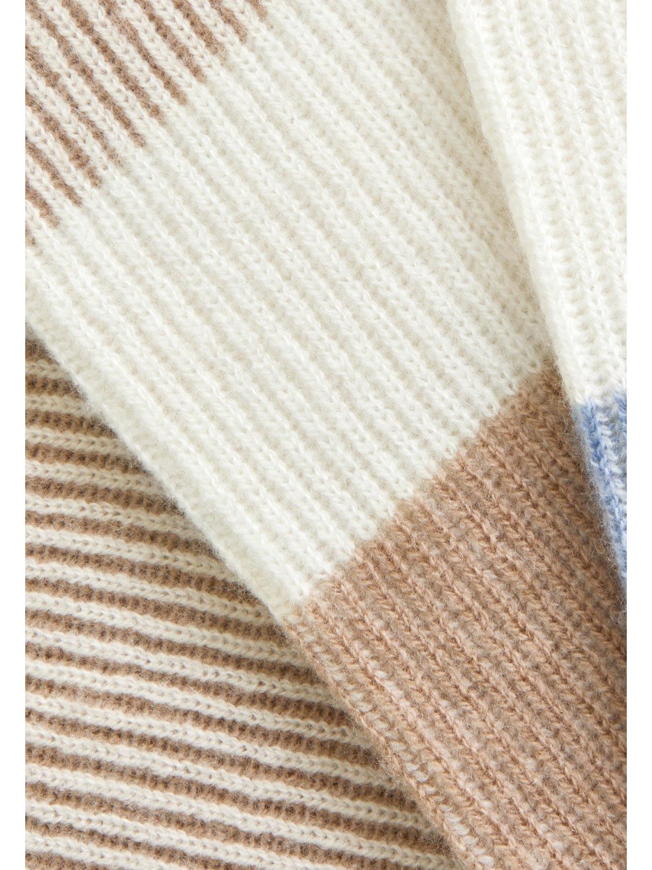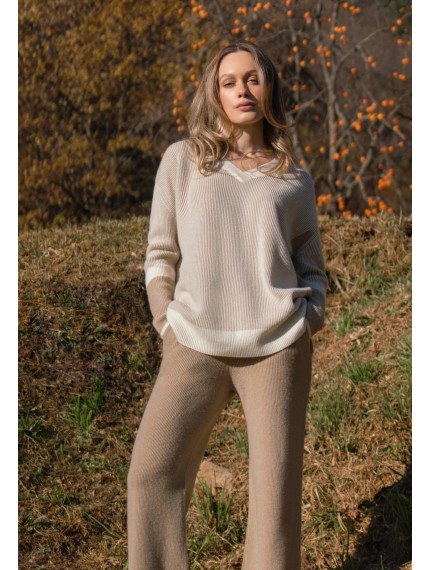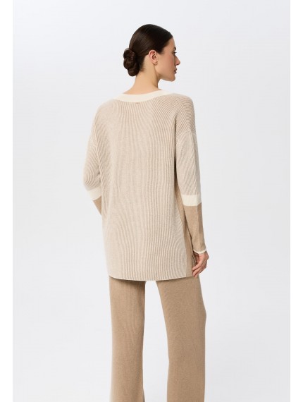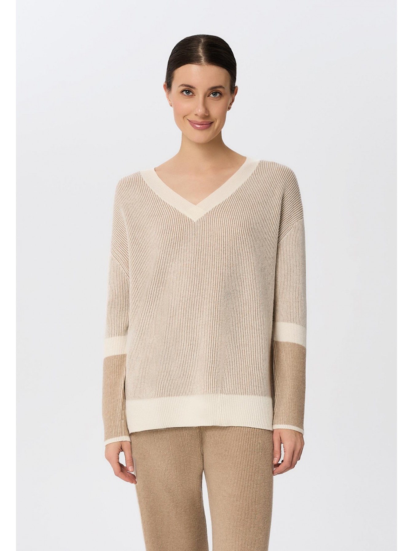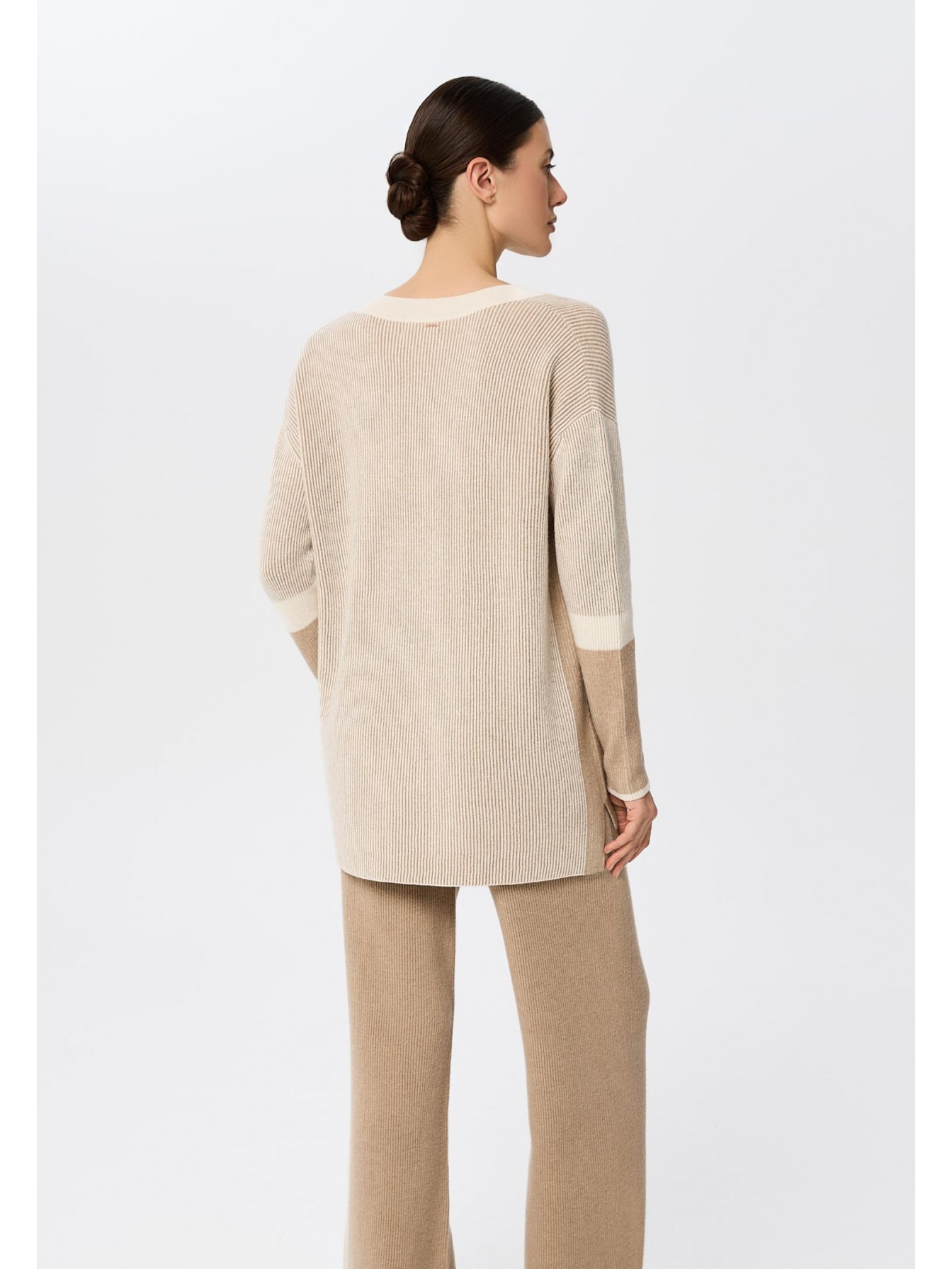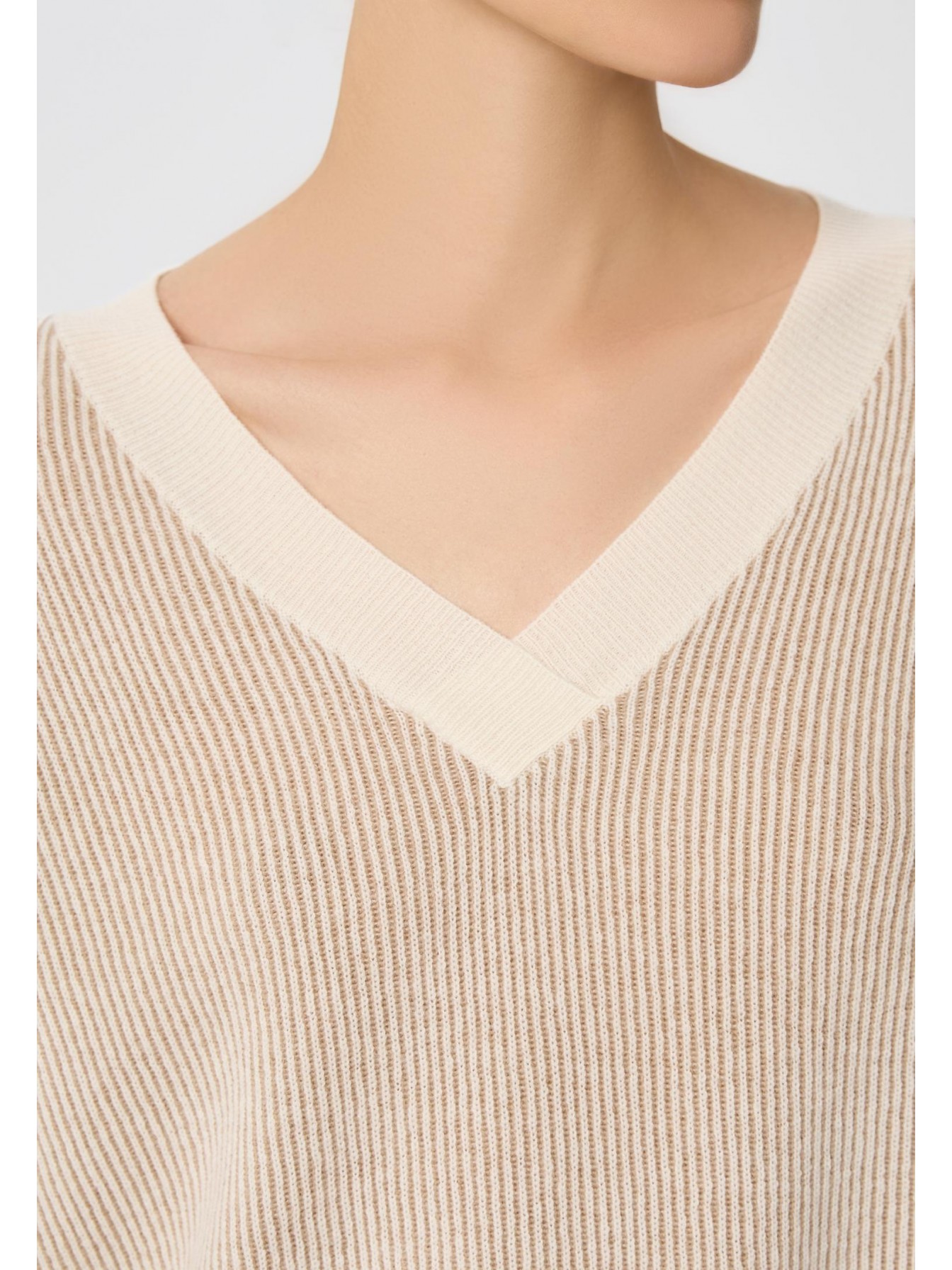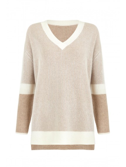 Джемпер с V-образным вырезом из трикотажа в рубчик. Длина до бедер. Двухцветная вязка создает уникальный объемный рисунок. Широкие контрастные полосы по горловине, рукавам, по бокам и низу изделия. Асимметричный крой по низу: спинка длиннее переда. Боковые разрезы.