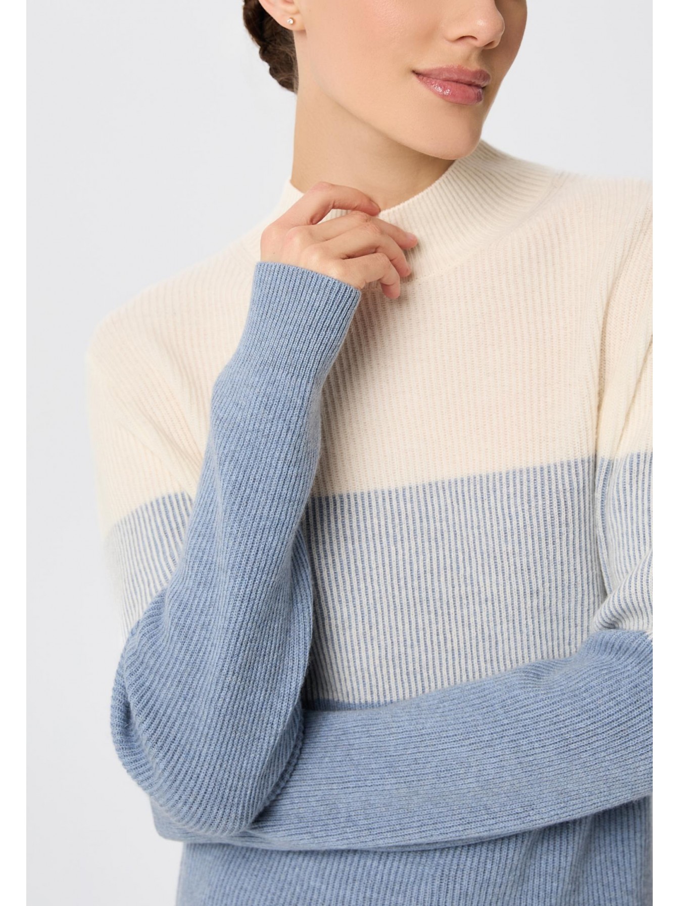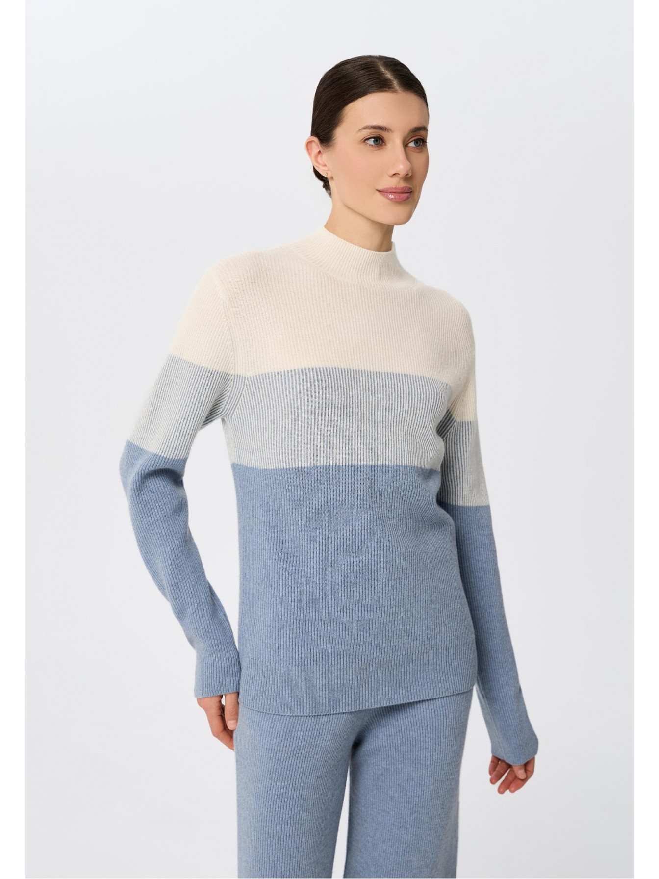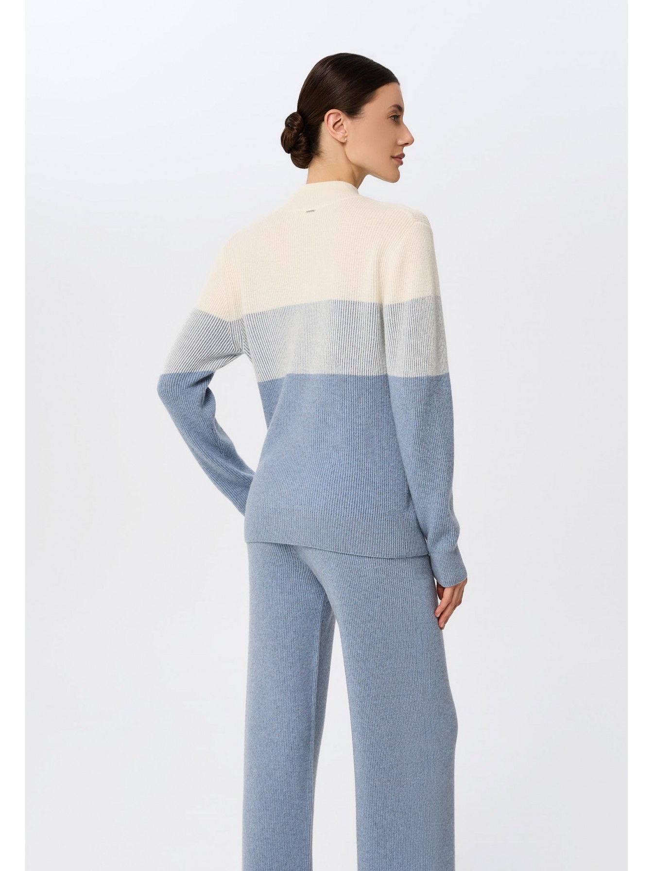 Свитер из трикотажа в рубчик с воротником-стойкой. Полуприлегающий силуэт, длина до бедер. Воротник, низ изделия и низ рукава выполнены вязаной резинкой. Двухцветная вязка создает уникальный объемный рисунок.