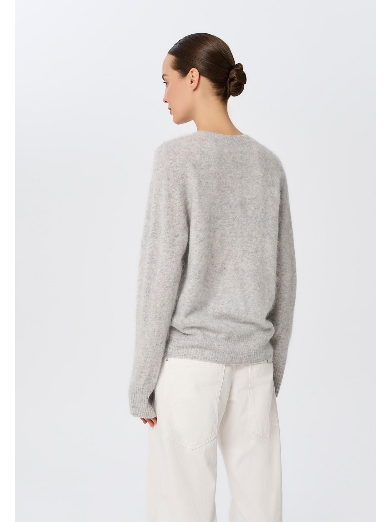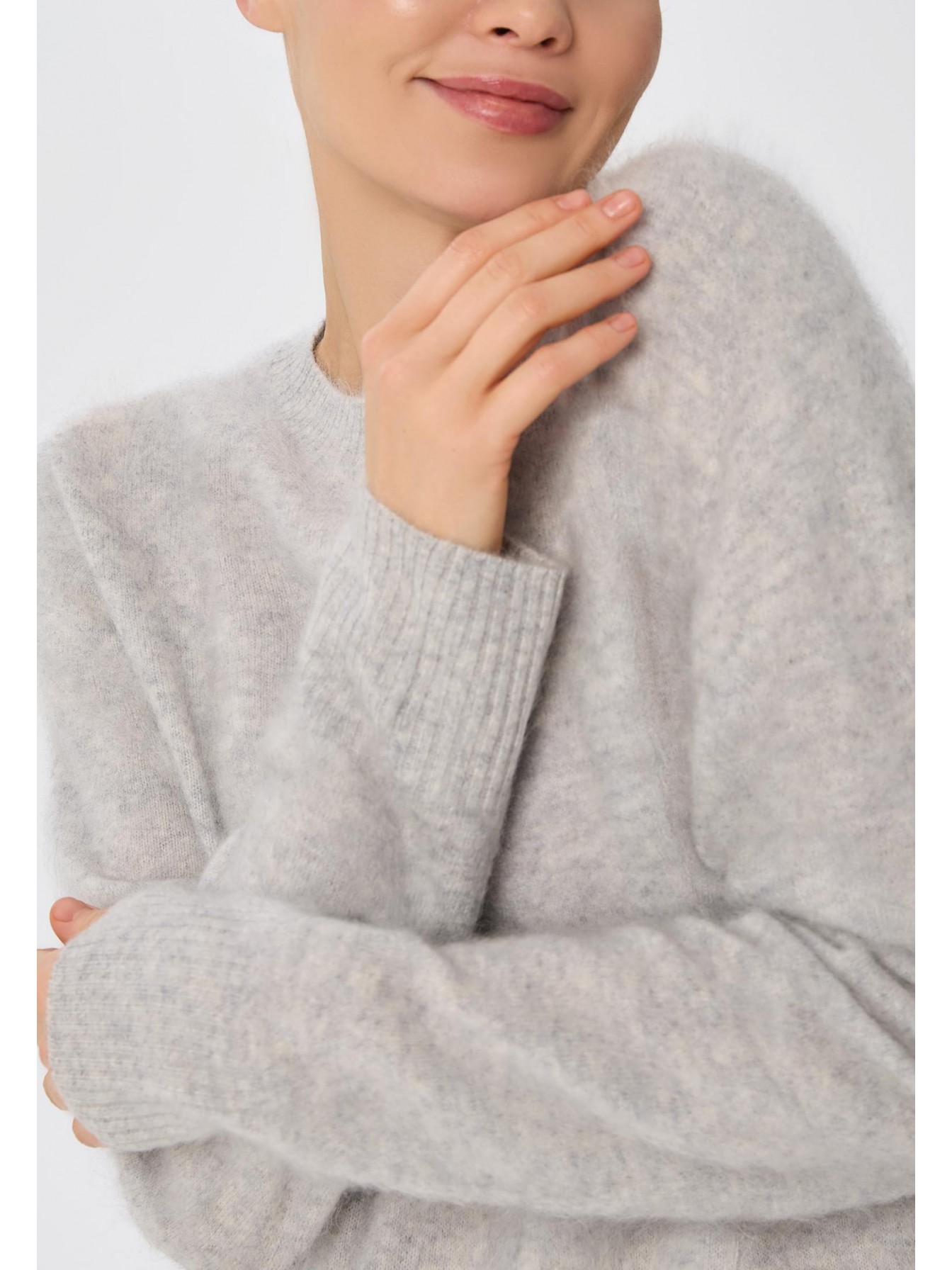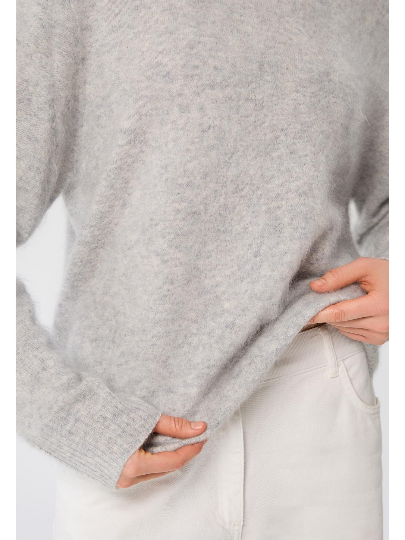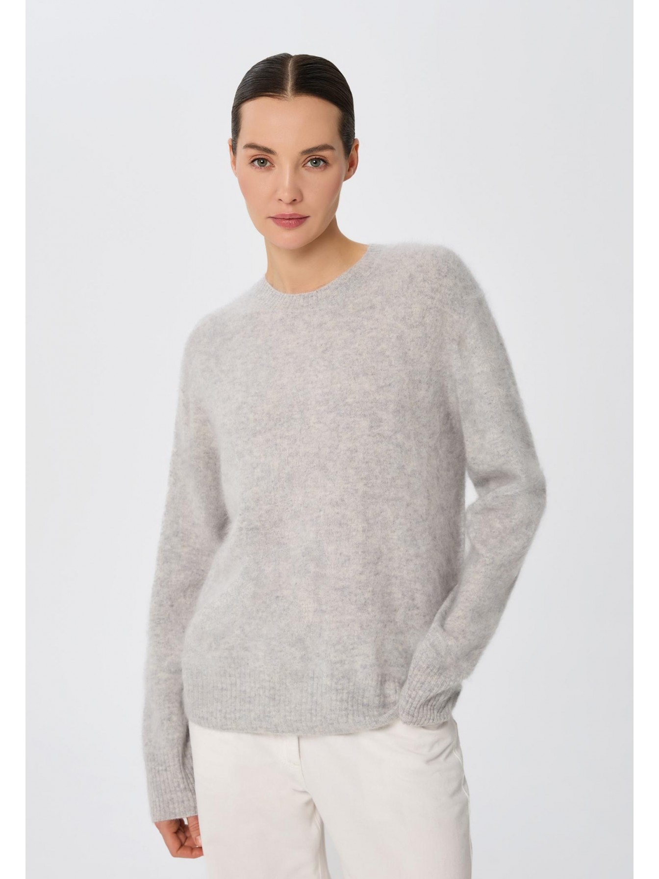 Джемпер свободного кроя из 100% пушистого кашемира. Роскошная воздушная текстура brushed cashmere получается благодаря ручному расчесыванию пряжи. Особый процесс изготовления шерсти позволяет добиться ворсистости и невероятной мягкости. Длина до бедер. Длинный рукав.