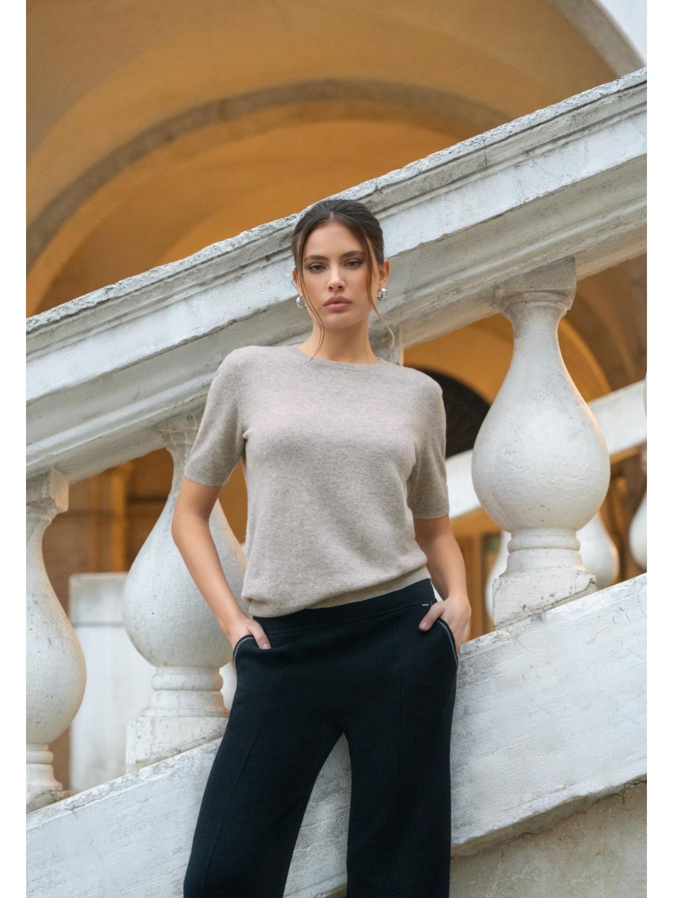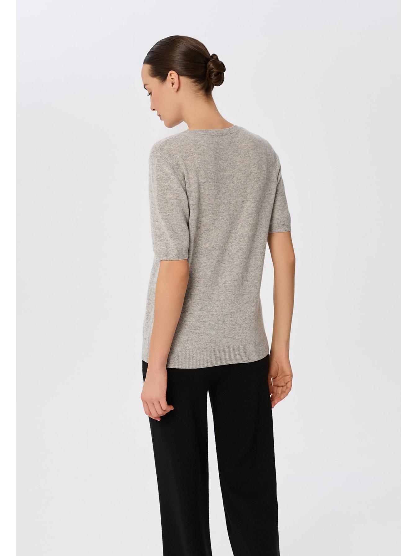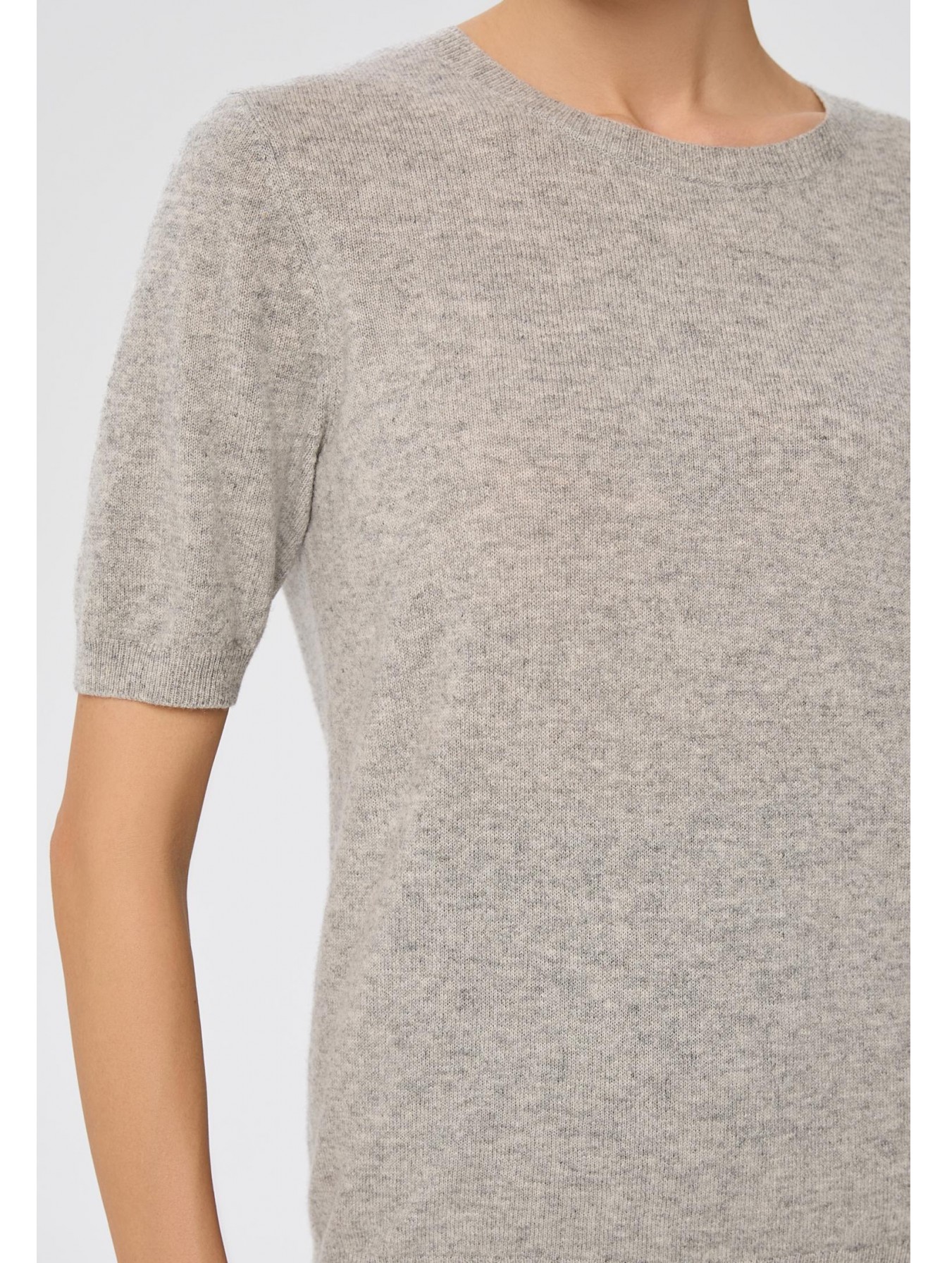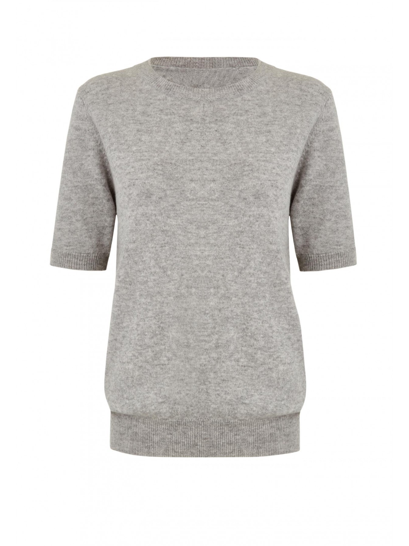 Джемпер с коротким рукавом. Прямой силуэт. Круглый вырез горловины. Низ рукава, низ изделия и горловина оформлены вязаной резинкой. Современная практичная модель для базового гардероба.