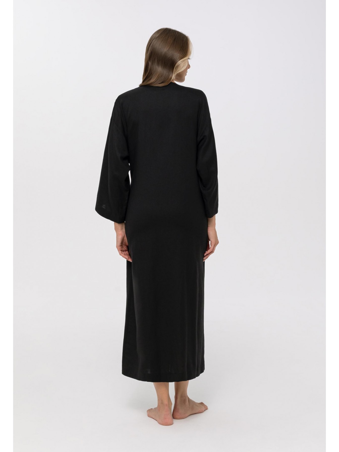 Кимоно свободного кроя изо льна и вискозы на запах. Боковые карманы. Спущенное плечо, заниженная пройма. Втачной рукав 3/4. Длина ниже уровня колен.