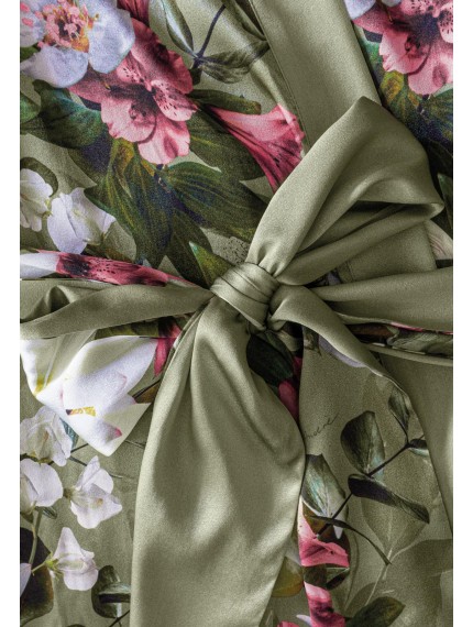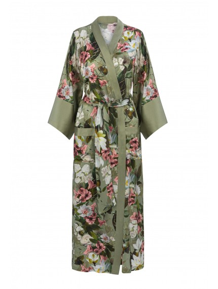 Длинное шелковое кимоно свободного кроя на поясе. Длина ниже уровня колен. Широкий втачной рукав. Спереди накладные карманы. Отделка бортов и низа рукавов однотонным шелком.