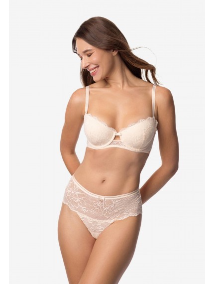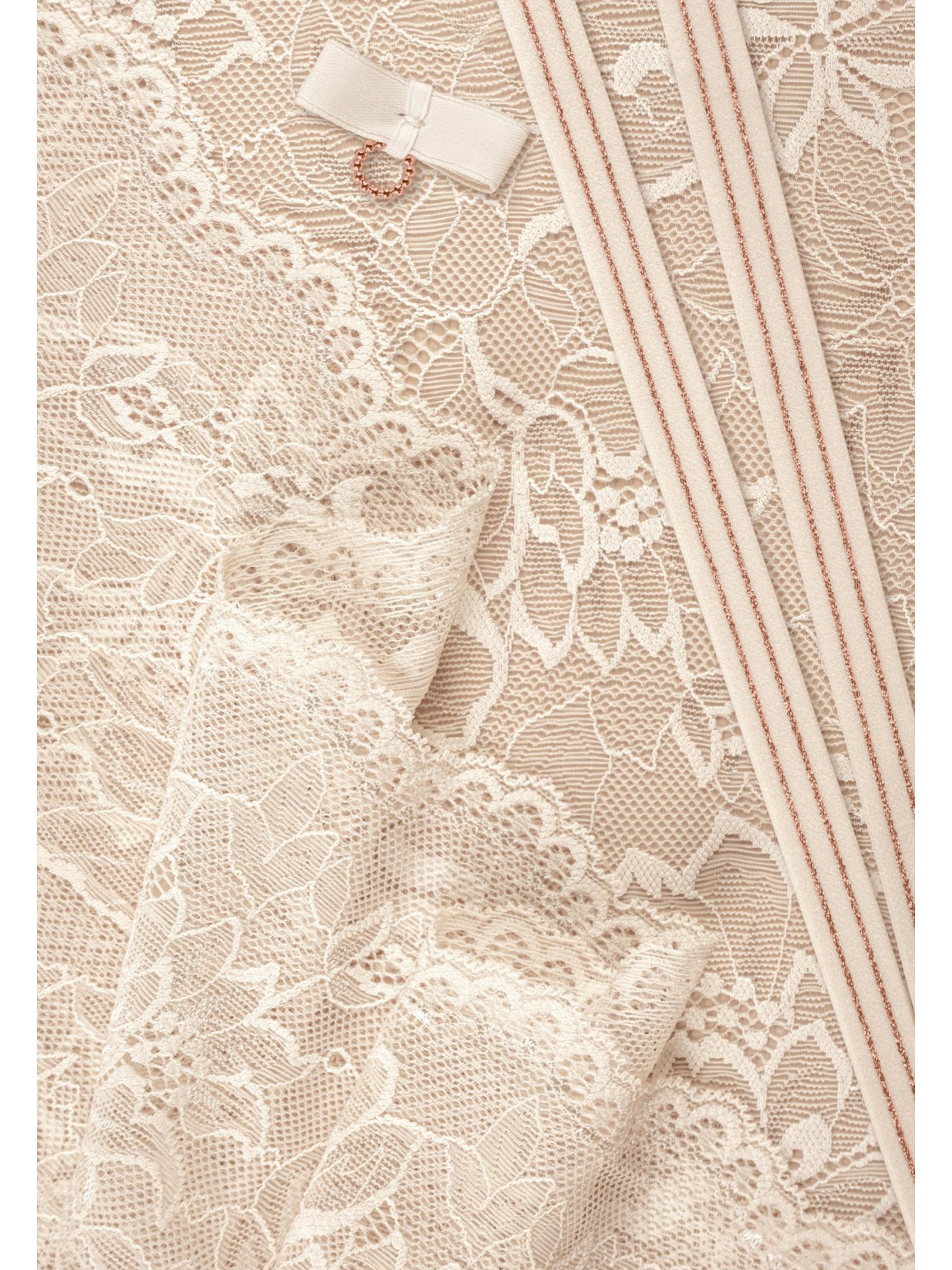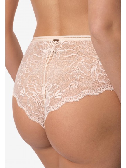 Трусы-хипстеры со средней линией талии. Пояс из эластичной тесьмы декорирован золотой нитью. Передняя и задняя деталь из кружева с ажурными краями.