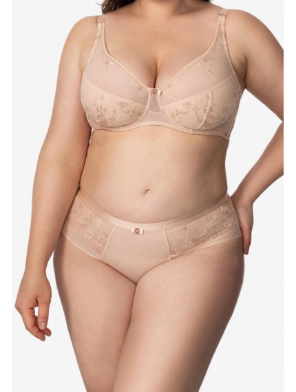 Трусы-бразилиана со средней линией талии. Пояс выполнен из эластичной тесьмы. Передняя деталь из гладкой микрофибры и сетки с вышивкой. Задняя деталь из эластичной сетки с вышивкой.
