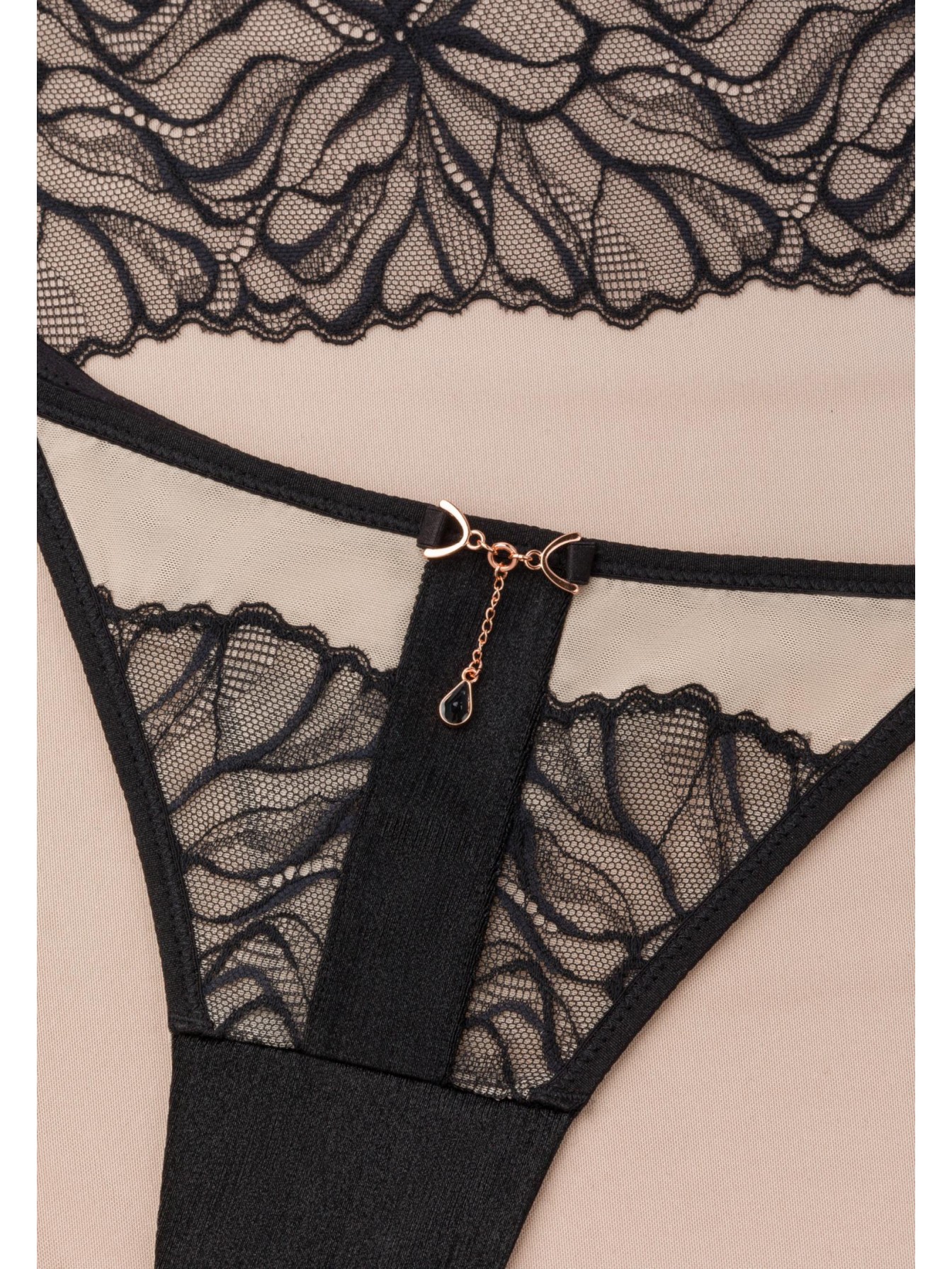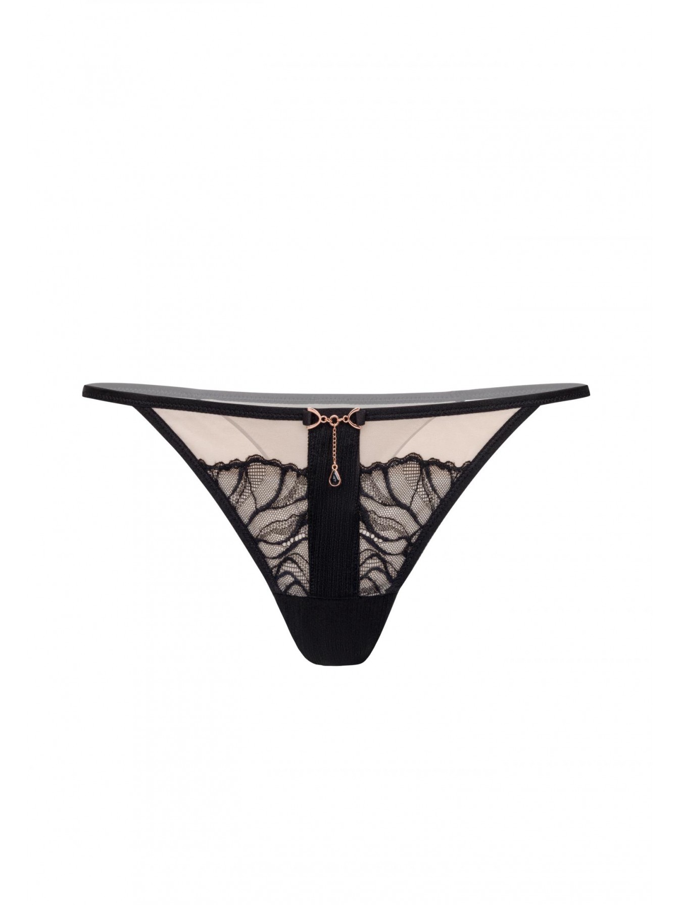 Трусы-стринги с заниженной линией талии. Передняя деталь из кружева на подкладке из сетки. Задняя деталь из микрофибры. Пояс выполнен из эластичной тесьмы.