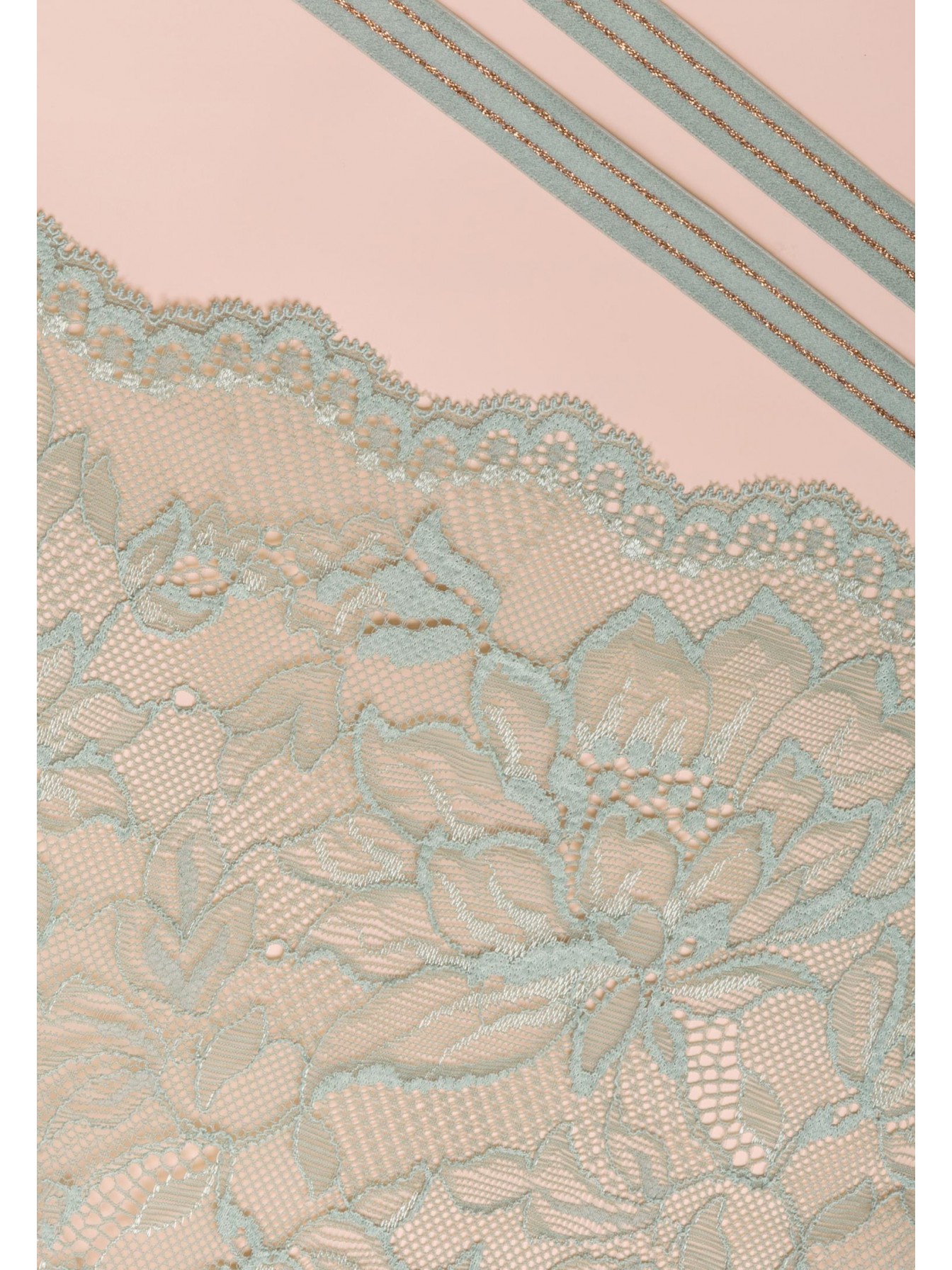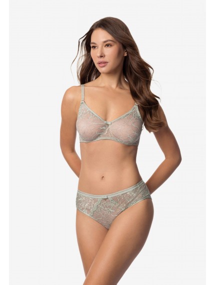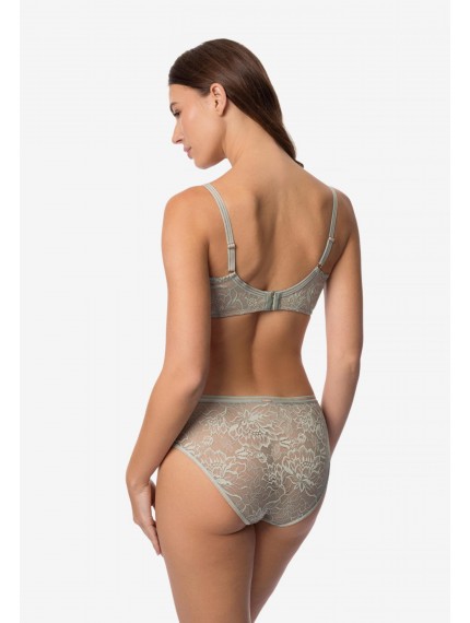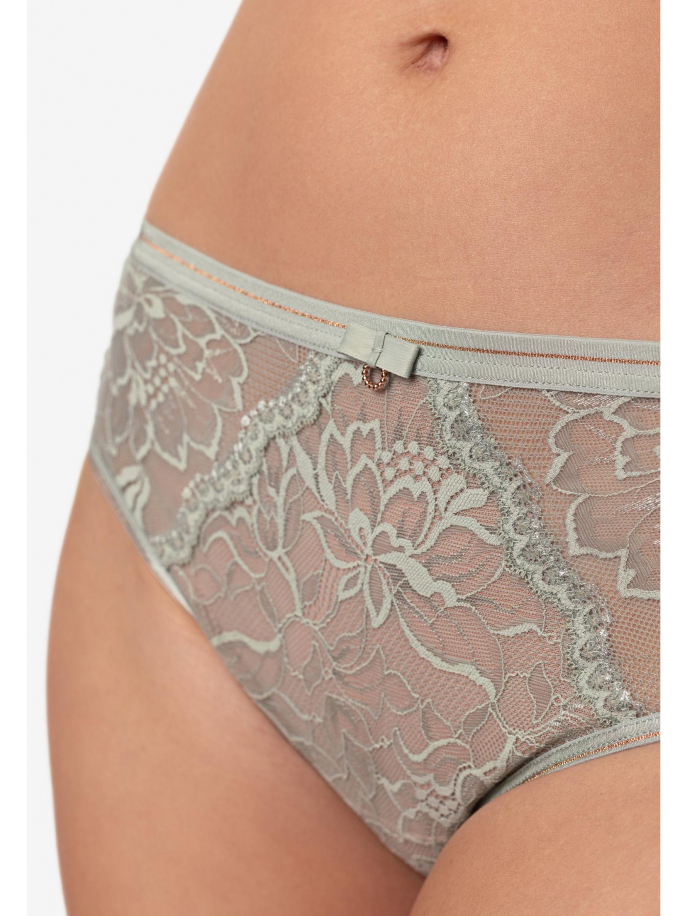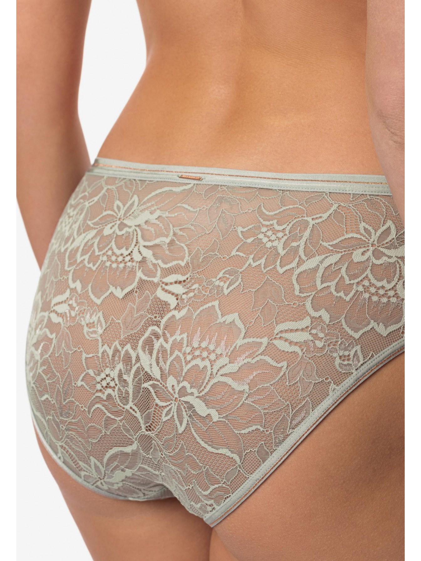 Трусы-брифы со средней линией талии. Передняя деталь из кружева на подкладке из сетки. Пояс из эластичной тесьмы с золотой нитью.