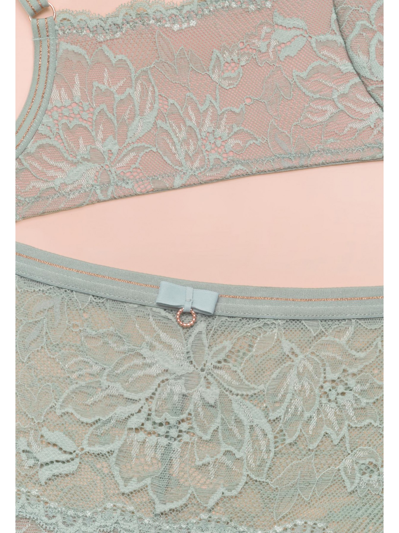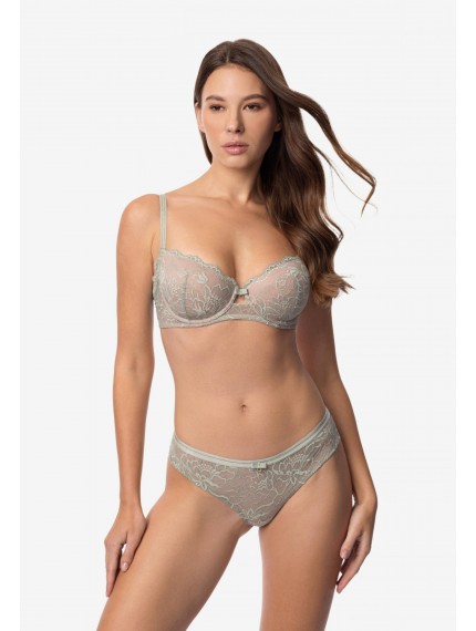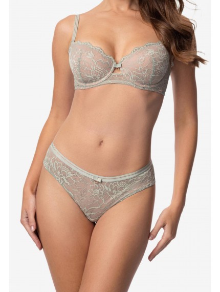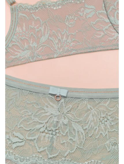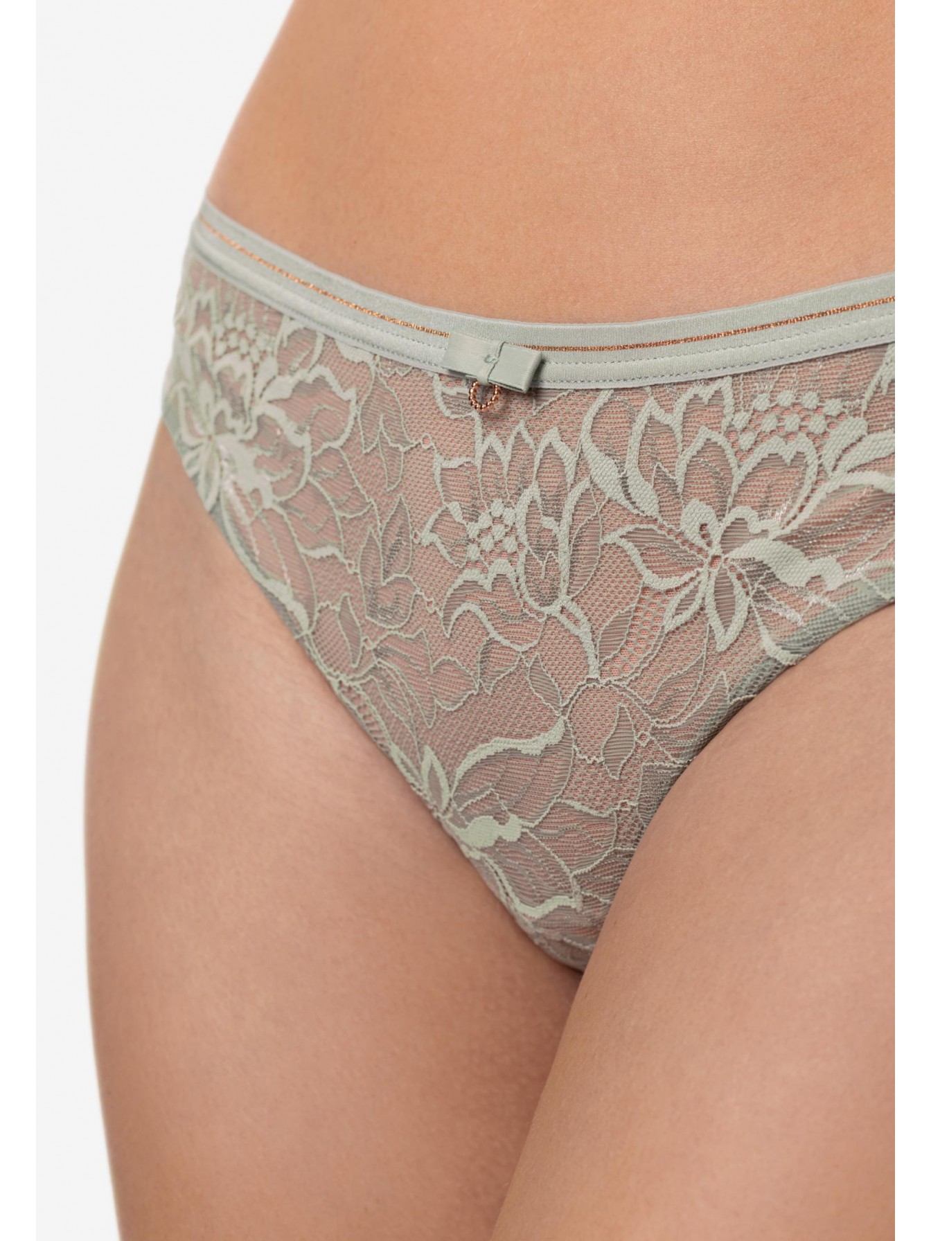 Трусы-бразилиана со средней линией талии. Пояс из эластичной тесьмы декорирован золотой нитью. Передняя деталь из кружева на подкладке из сетки. Задняя деталь из кружева с ажурными краями.