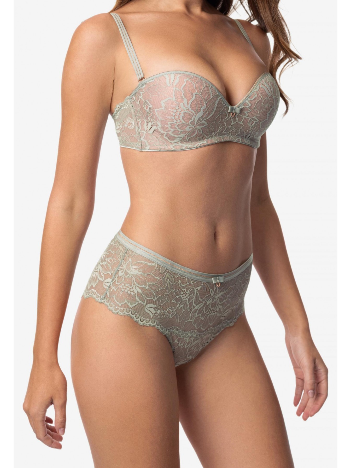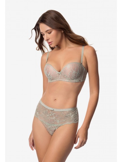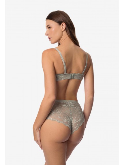 Трусы-хипстеры со средней линией талии. Пояс из эластичной тесьмы декорирован золотой нитью. Передняя и задняя деталь из кружева с ажурными краями.