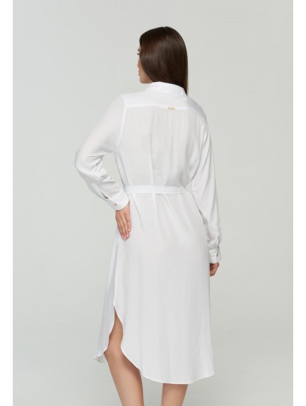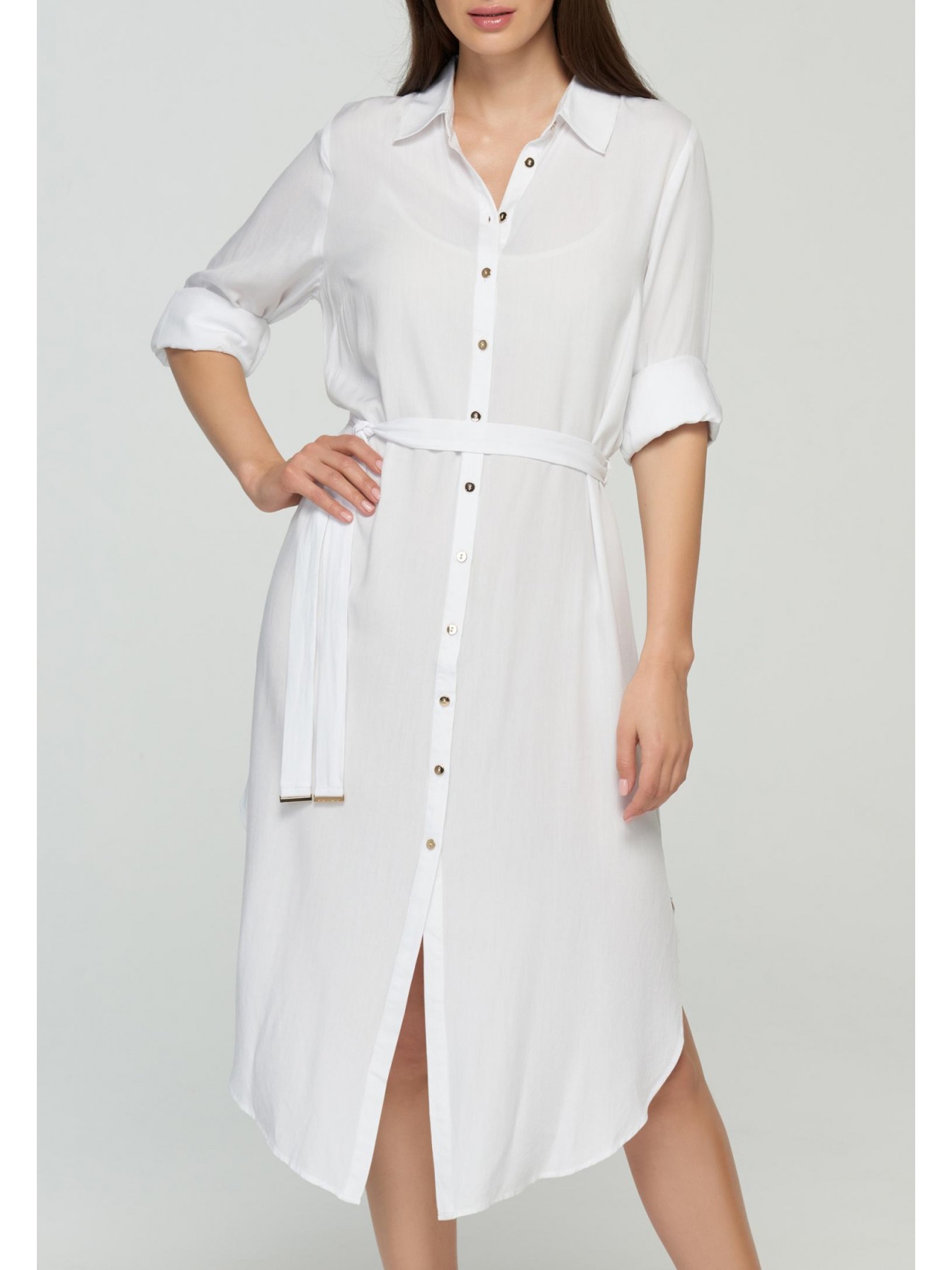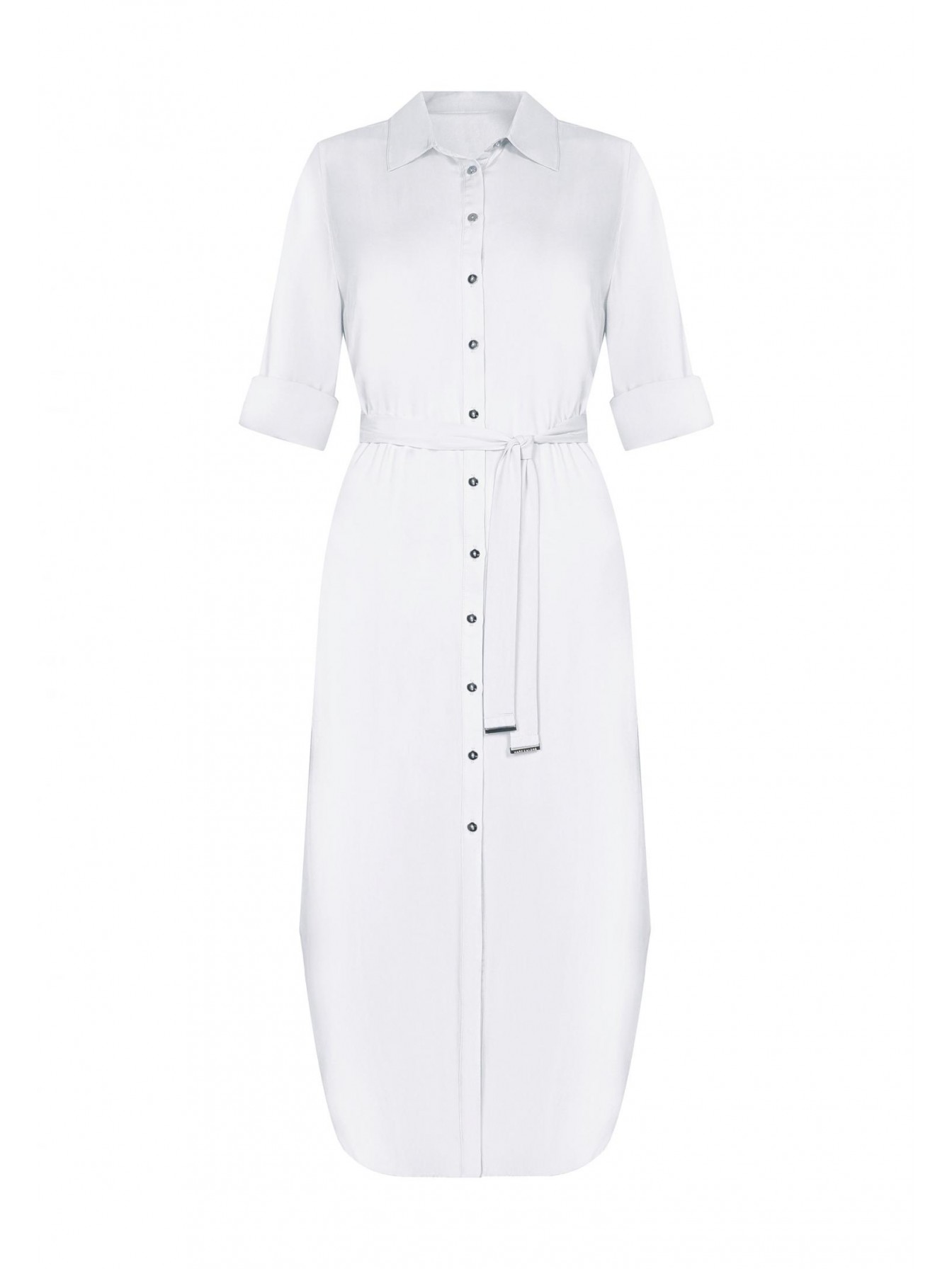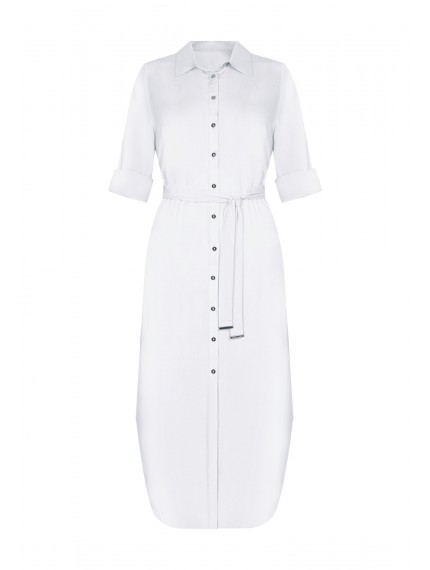 Платье-рубашка прямого кроя с застежкой на пуговицах. Съемный пояс. Длина ниже уровня колен. Карманы в боковых швах. Длина рукава регулируется патой с застежкой.