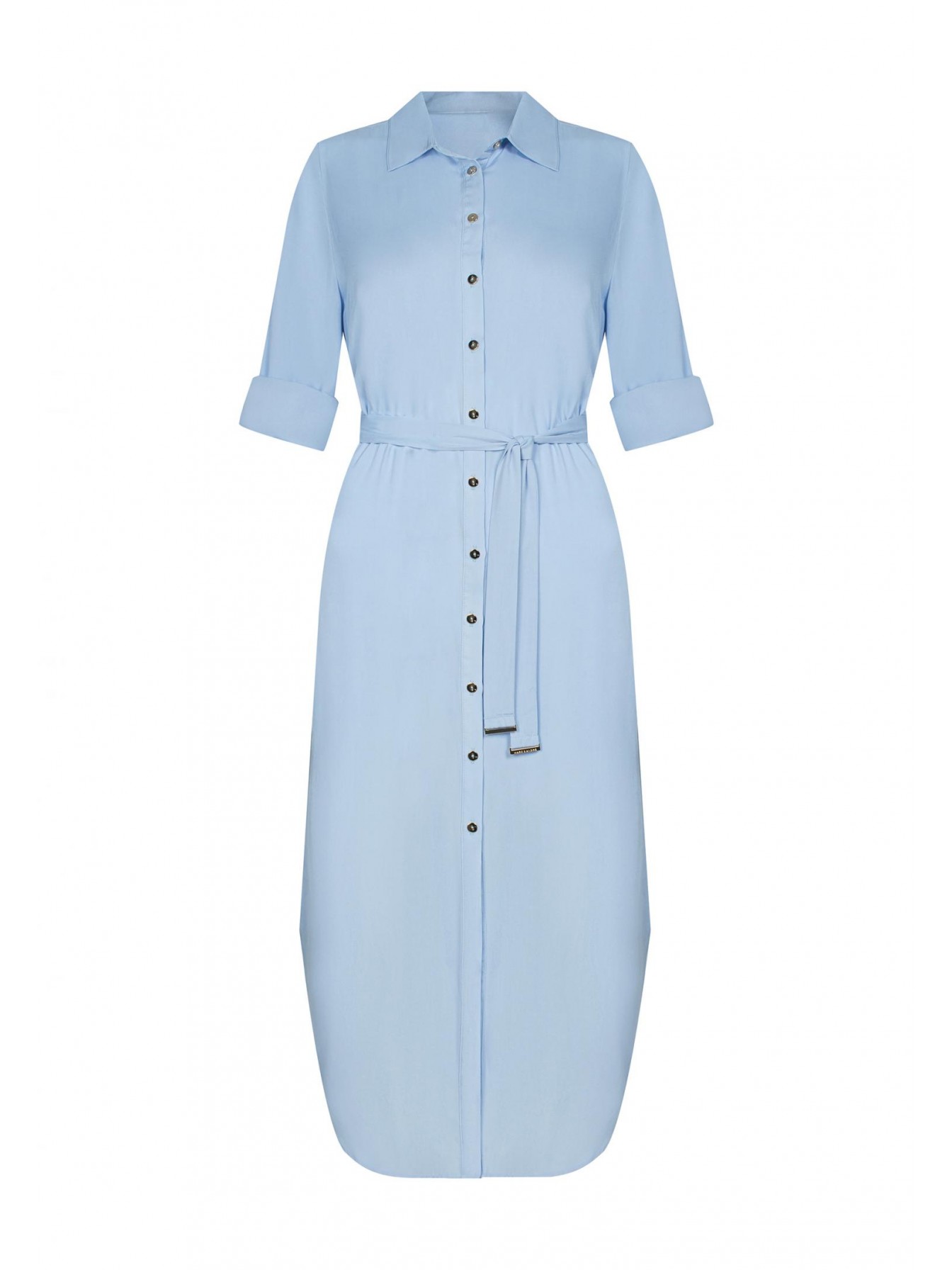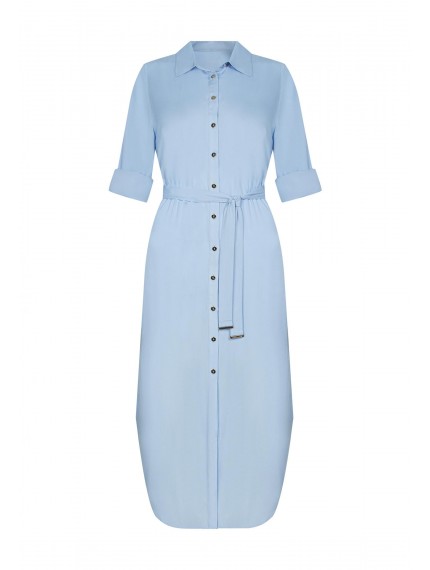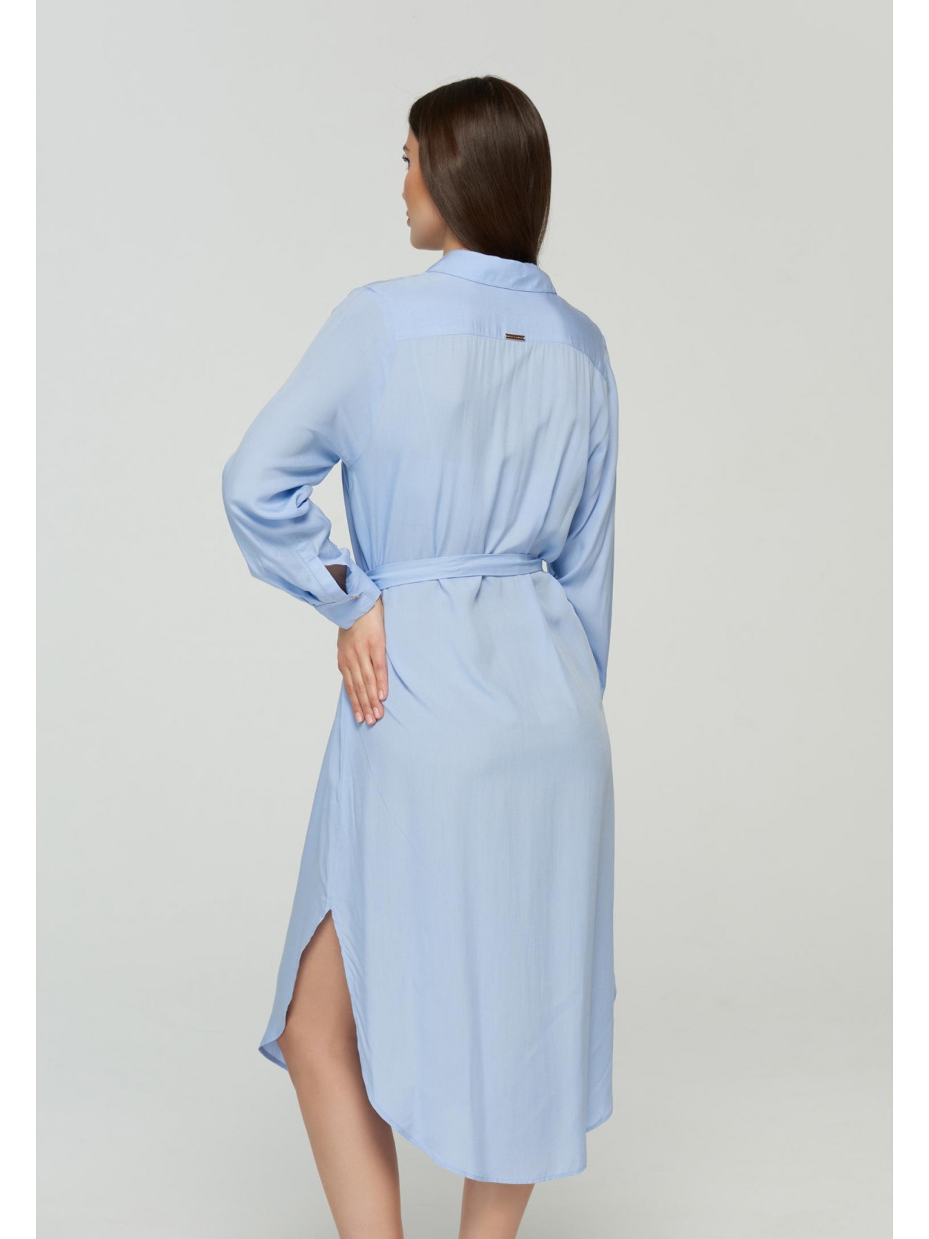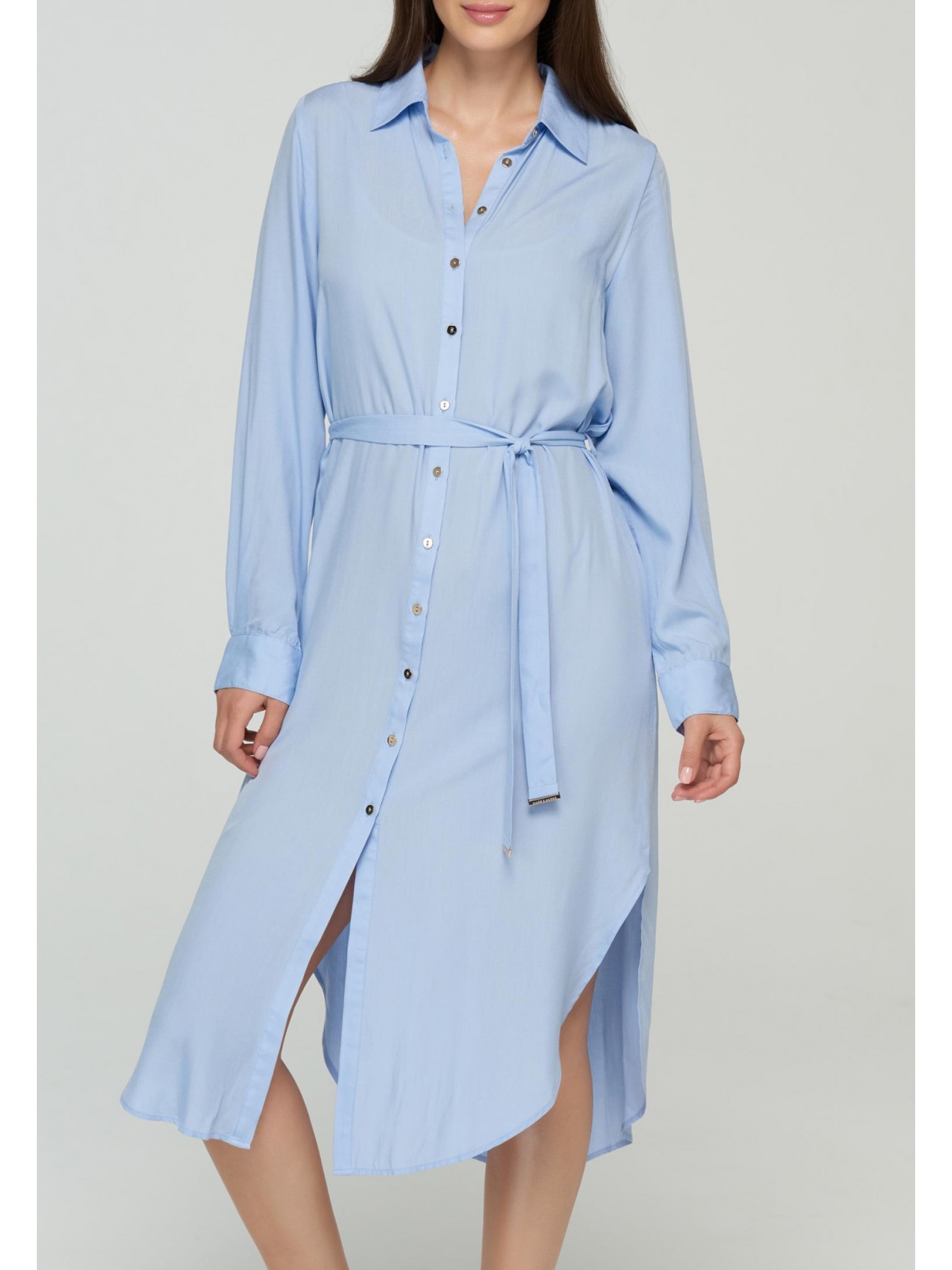 Платье-рубашка прямого кроя с застежкой на пуговицах. Съемный пояс. Длина ниже уровня колен. Карманы в боковых швах. Длина рукава регулируется патой с застежкой.