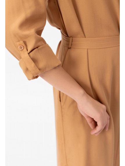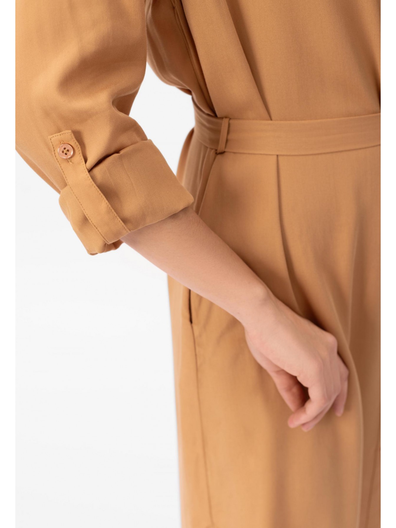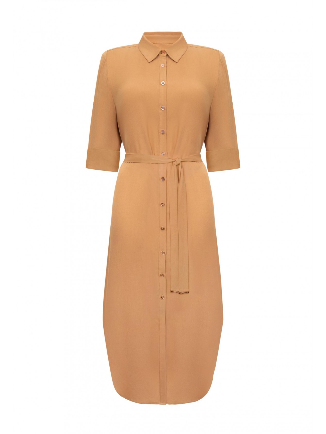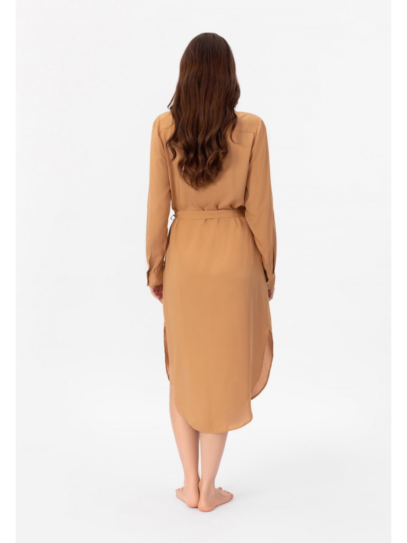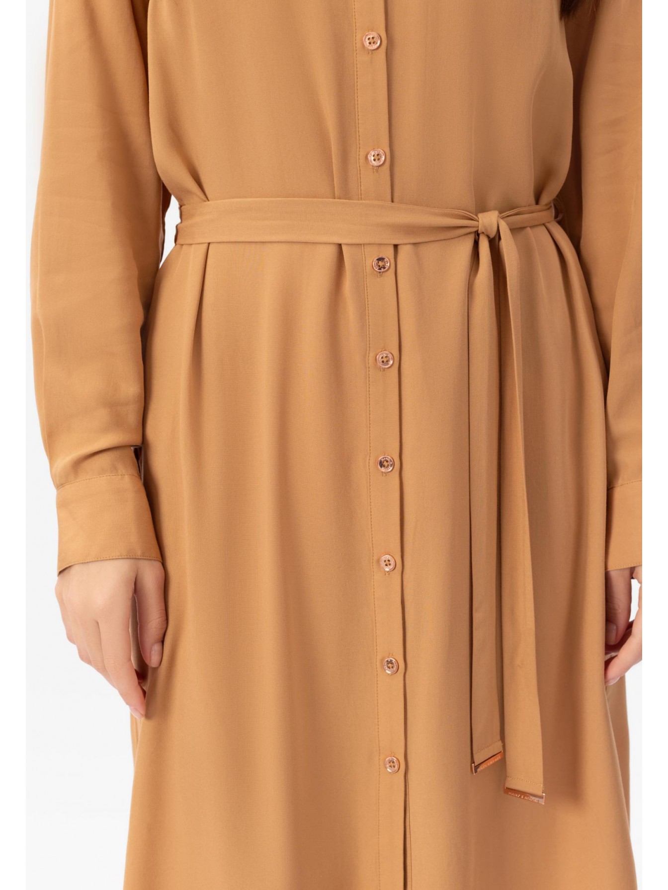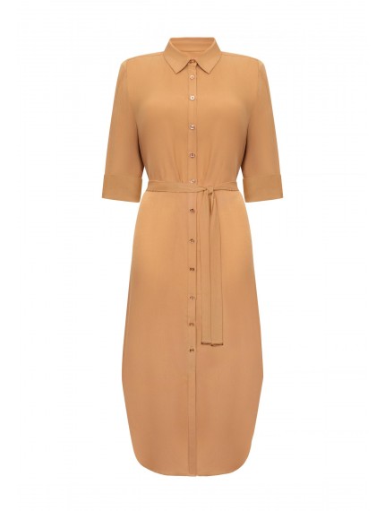 Платье-рубашка прямого кроя с застежкой на пуговицах. Съемный пояс. Длина ниже уровня колен. Карманы в боковых швах. Длина рукава регулируется патой с застежкой.