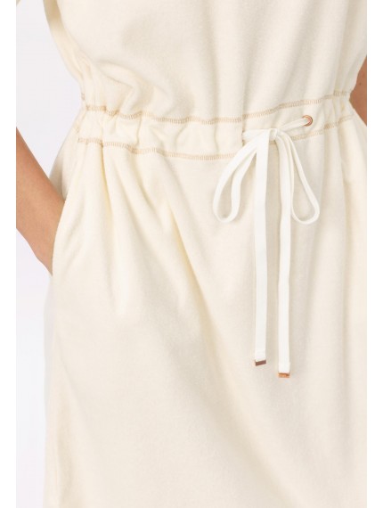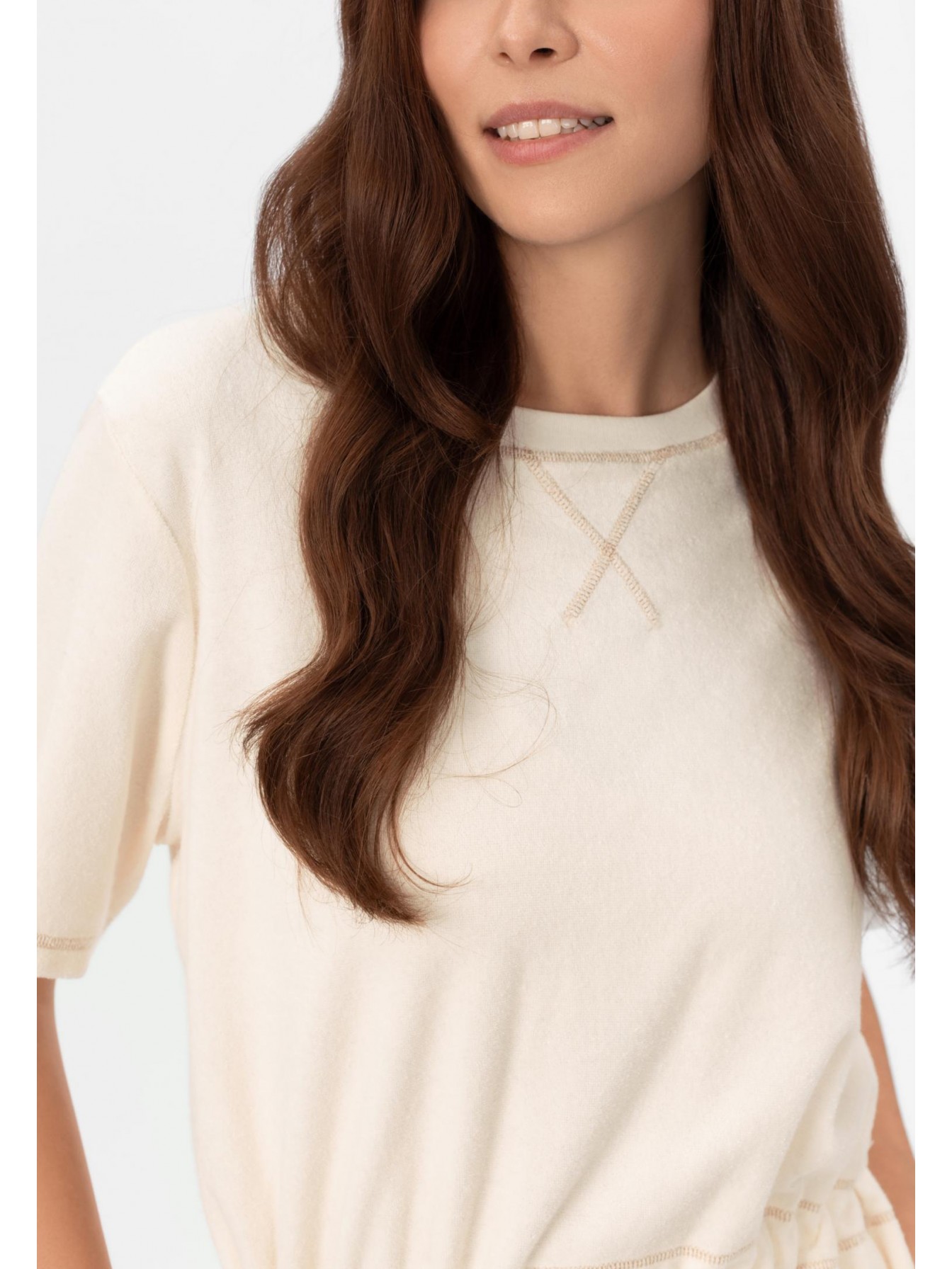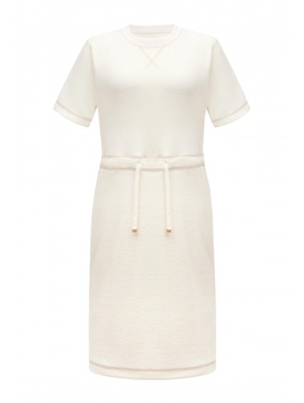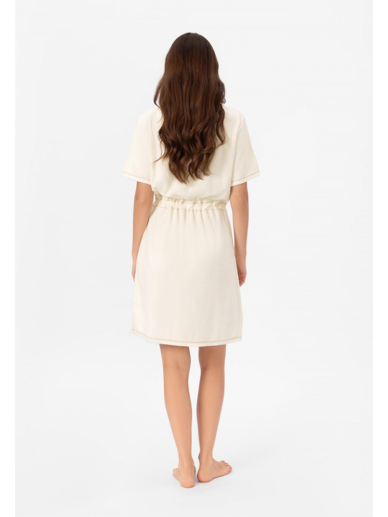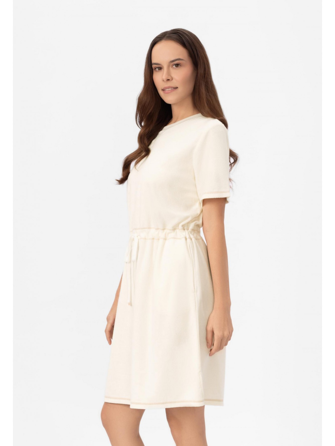 Домашнее платье с коротким рукавом. Круглый вырез горловины оформлен вязаной резинкой. Длина чуть выше уровня колен. Боковые карманы. На линии талии регулируемая кулиска.