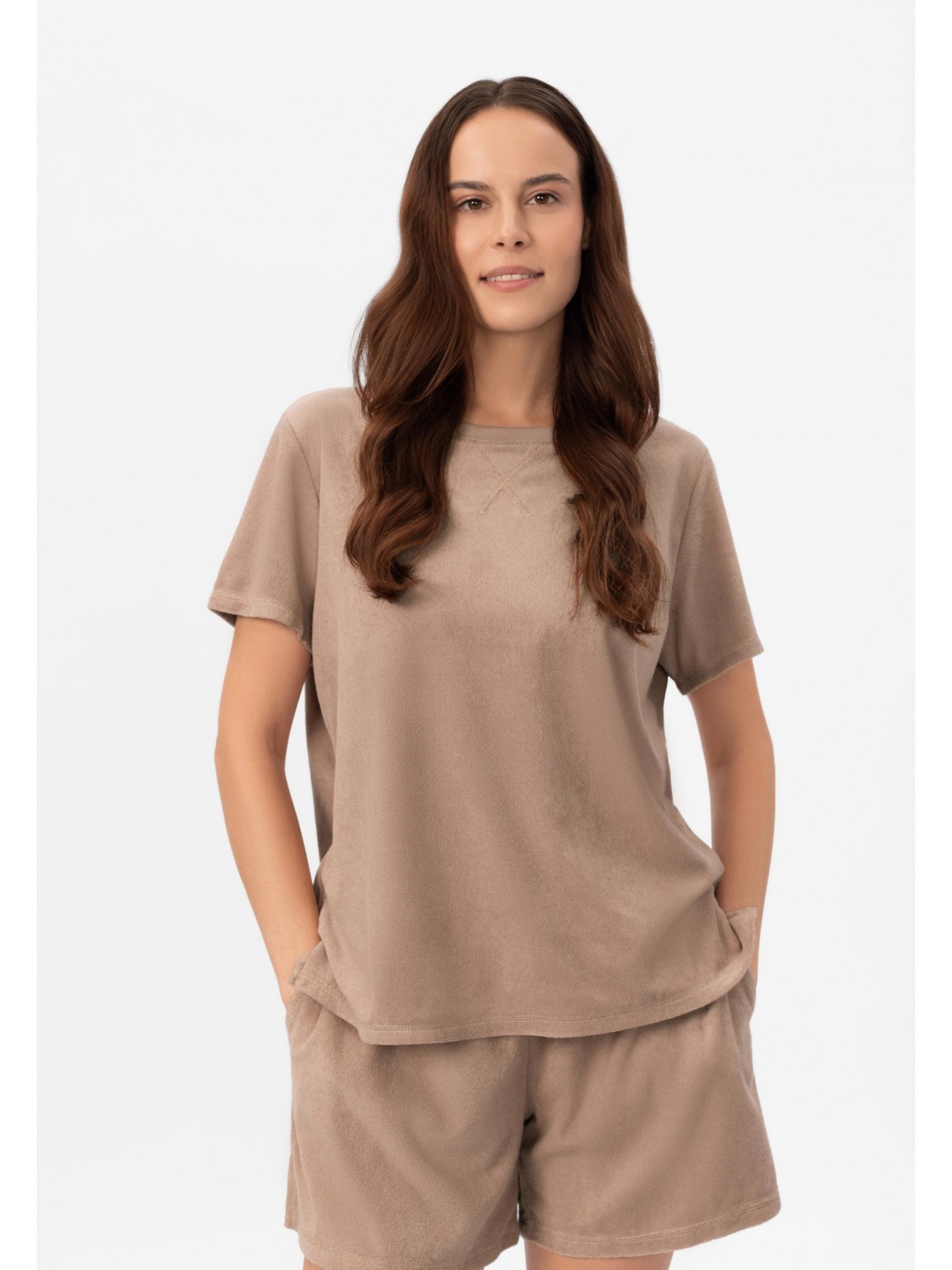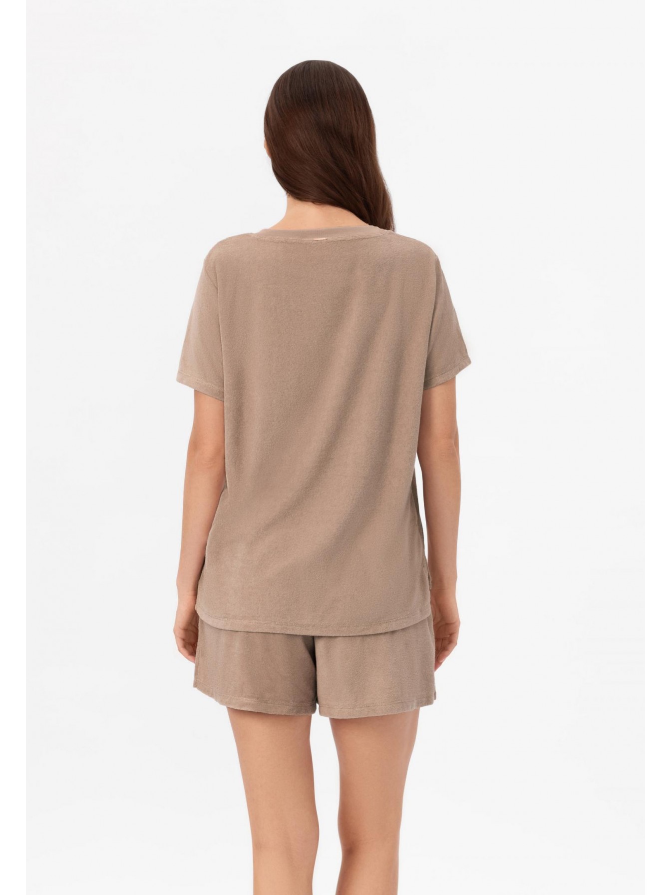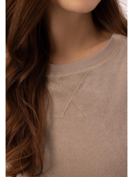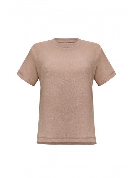 Топ с коротким рукавом. Круглый вырез горловины оформлен вязаной резинкой. Боковые разрезы. Контрастная отделка по нижнему краю изделия, рукавов и по линии талии.