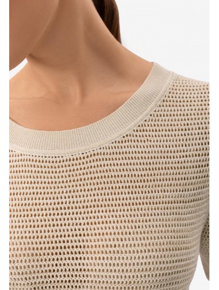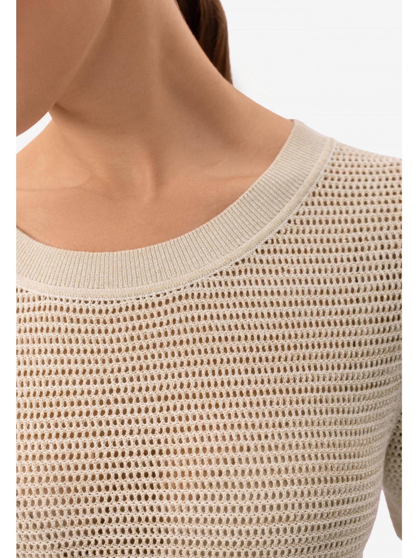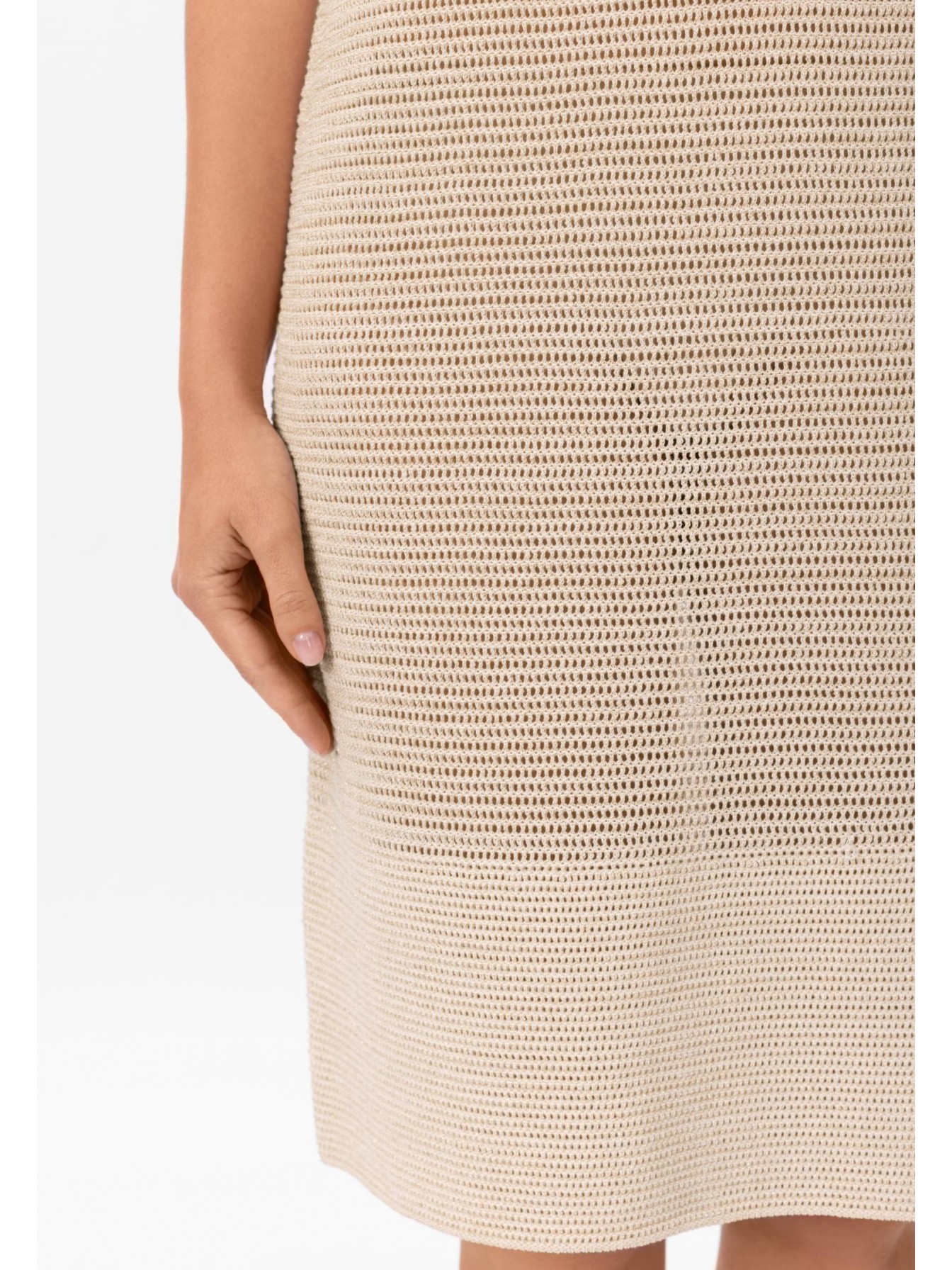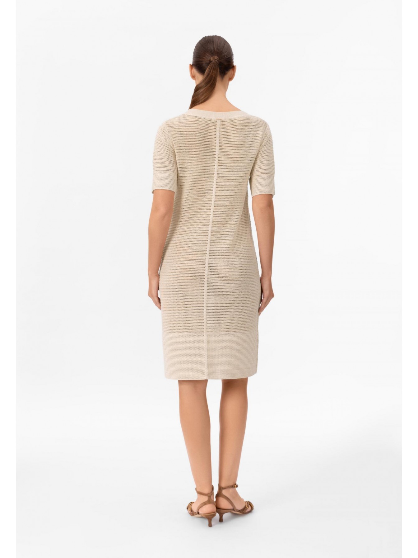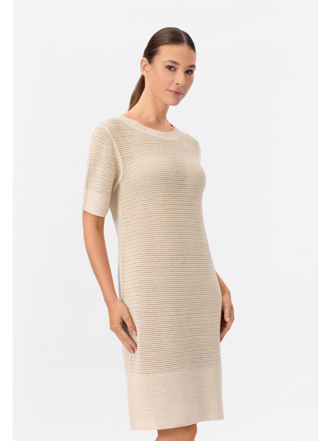 Платье с коротким рукавом из шелка и хлопка. Круглый вырез горловины оформлен вязаной резинкой. Втачной рукав. Длина выше колена. Спинка декорирована вертикальной полосой. Платье выполнено вязкой «кроше» из мягкой пряжи с деликатными вкраплениями тонкой металлизированной нити для лёгкого сияния. Низ изделия и рукавов выполнены плотной вязкой.
