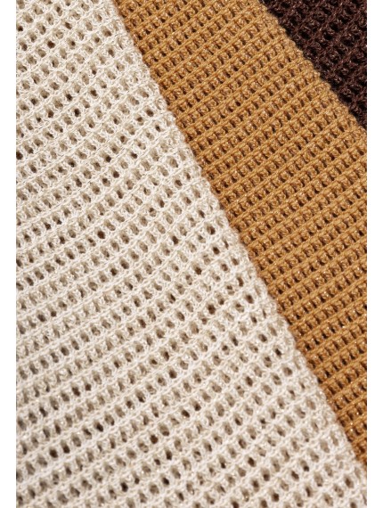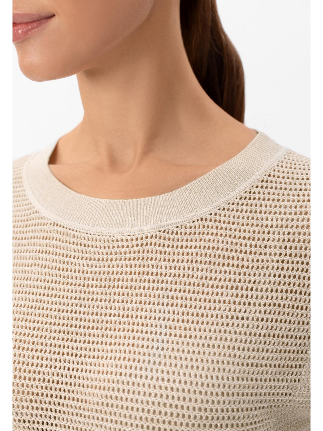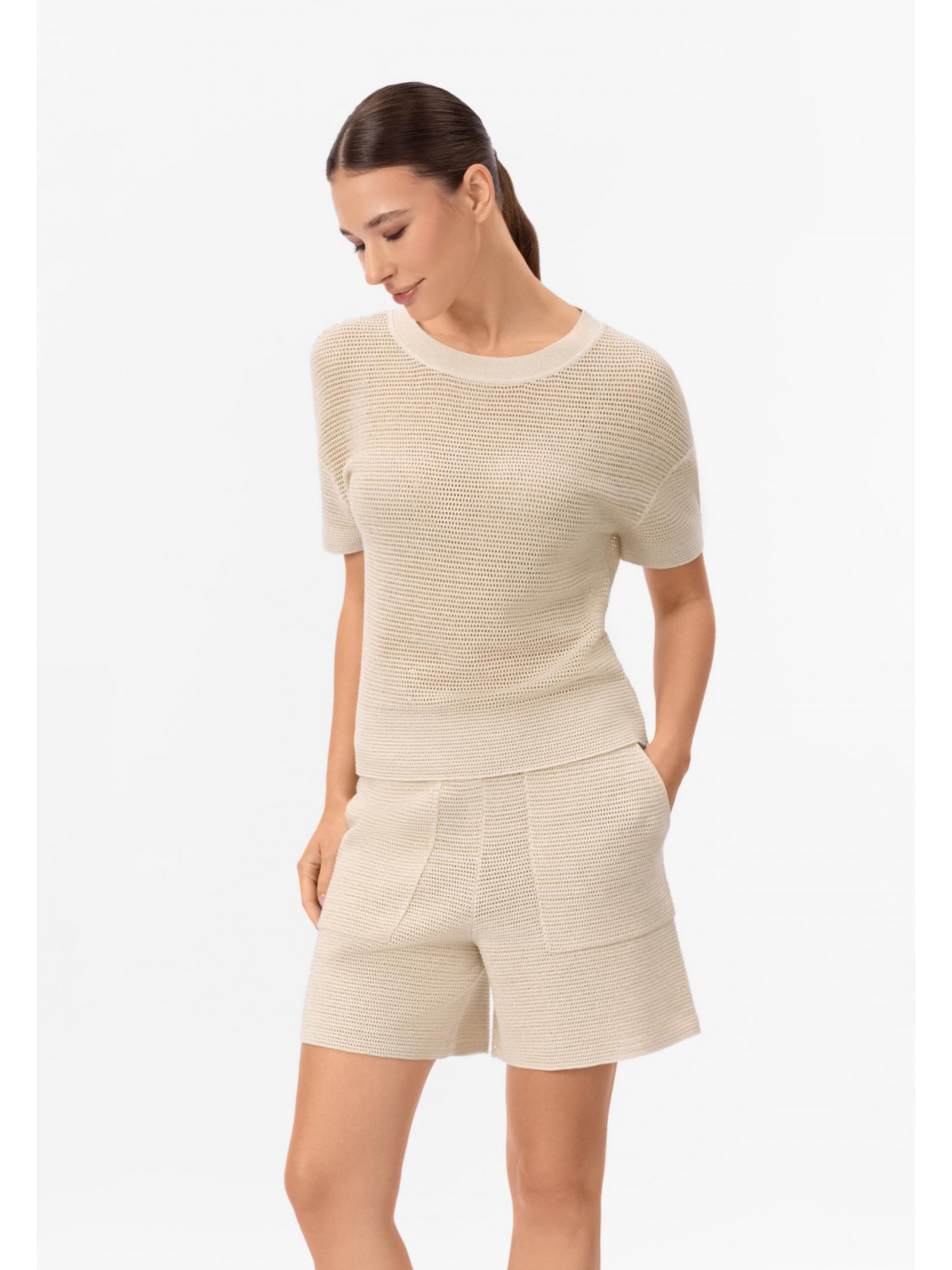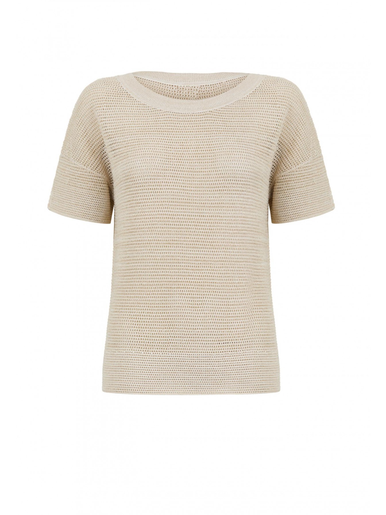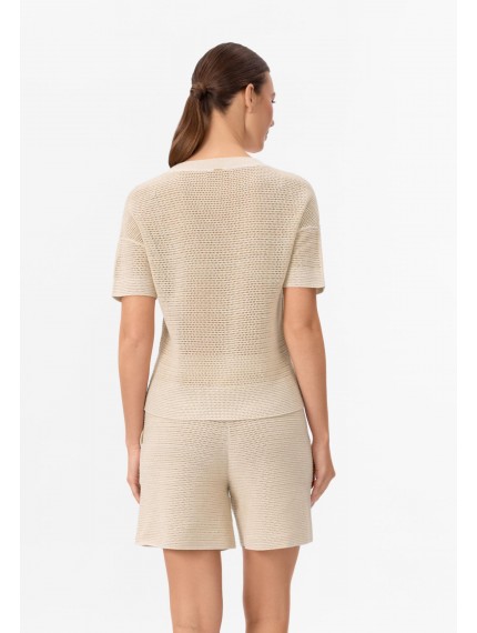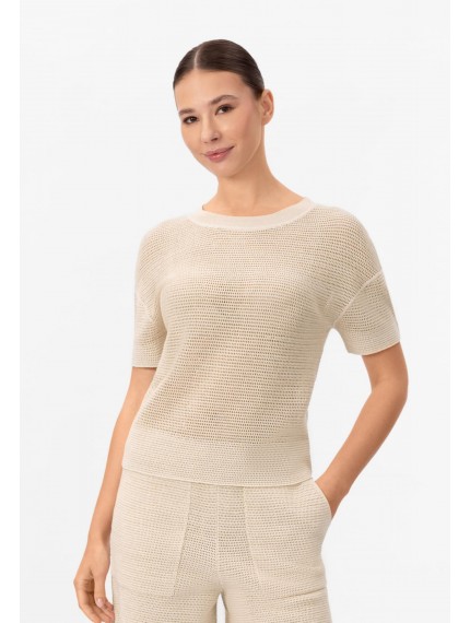Джемпер с коротким рукавом из шелка и хлопка. Круглый вырез горловины оформлен вязаной резинкой. Спущенная линия плеча. Длина до середины бедра. Джемпер выполнен вязкой «кроше».