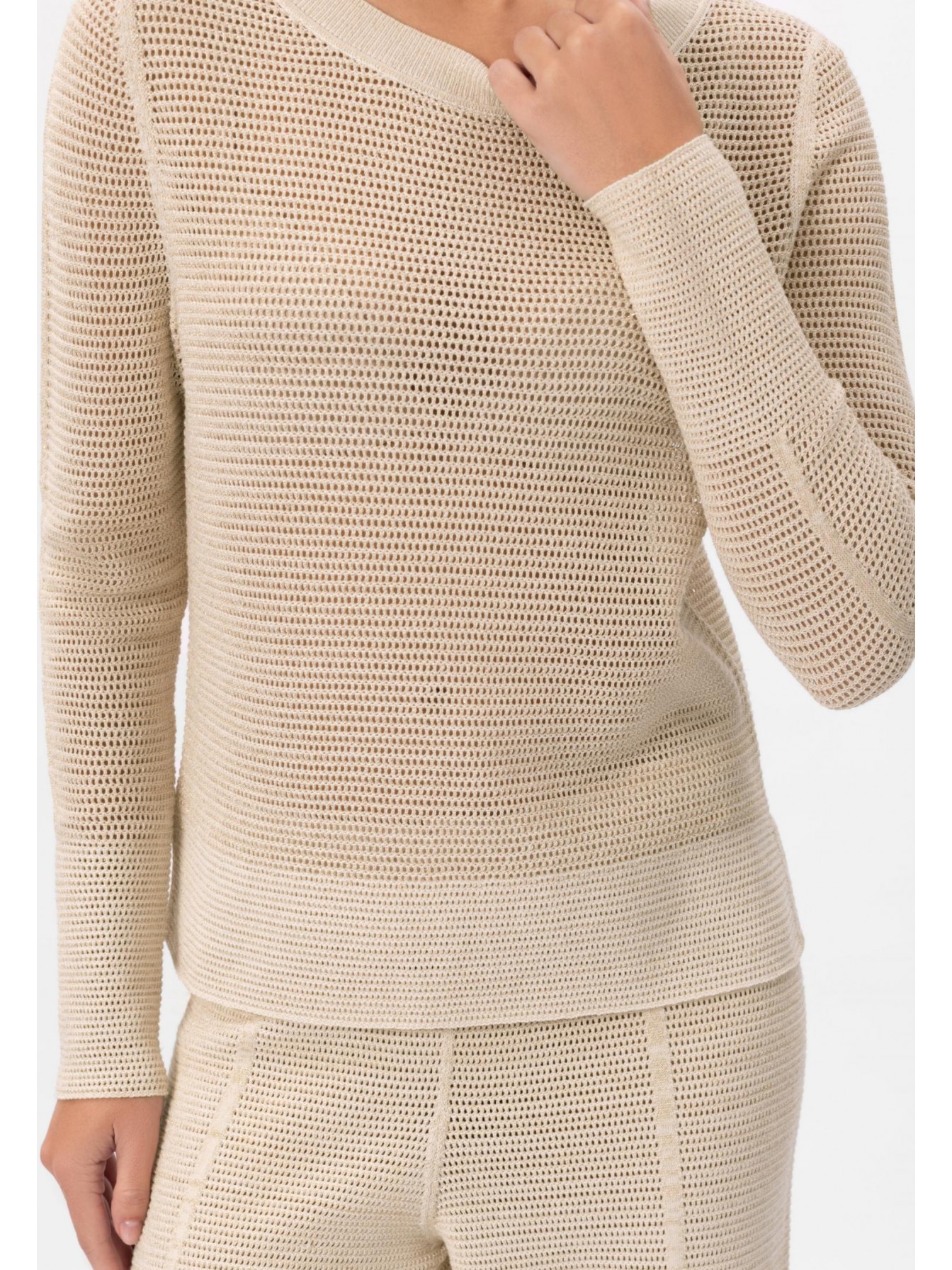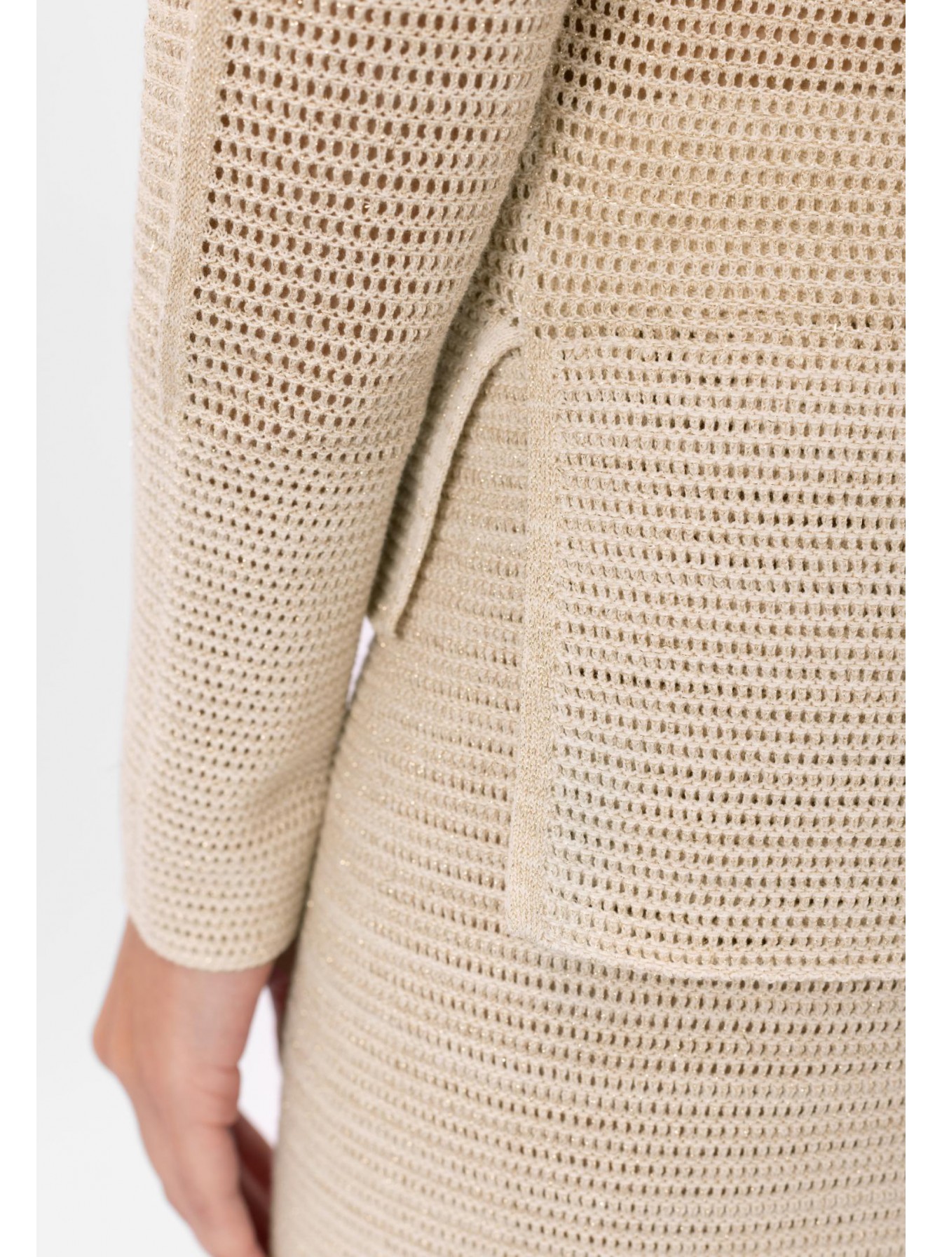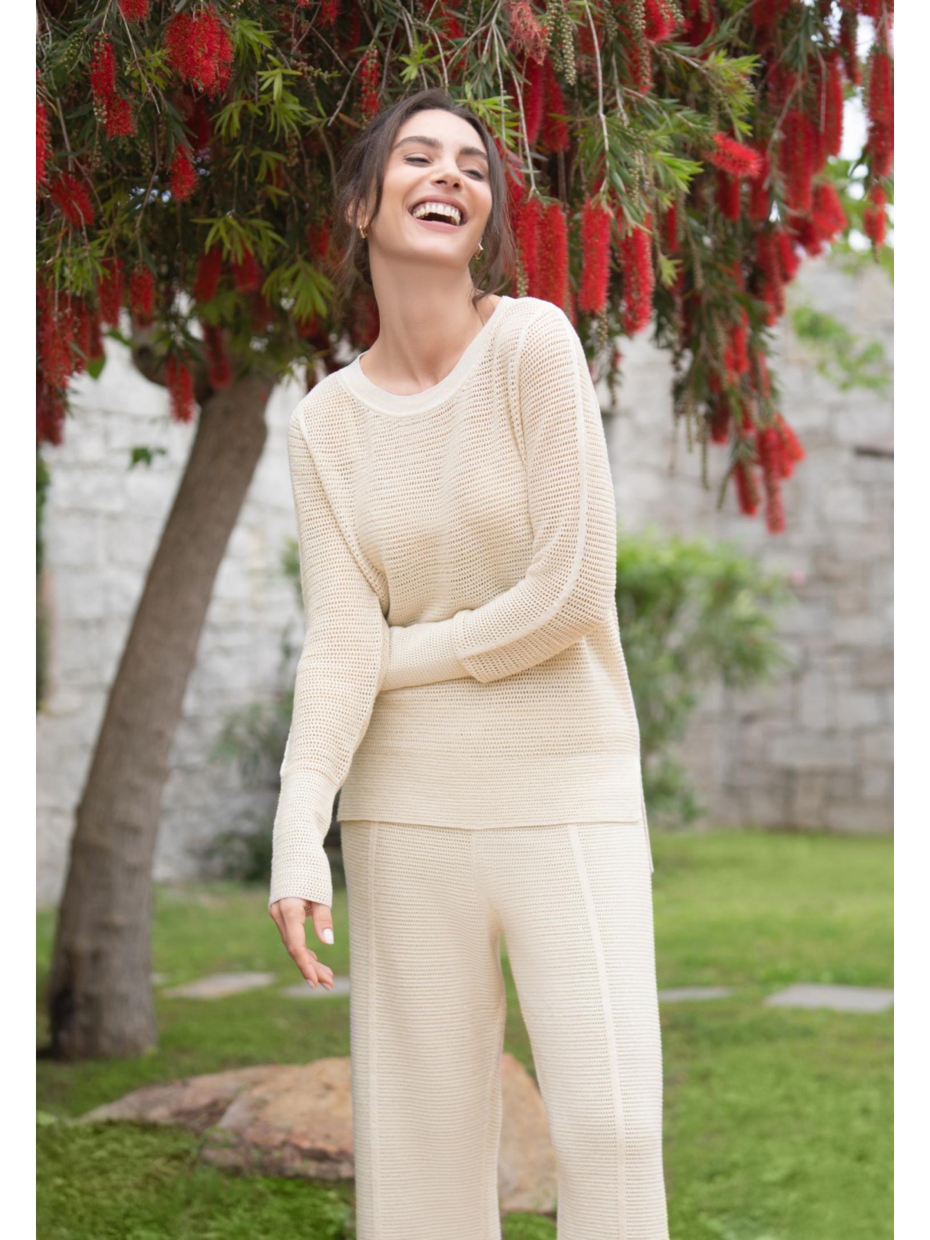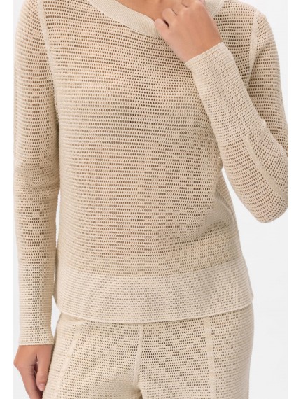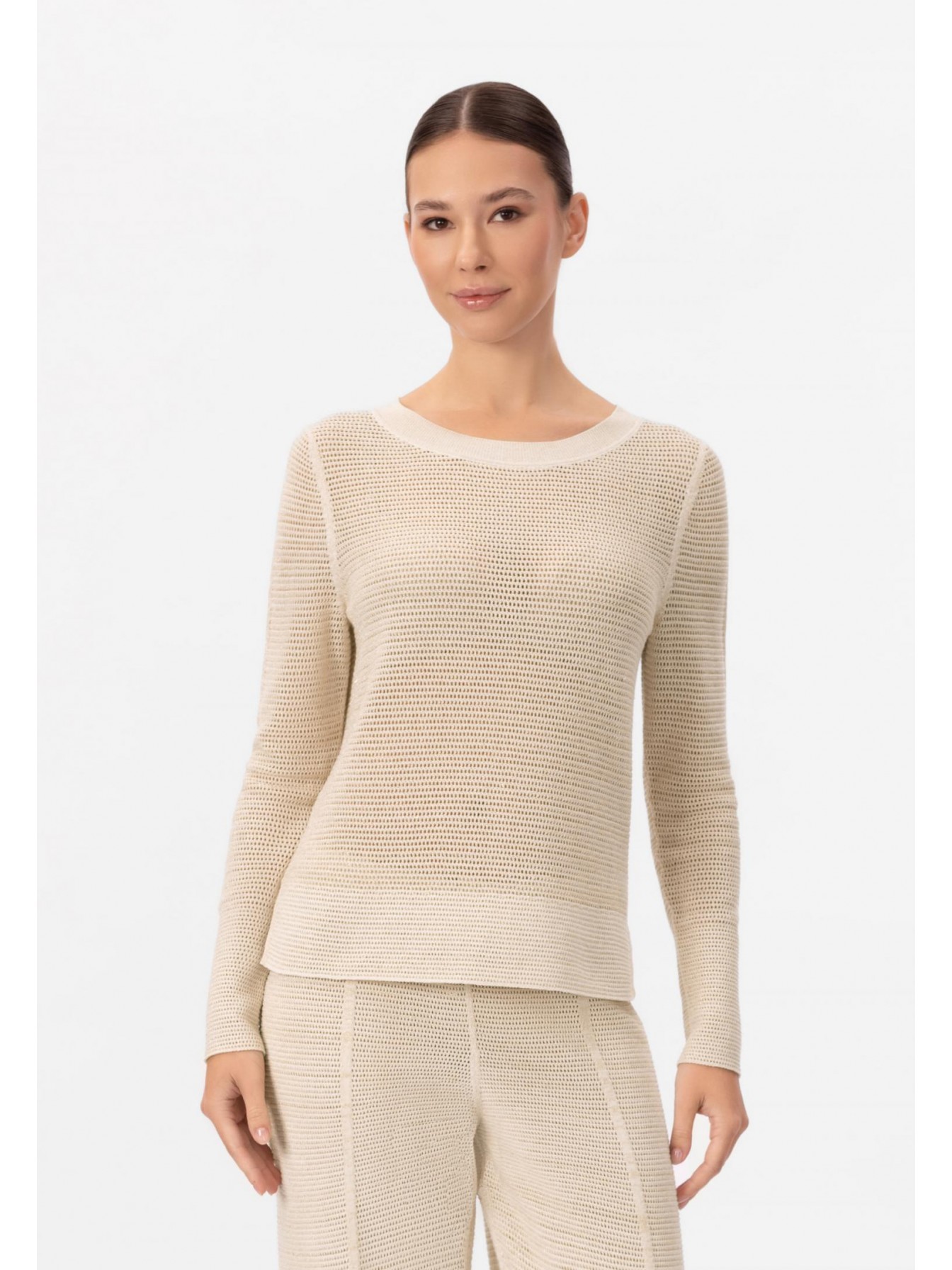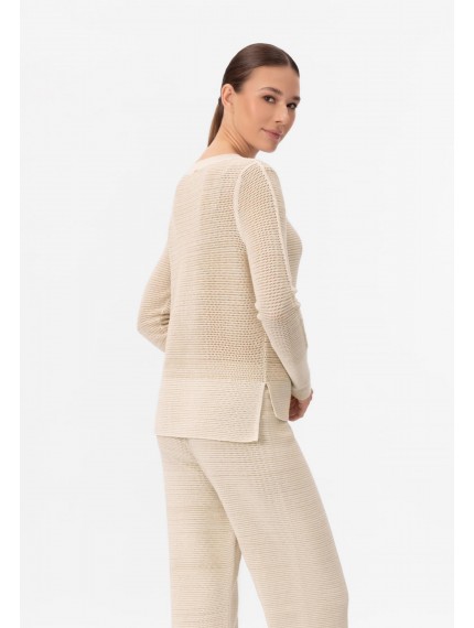 Джемпер с длинным рукавом. Круглый вырез горловины оформлен вязаной резинкой. Боковые разрезы и чуть удлинённая спинка создают изящный силуэт. На внешней части рукава вывязаны отделочные полосы.