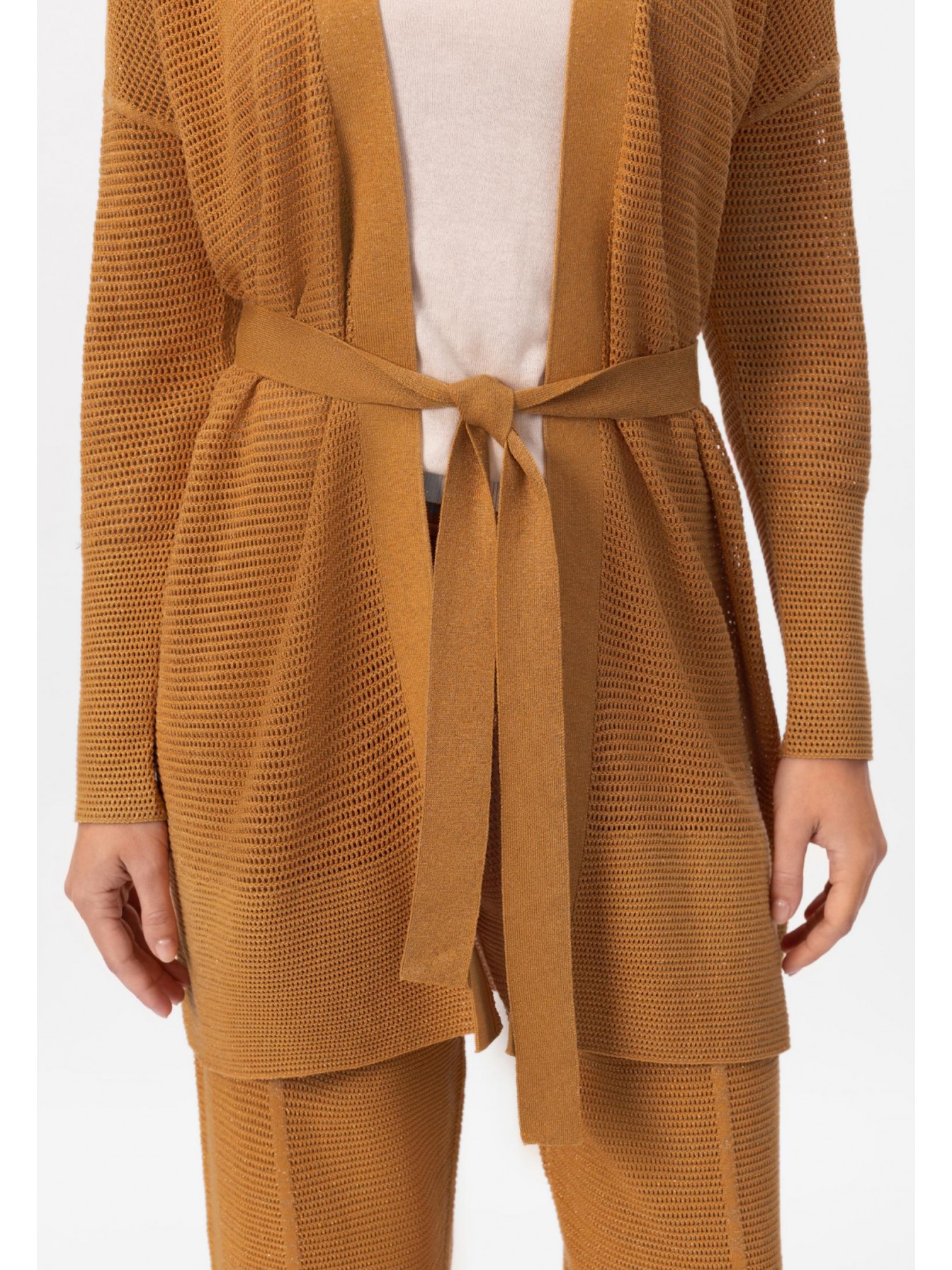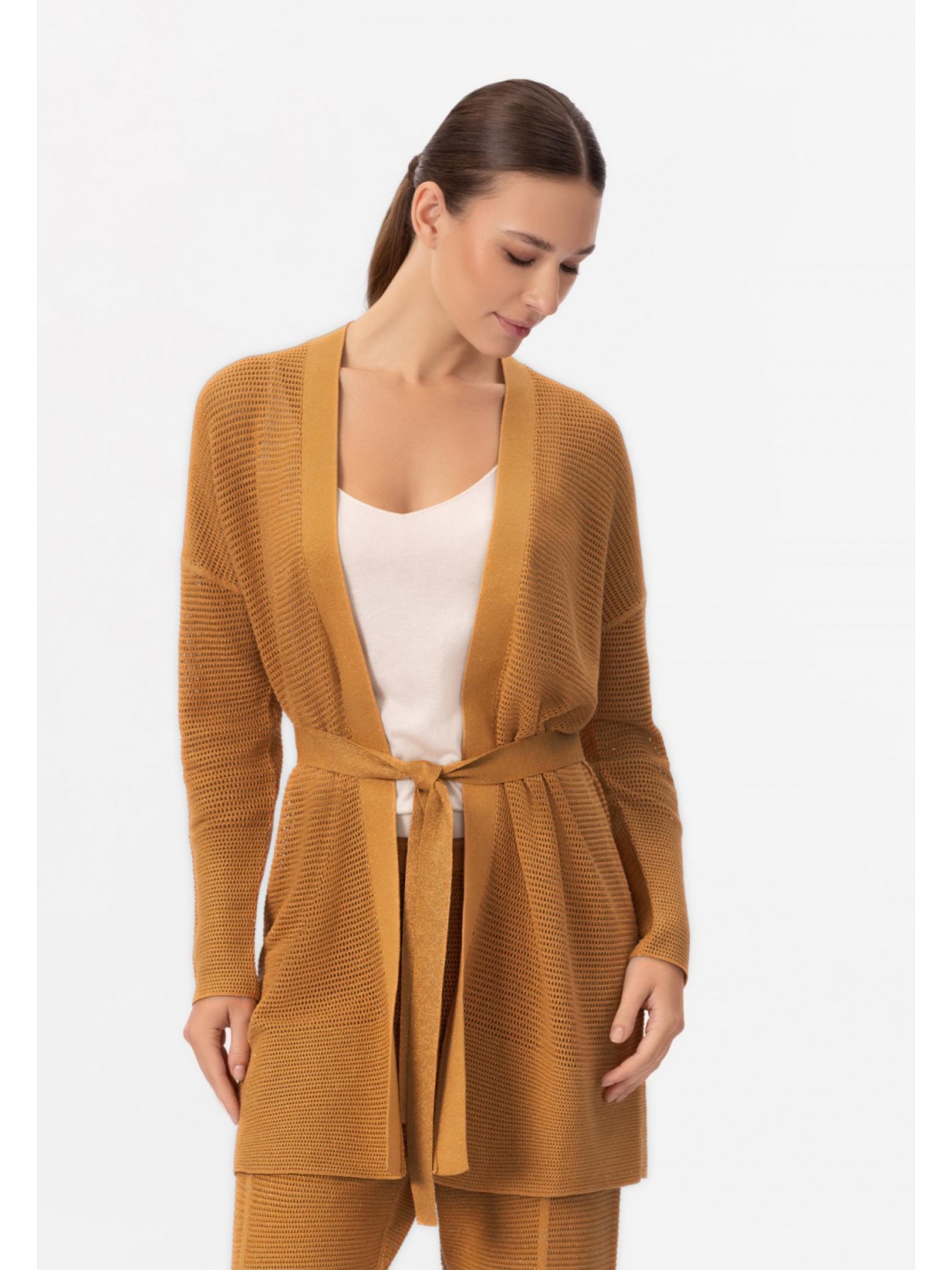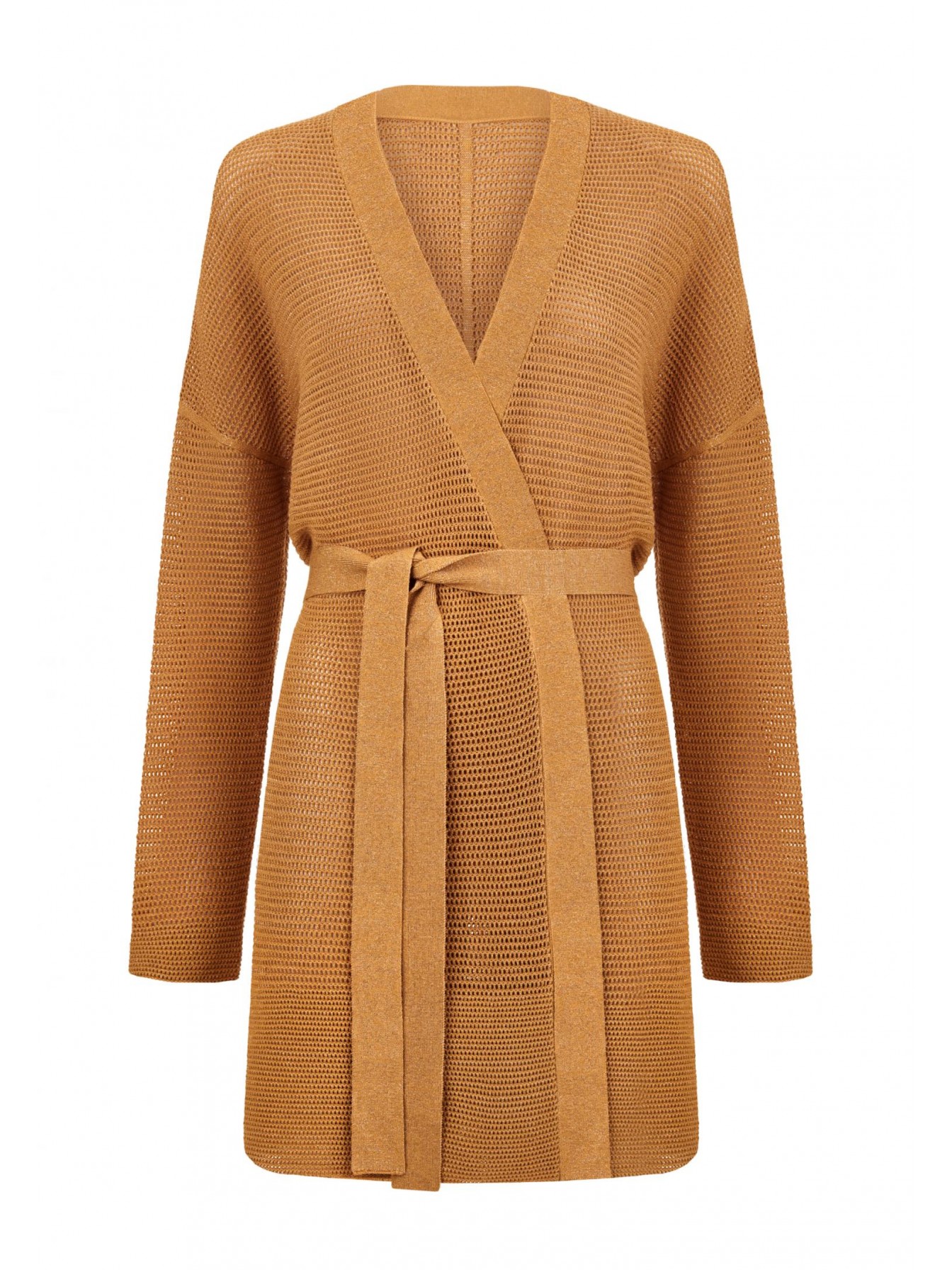 Кардиган свободного прямого кроя. Пояс в комплекте. Длинный втачной рукав. Спущенная линия плеча. Длина до середины бедра. Кардиган выполнен вязкой «кроше» из мягкой пряжи на основе шёлка и хлопка с деликатными вкраплениями тонкой металлизированной нити.