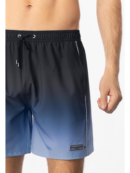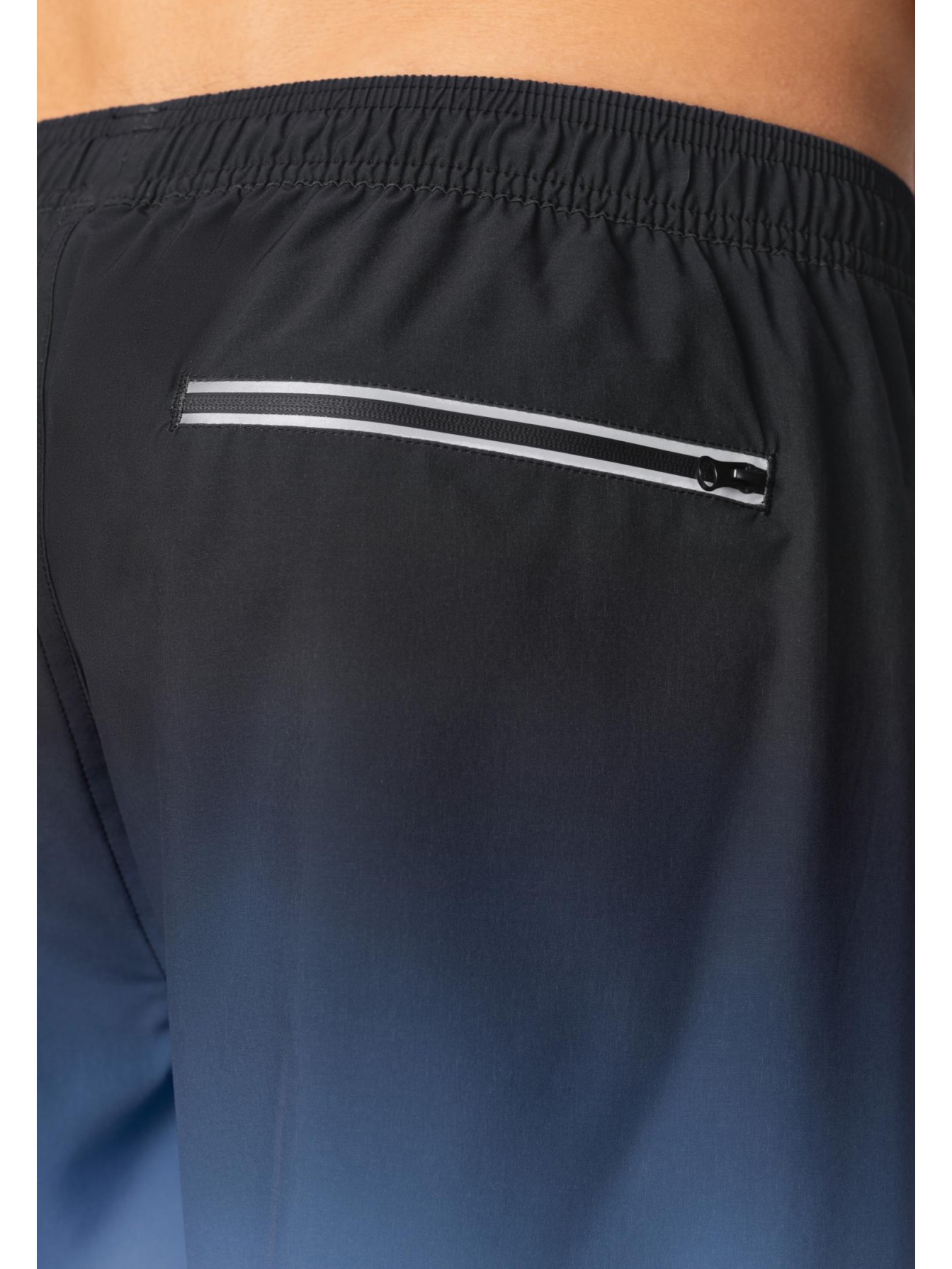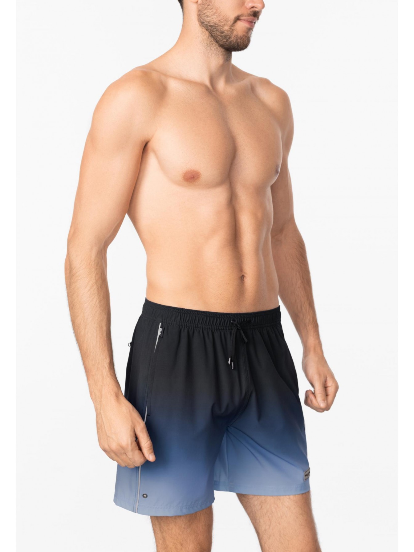 Мужские шорты свободного кроя. Выполнены из легкой быстросохнущей ткани. Длина до середины бедра, на задней детали карман на молнии. Боковые карманы. Пояс на резинке и шнуровке. Внутри вставка из мягкой сетки. Эффект омбре.