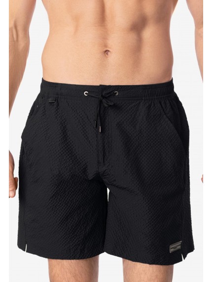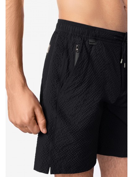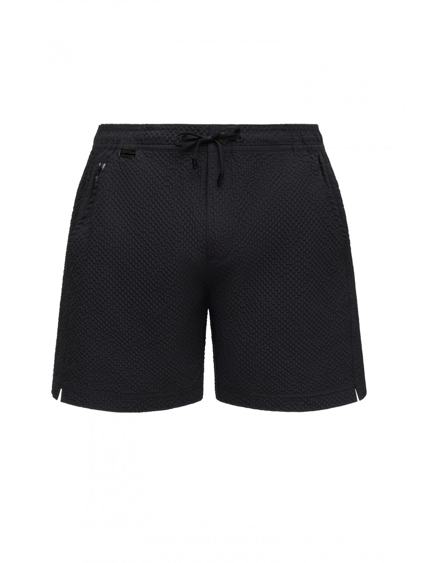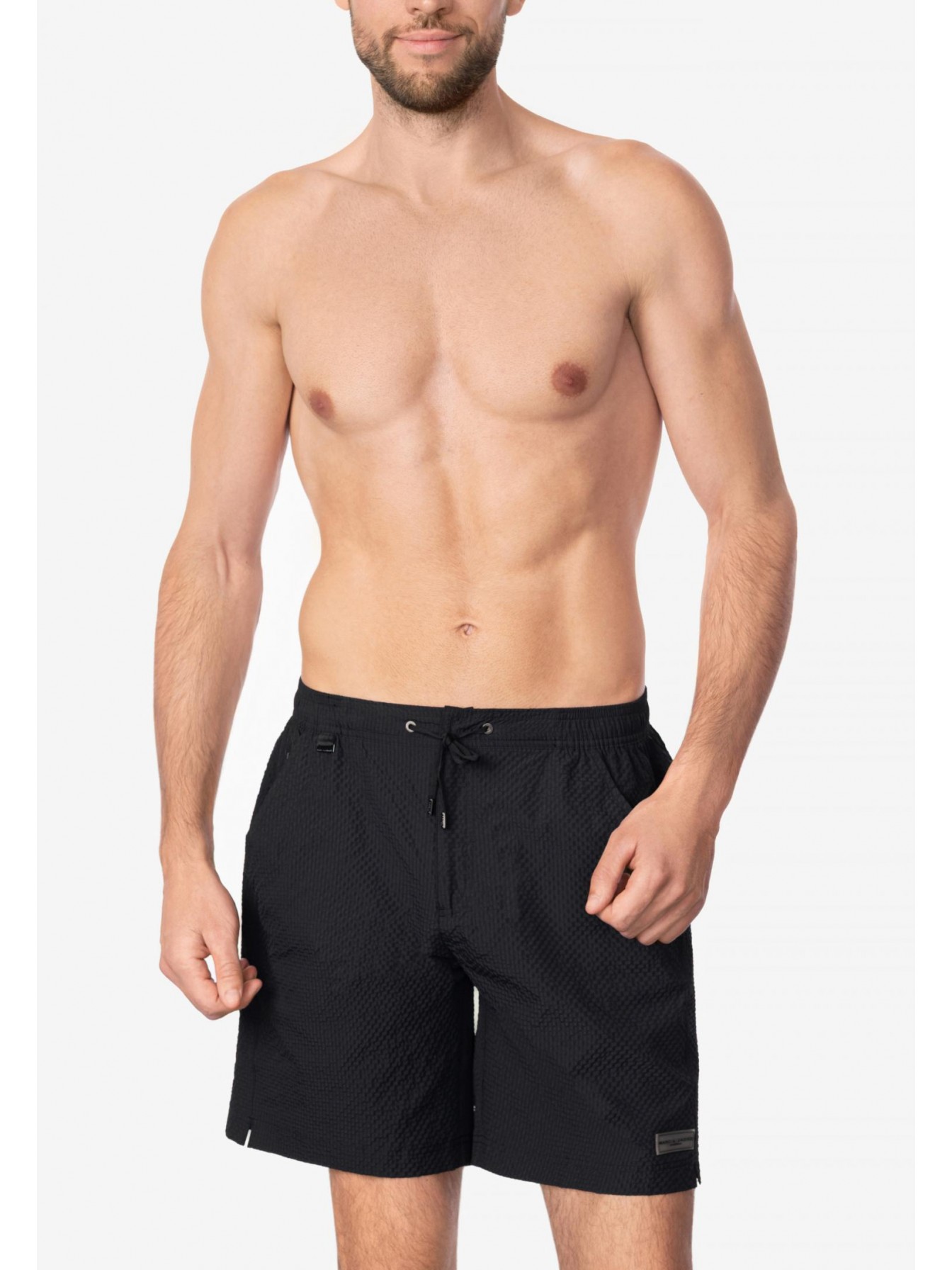Мужские шорты свободного кроя. Выполнены из фактурной быстросохнущей ткани. Длина до середины бедра, на задней детали карман на молнии. Боковые карманы, потайной карман на молнии внутри правого кармана. Пояс на резинке и шнуровке, ширинка застегивается на молнию. Внутри вставка из мягкой сетки.